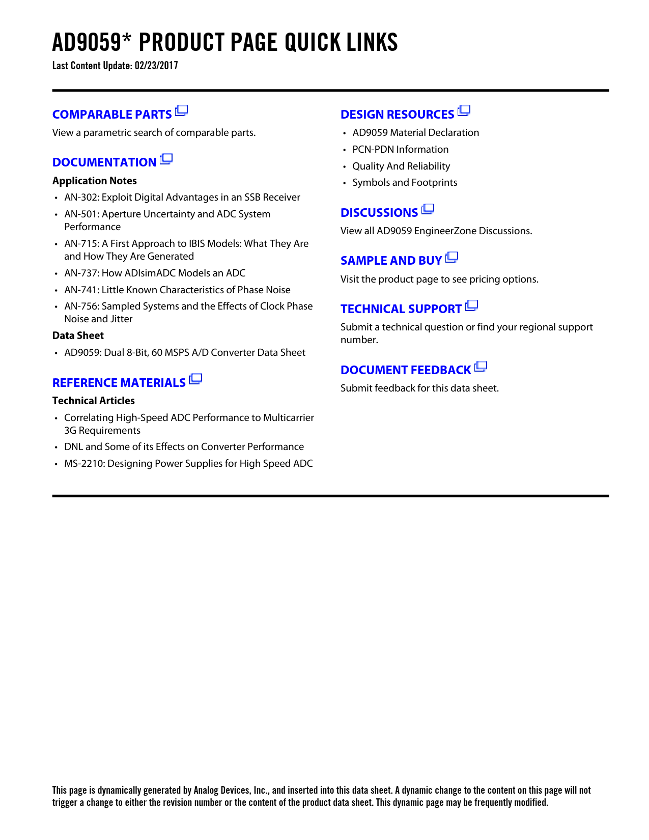 AD9059* PRODUCT PAGE QUICK LINKS Last Content Update: 02/23/2017COMPARABLE PARTSDESIGN RESOURCES View a parametric search of comparable parts. • AD9059 Material Declaration • PCN-PDN Information DOCUMENTATION • Quality And Reliability Application Notes • Symbols and Footprints • AN-302: Exploit Digital Advantages in an SSB Receiver • AN-501: Aperture Uncertainty and ADC System DISCUSSIONS Performance View all AD9059 EngineerZone Discussions. • AN-715: A First Approach to IBIS Models: What They Are and How They Are Generated SAMPLE AND BUY • AN-737: How ADIsimADC Models an ADC Visit the product page to see pricing options. • AN-741: Little Known Characteristics of Phase Noise • AN-756: Sampled Systems and the Effects of Clock Phase TECHNICAL SUPPORT Noise and Jitter Submit a technical question or find your regional support Data Sheet number. • AD9059: Dual 8-Bit, 60 MSPS A/D Converter Data Sheet DOCUMENT FEEDBACKREFERENCE MATERIALS Submit feedback for this data sheet. Technical Articles • Correlating High-Speed ADC Performance to Multicarrier 3G Requirements • DNL and Some of its Effects on Converter Performance • MS-2210: Designing Power Supplies for High Speed ADC This page is dynamically generated by Analog Devices, Inc., and inserted into this data sheet. A dynamic change to the content on this page will not trigger a change to either the revision number or the content of the product data sheet. This dynamic page may be frequently modified. Document Outline FEATURES APPLICATIONS PRODUCT DESCRIPTION FUNCTIONAL BLOCK DIAGRAM PIN CONFIGURATION SPECIFICATIONS EXPLANATION OF TEST LEVELS ABSOLUTE MAXIMUM RATINGS ORDERING GUIDE PIN CONFIGURATION PIN FUNCTION DESCRIPTIONS Typical Performance Characteristics THEORY OF OPERATION USING THE AD9059 Analog Inputs Voltage Reference Digital Logic (5 V/3 V Systems) Timing Power Dissipation Applications Evaluation Board OUTLINE DIMENSIONS Revision History