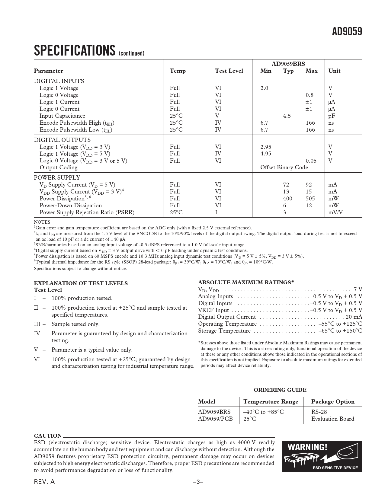 AD9059 SPECIFICATIONS (continued) AD9059BRS Parameter Temp Test Level Min Typ Max Unit EXPLANATION OF TEST LEVELS