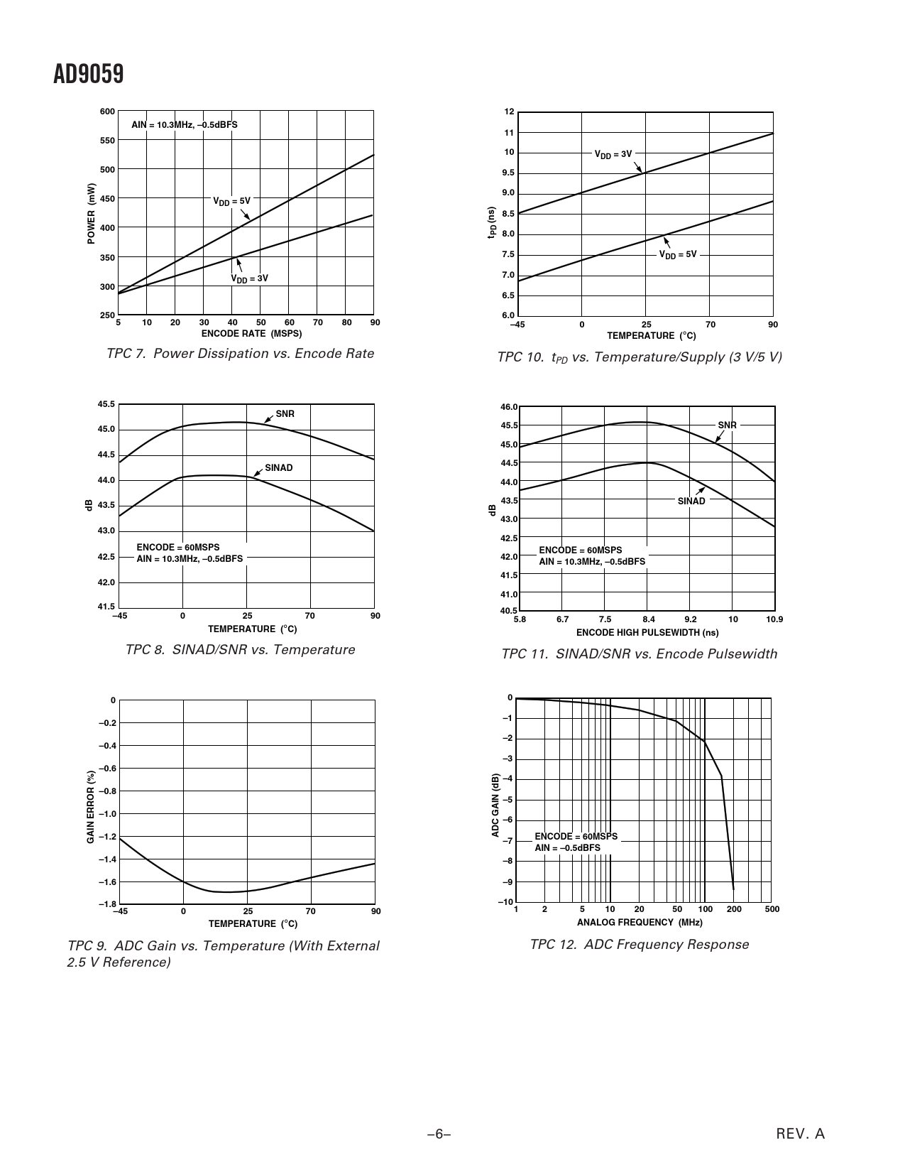 TPC 7. Power Dissipation vs. Encode Rate TPC 10. tPD vs. Temperature/Supply (3 V/5 V)