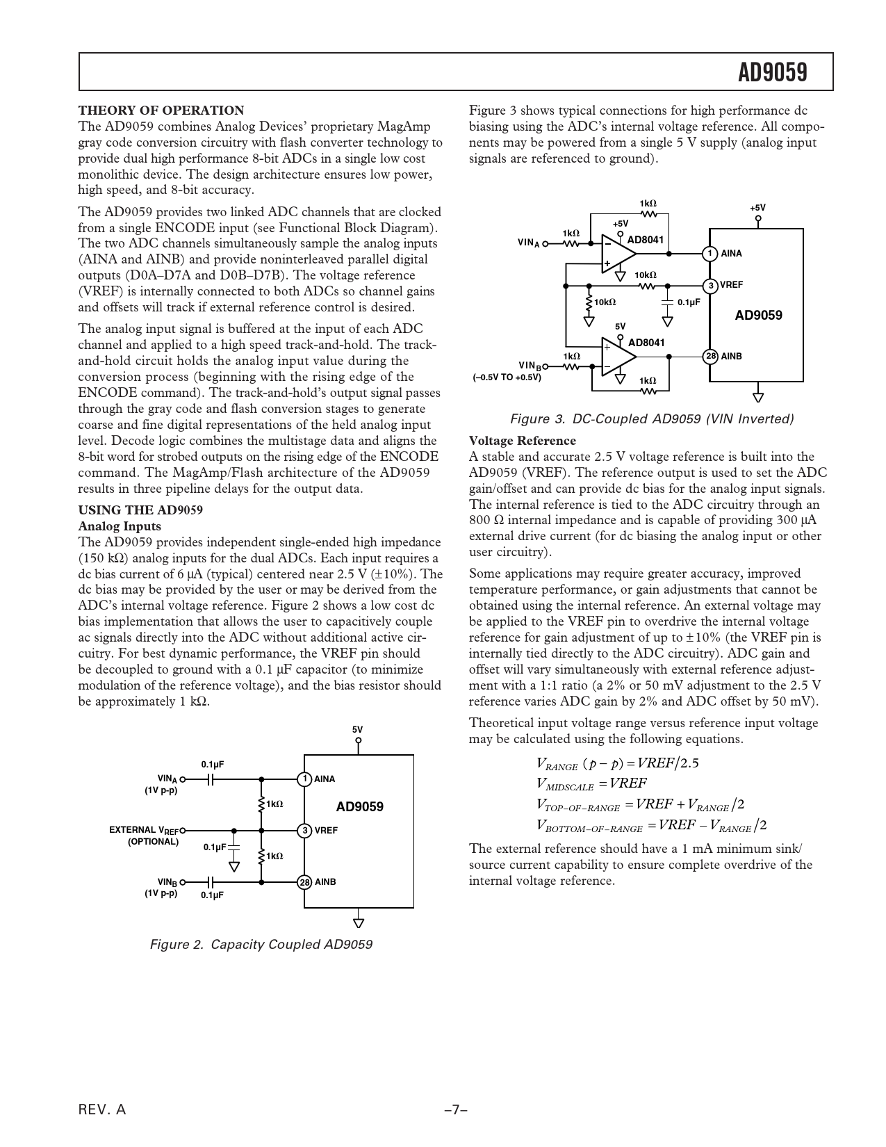 AD9059THEORY OF OPERATION Figure 3 shows typical connections for high performance dc The AD9059 combines Analog Devices’ proprietary MagAmp biasing using the ADC’s internal voltage reference. All compo- gray code conversion circuitry with flash converter technology to nents may be powered from a single 5 V supply (analog input provide dual high performance 8-bit ADCs in a single low cost signals are referenced to ground). monolithic device. The design architecture ensures low power, high speed, and 8-bit accuracy. 1k ⍀ The AD9059 provides two linked ADC channels that are clocked +5V from a single ENCODE input (see Functional Block Diagram). +5V1k ⍀ The two ADC channels simultaneously sample the analog inputs VINAD8041A1 (AINA and AINB) and provide noninterleaved parallel digital AINA outputs (D0A–D7A and D0B–D7B). The voltage reference 10k ⍀ 3 VREF (VREF) is internally connected to both ADCs so channel gains and offsets will track if external reference control is desired. 10k ⍀ 0.1µFAD9059 The analog input signal is buffered at the input of each ADC 5V channel and applied to a high speed track-and-hold. The track- AD8041 and-hold circuit holds the analog input value during the 1k ⍀ 28 AINBV I N B conversion process (beginning with the rising edge of the (–0.5V TO +0.5V)1k ⍀ ENCODE command). The track-and-hold’s output signal passes through the gray code and flash conversion stages to generate coarse and fine digital representations of the held analog input Figure 3. DC-Coupled AD9059 (VIN Inverted) level. Decode logic combines the multistage data and aligns the Voltage Reference 8-bit word for strobed outputs on the rising edge of the ENCODE A stable and accurate 2.5 V voltage reference is built into the command. The MagAmp/Flash architecture of the AD9059 AD9059 (VREF). The reference output is used to set the ADC results in three pipeline delays for the output data. gain/offset and can provide dc bias for the analog input signals. The internal reference is tied to the ADC circuitry through an USING THE AD9059 800 Ω internal impedance and is capable of providing 300 µA Analog Inputs The AD9059 provides independent single-ended high impedance external drive current (for dc biasing the analog input or other (150 kΩ) analog inputs for the dual ADCs. Each input requires a user circuitry). dc bias current of 6 µA (typical) centered near 2.5 V (±10%). The Some applications may require greater accuracy, improved dc bias may be provided by the user or may be derived from the temperature performance, or gain adjustments that cannot be ADC’s internal voltage reference. Figure 2 shows a low cost dc obtained using the internal reference. An external voltage may bias implementation that allows the user to capacitively couple be applied to the VREF pin to overdrive the internal voltage ac signals directly into the ADC without additional active cir- reference for gain adjustment of up to ± 10% (the VREF pin is cuitry. For best dynamic performance, the VREF pin should internally tied directly to the ADC circuitry). ADC gain and be decoupled to ground with a 0.1 µF capacitor (to minimize offset will vary simultaneously with external reference adjust- modulation of the reference voltage), and the bias resistor should ment with a 1:1 ratio (a 2% or 50 mV adjustment to the 2.5 V be approximately 1 kΩ. reference varies ADC gain by 2% and ADC offset by 50 mV). Theoretical input voltage range versus reference input voltage 5V may be calculated using the following equations. 0.1µF V ( p − p) = VREF . 2 5 RANGE VIN1AAINA V = VREF (1V p-p) MIDSCALE 1k ⍀ AD9059 V − − = VREF + V 2 TOP OF RANGE RANGE V − − = VREF – V 2 EXTERNAL V BOTTOM OF RANGE RANGE REF3 VREF(OPTIONAL)0.1µF The external reference should have a 1 mA minimum sink/ 1k ⍀ source current capability to ensure complete overdrive of the VIN28 AINB internal voltage reference. B(1V p-p)0.1µF Figure 2. Capacity Coupled AD9059 REV. A –7– Document Outline FEATURES APPLICATIONS PRODUCT DESCRIPTION FUNCTIONAL BLOCK DIAGRAM PIN CONFIGURATION SPECIFICATIONS EXPLANATION OF TEST LEVELS ABSOLUTE MAXIMUM RATINGS ORDERING GUIDE PIN CONFIGURATION PIN FUNCTION DESCRIPTIONS Typical Performance Characteristics THEORY OF OPERATION USING THE AD9059 Analog Inputs Voltage Reference Digital Logic (5 V/3 V Systems) Timing Power Dissipation Applications Evaluation Board OUTLINE DIMENSIONS Revision History