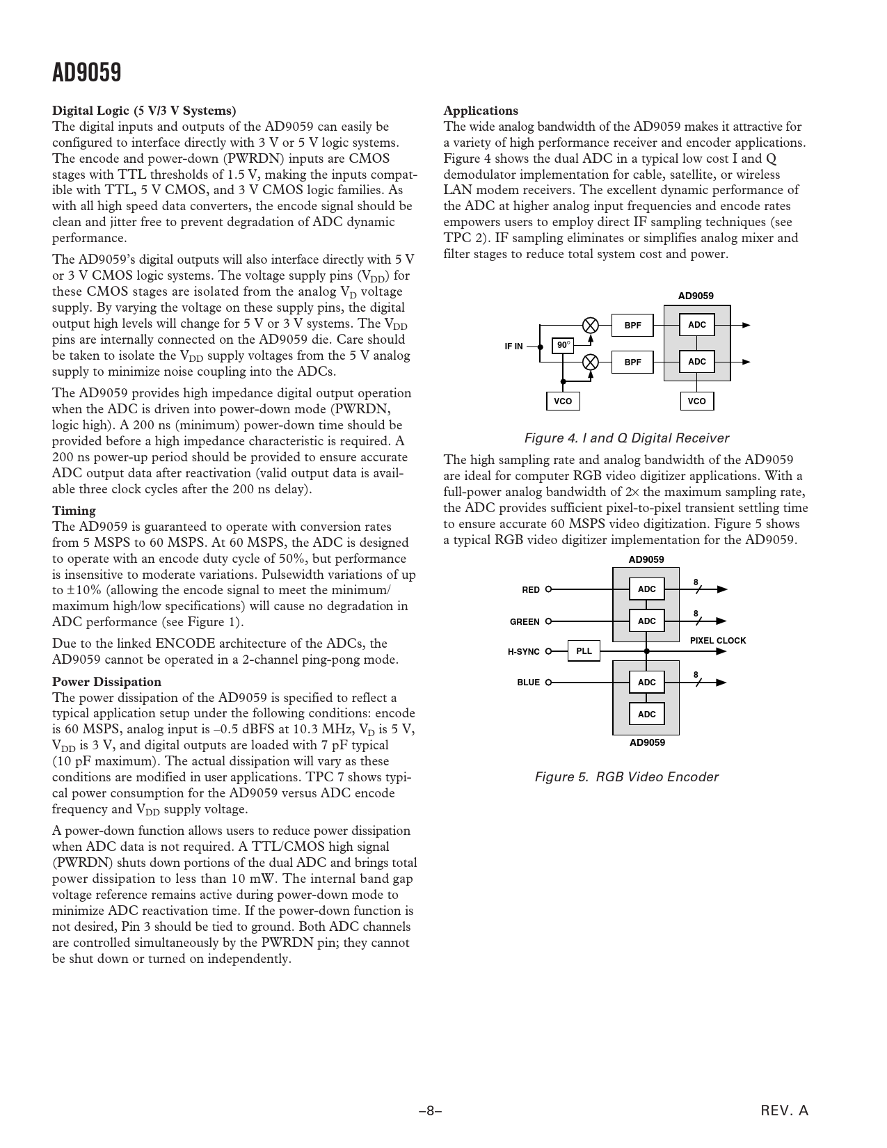 AD9059Digital Logic (5 V/3 V Systems)Applications The digital inputs and outputs of the AD9059 can easily be The wide analog bandwidth of the AD9059 makes it attractive for configured to interface directly with 3 V or 5 V logic systems. a variety of high performance receiver and encoder applications. The encode and power-down (PWRDN) inputs are CMOS Figure 4 shows the dual ADC in a typical low cost I and Q stages with TTL thresholds of 1.5 V, making the inputs compat- demodulator implementation for cable, satellite, or wireless ible with TTL, 5 V CMOS, and 3 V CMOS logic families. As LAN modem receivers. The excellent dynamic performance of with all high speed data converters, the encode signal should be the ADC at higher analog input frequencies and encode rates clean and jitter free to prevent degradation of ADC dynamic empowers users to employ direct IF sampling techniques (see performance. TPC 2). IF sampling eliminates or simplifies analog mixer and The AD9059’s digital outputs will also interface directly with 5 V filter stages to reduce total system cost and power. or 3 V CMOS logic systems. The voltage supply pins (VDD) for these CMOS stages are isolated from the analog VD voltage AD9059 supply. By varying the voltage on these supply pins, the digital output high levels will change for 5 V or 3 V systems. The VDD BPFADC pins are internally connected on the AD9059 die. Care should IF IN90 ° be taken to isolate the VDD supply voltages from the 5 V analog BPFADC supply to minimize noise coupling into the ADCs. The AD9059 provides high impedance digital output operation VCOVCO when the ADC is driven into power-down mode (PWRDN, logic high). A 200 ns (minimum) power-down time should be provided before a high impedance characteristic is required. A Figure 4. I and Q Digital Receiver 200 ns power-up period should be provided to ensure accurate The high sampling rate and analog bandwidth of the AD9059 ADC output data after reactivation (valid output data is avail- are ideal for computer RGB video digitizer applications. With a able three clock cycles after the 200 ns delay). full-power analog bandwidth of 2× the maximum sampling rate, Timing the ADC provides sufficient pixel-to-pixel transient settling time The AD9059 is guaranteed to operate with conversion rates to ensure accurate 60 MSPS video digitization. Figure 5 shows from 5 MSPS to 60 MSPS. At 60 MSPS, the ADC is designed a typical RGB video digitizer implementation for the AD9059. to operate with an encode duty cycle of 50%, but performance AD9059 is insensitive to moderate variations. Pulsewidth variations of up 8 to ± 10% (allowing the encode signal to meet the minimum/ REDADC maximum high/low specifications) will cause no degradation in 8 ADC performance (see Figure 1). GREENADC Due to the linked ENCODE architecture of the ADCs, the PIXEL CLOCKH-SYNCPLL AD9059 cannot be operated in a 2-channel ping-pong mode. 8Power DissipationBLUEADC The power dissipation of the AD9059 is specified to reflect a typical application setup under the following conditions: encode ADC is 60 MSPS, analog input is –0.5 dBFS at 10.3 MHz, VD is 5 V, V AD9059 DD is 3 V, and digital outputs are loaded with 7 pF typical (10 pF maximum). The actual dissipation will vary as these conditions are modified in user applications. TPC 7 shows typi- Figure 5. RGB Video Encoder cal power consumption for the AD9059 versus ADC encode frequency and VDD supply voltage. A power-down function allows users to reduce power dissipation when ADC data is not required. A TTL/CMOS high signal (PWRDN) shuts down portions of the dual ADC and brings total power dissipation to less than 10 mW. The internal band gap voltage reference remains active during power-down mode to minimize ADC reactivation time. If the power-down function is not desired, Pin 3 should be tied to ground. Both ADC channels are controlled simultaneously by the PWRDN pin; they cannot be shut down or turned on independently. –8– REV. A Document Outline FEATURES APPLICATIONS PRODUCT DESCRIPTION FUNCTIONAL BLOCK DIAGRAM PIN CONFIGURATION SPECIFICATIONS EXPLANATION OF TEST LEVELS ABSOLUTE MAXIMUM RATINGS ORDERING GUIDE PIN CONFIGURATION PIN FUNCTION DESCRIPTIONS Typical Performance Characteristics THEORY OF OPERATION USING THE AD9059 Analog Inputs Voltage Reference Digital Logic (5 V/3 V Systems) Timing Power Dissipation Applications Evaluation Board OUTLINE DIMENSIONS Revision History