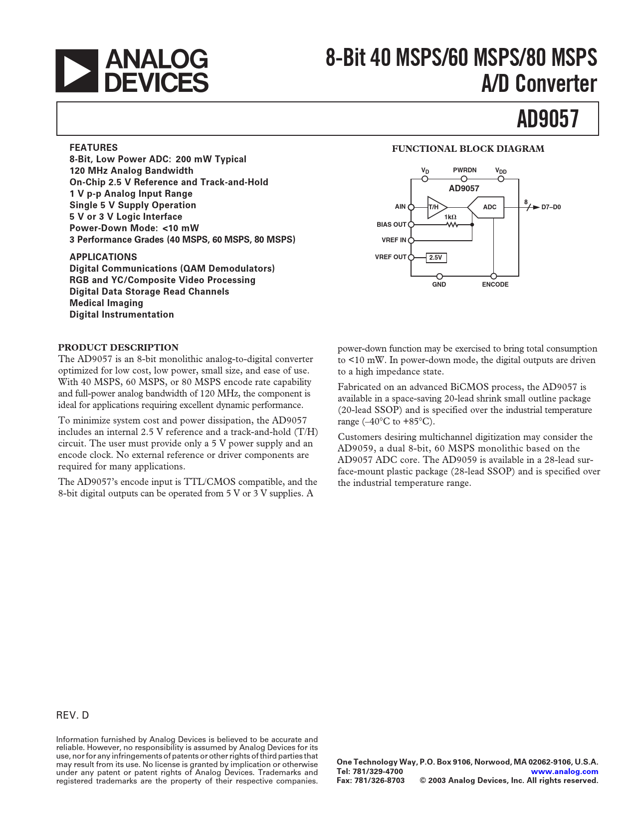 BIAS OUT Power-Down Mode: <10 mW 3 Performance Grades (40 MSPS, 60 MSPS, 80 MSPS) VREF IN VREF OUT APPLICATIONS 2.5V Digital Communications (QAM Demodulators) RGB and YC/Composite Video Processing GND ENCODE Digital Data Storage Read Channels Medical Imaging Digital Instrumentation PRODUCT DESCRIPTION