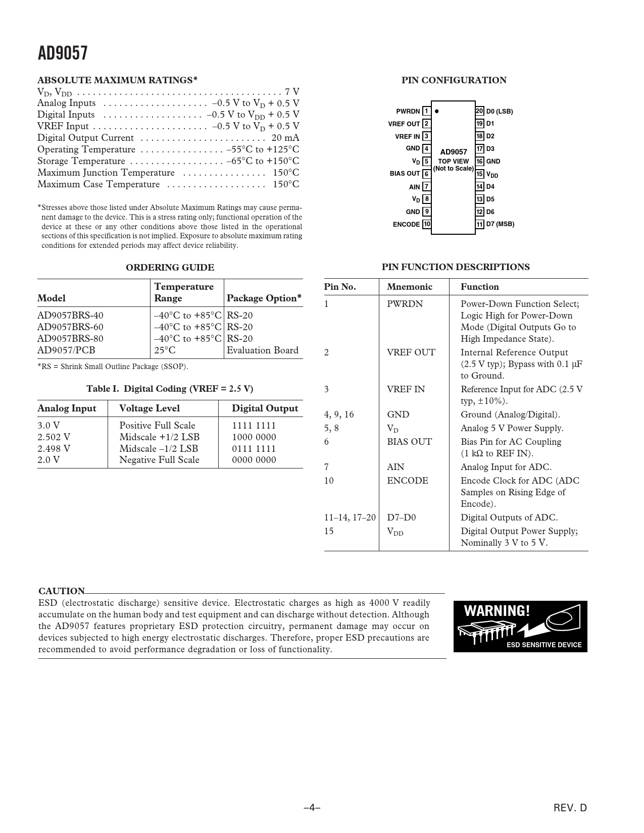 AD9057ABSOLUTE MAXIMUM RATINGS*PIN CONFIGURATION VD, VDD . 7 V Analog Inputs . –0.5 V to VD + 0.5 V Digital Inputs . –0.5 V to V PWRDN 120 D0 (LSB) DD + 0.5 V VREF Input . –0.5 V to V VREF OUT 219 D1 D + 0.5 V Digital Output Current . 20 mA VREF IN 318 D2 Operating Temperature . –55∞C to +125∞C GND 417 D3AD9057 Storage Temperature . –65∞C to +150∞C V5DTOP VIEW16 GND Maximum Junction Temperature . 150∞C (Not to Scale)BIAS OUT 615 VDD Maximum Case Temperature . 150∞C AIN 714 D4V8D13 D5 *Stresses above those listed under Absolute Maximum Ratings may cause perma- GND 912 D6 nent damage to the device. This is a stress rating only; functional operation of the device at these or any other conditions above those listed in the operational ENCODE 1011 D7 (MSB) sections of this specification is not implied. Exposure to absolute maximum rating conditions for extended periods may affect device reliability. ORDERING GUIDEPIN FUNCTION DESCRIPTIONSTemperaturePin No.MnemonicFunctionModelRangePackage Option* 1 PWRDN Power-Down Function Select; AD9057BRS-40 –40∞C to +85∞C RS-20 Logic High for Power-Down AD9057BRS-60 –40∞C to +85∞C RS-20 Mode (Digital Outputs Go to AD9057BRS-80 –40∞C to +85∞C RS-20 High Impedance State). AD9057/PCB 25∞C Evaluation Board 2 VREF OUT Internal Reference Output *RS = Shrink Small Outline Package (SSOP). (2.5 V typ); Bypass with 0.1 mF to Ground. Table I. Digital Coding (VREF = 2.5 V) 3 VREF IN Reference Input for ADC (2.5 V typ, ± 10%). Analog InputVoltage LevelDigital Output 4, 9, 16 GND Ground (Analog/Digital). 3.0 V Positive Full Scale 1111 1111 5, 8 VD Analog 5 V Power Supply. 2.502 V Midscale +1/2 LSB 1000 0000 6 BIAS OUT Bias Pin for AC Coupling 2.498 V Midscale –1/2 LSB 0111 1111 (1 kW to REF IN). 2.0 V Negative Full Scale 0000 0000 7 AIN Analog Input for ADC. 10 ENCODE Encode Clock for ADC (ADC Samples on Rising Edge of Encode). 11–14, 17–20 D7–D0 Digital Outputs of ADC. 15 VDD Digital Output Power Supply; Nominally 3 V to 5 V. CAUTION ESD (electrostatic discharge) sensitive device. Electrostatic charges as high as 4000 V readily accumulate on the human body and test equipment and can discharge without detection. Although WARNING! the AD9057 features proprietary ESD protection circuitry, permanent damage may occur on devices subjected to high energy electrostatic discharges. Therefore, proper ESD precautions are ESD SENSITIVE DEVICE recommended to avoid performance degradation or loss of functionality. –4– REV. D Document Outline FEATURES APPLICATIONS PRODUCT DESCRIPTION FUNCTIONAL BLOCK DIAGRAM SPECIFICATIONS ABSOLUTE MAXIMUM RATINGS ORDERING GUIDE PIN CONFIGURATION PIN FUNCTION DESCRIPTIONS Typical Performance Characteristics THEORY OF OPERATION USING THE AD9057 Analog Inputs Voltage Reference Digital Logic (5 V/3 V Systems) Timing Power Dissipation APPLICATIONS Evaluation Board OUTLINE DIMENSIONS Revision History