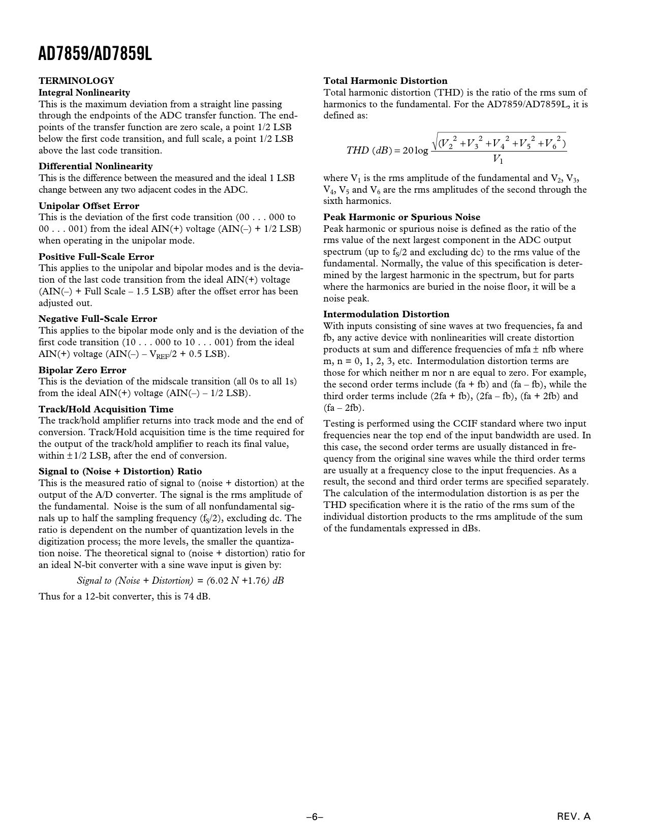 AD7859/AD7859LTERMINOLOGYTotal Harmonic DistortionIntegral Nonlinearity Total harmonic distortion (THD) is the ratio of the rms sum of This is the maximum deviation from a straight line passing harmonics to the fundamental. For the AD7859/AD7859L, it is through the endpoints of the ADC transfer function. The end- defined as: points of the transfer function are zero scale, a point 1/2 LSB 2 2 2 2 2 below the first code transition, and full scale, a point 1/2 LSB (V +V +V +V +V ) above the last code transition. THD (dB) = 20 log 2 3 4 5 6 V1 Differential Nonlinearity This is the difference between the measured and the ideal 1 LSB where V1 is the rms amplitude of the fundamental and V2, V3, change between any two adjacent codes in the ADC. V4, V5 and V6 are the rms amplitudes of the second through the sixth harmonics. Unipolar Offset Error This is the deviation of the first code transition (00 . 000 to Peak Harmonic or Spurious Noise 00 . 001) from the ideal AIN(+) voltage (AIN(–) + 1/2 LSB) Peak harmonic or spurious noise is defined as the ratio of the when operating in the unipolar mode. rms value of the next largest component in the ADC output spectrum (up to fS/2 and excluding dc) to the rms value of the Positive Full-Scale Error fundamental. Normally, the value of this specification is deter- This applies to the unipolar and bipolar modes and is the devia- mined by the largest harmonic in the spectrum, but for parts tion of the last code transition from the ideal AIN(+) voltage where the harmonics are buried in the noise floor, it will be a (AIN(–) + Full Scale – 1.5 LSB) after the offset error has been noise peak. adjusted out. Intermodulation DistortionNegative Full-Scale Error With inputs consisting of sine waves at two frequencies, fa and This applies to the bipolar mode only and is the deviation of the fb, any active device with nonlinearities will create distortion first code transition (10 . 000 to 10 . 001) from the ideal products at sum and difference frequencies of mfa ± nfb where AIN(+) voltage (AIN(–) – VREF/2 + 0.5 LSB). m, n = 0, 1, 2, 3, etc. Intermodulation distortion terms are Bipolar Zero Error those for which neither m nor n are equal to zero. For example, This is the deviation of the midscale transition (all 0s to all 1s) the second order terms include (fa + fb) and (fa – fb), while the from the ideal AIN(+) voltage (AIN(–) – 1/2 LSB). third order terms include (2fa + fb), (2fa – fb), (fa + 2fb) and Track/Hold Acquisition Time (fa – 2fb). The track/hold amplifier returns into track mode and the end of Testing is performed using the CCIF standard where two input conversion. Track/Hold acquisition time is the time required for frequencies near the top end of the input bandwidth are used. In the output of the track/hold amplifier to reach its final value, this case, the second order terms are usually distanced in fre- within ± 1/2 LSB, after the end of conversion. quency from the original sine waves while the third order terms Signal to (Noise + Distortion) Ratio are usually at a frequency close to the input frequencies. As a This is the measured ratio of signal to (noise + distortion) at the result, the second and third order terms are specified separately. output of the A/D converter. The signal is the rms amplitude of The calculation of the intermodulation distortion is as per the the fundamental. Noise is the sum of all nonfundamental sig- THD specification where it is the ratio of the rms sum of the nals up to half the sampling frequency (f individual distortion products to the rms amplitude of the sum S/2), excluding dc. The ratio is dependent on the number of quantization levels in the of the fundamentals expressed in dBs. digitization process; the more levels, the smaller the quantiza- tion noise. The theoretical signal to (noise + distortion) ratio for an ideal N-bit converter with a sine wave input is given by: Signal to (Noise + Distortion) = (6.02 N +1.76) dB Thus for a 12-bit converter, this is 74 dB. –6– REV. A