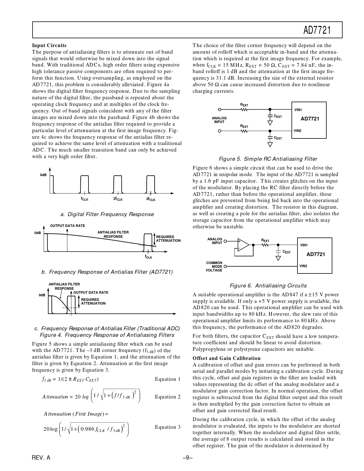 AD7721Input Circuits The choice of the filter corner frequency will depend on the The purpose of antialiasing filters is to attenuate out of band amount of rolloff which is acceptable in-band and the attenua- signals that would otherwise be mixed down into the signal tion which is required at the first image frequency. For example, band. With traditional ADCs, high order filters using expensive when fCLK = 15 MHz, REXT = 50 Ω, CEXT = 7.84 nF, the in- high tolerance passive components are often required to per- band rolloff is 1 dB and the attenuation at the first image fre- form this function. Using oversampling, as employed on the quency is 31.1 dB. Increasing the size of the external resistor AD7721, this problem is considerably alleviated. Figure 4a above 50 Ω can cause increased distortion due to nonlinear shows the digital filter frequency response. Due to the sampling charging currents. nature of the digital filter, the passband is repeated about the operating clock frequency and at multiples of the clock fre- REXT quency. Out of band signals coincident with any of the filter VIN1 images are mixed down into the passband. Figure 4b shows the CEXTANALOGAD7721 frequency response of the antialias filter required to provide a INPUTREXT particular level of attenuation at the first image frequency. Fig- VIN2 ure 4c shows the frequency response of the antialias filter re- CEXT quired to achieve the same level of attenuation with a traditional ADC. The much smaller transition band can only be achieved with a very high order filter. Figure 5. Simple RC Antialiasing Filter Figure 6 shows a simple circuit that can be used to drive the 0dB AD7721 in unipolar mode. The input of the AD7721 is sampled by a 1.6 pF input capacitor. This creates glitches on the input of the modulator. By placing the RC filter directly before the AD7721, rather than before the operational amplifier, these fCLK2fCLK3fCLK glitches are prevented from being fed back into the operational amplifier and creating distortion. The resistor in this diagram, a. Digital Filter Frequency Response as well as creating a pole for the antialias filter, also isolates the storage capacitor from the operational amplifier which may OUTPUT DATA RATE otherwise be unstable. 0dBANTIALIAS FILTERRESPONSEREQUIRED ATTENUATIONANALOGREXTINPUTVIN1CEXTAD7721fCLKCOMMONMODEVIN2 b. Frequency Response of Antialias Filter (AD7721) VOLTAGEANTIALIAS FILTER Figure 6. Antialiasing Circuits RESPONSEOUTPUT DATA RATE0dB A suitable operational amplifier is the AD847 if a ± 15 V power REQUIRED supply is available. If only a +5 V power supply is available, the ATTENUATION AD820 can be used. This operational amplifier can be used with input bandwidths up to 80 kHz. However, the slew rate of this operational amplifier limits its performance to 80 kHz. Above c. Frequency Response of Antialias Filter (Traditional ADC) this frequency, the performance of the AD820 degrades. Figure 4. Frequency Response of Antialiasing Filters For both filters, the capacitor CEXT should have a low tempera- Figure 5 shows a simple antialiasing filter which can be used ture coefficient and should be linear to avoid distortion. with the AD7721. The –3 dB corner frequency (f Polypropylene or polystyrene capacitors are suitable. 3 dB) of the antialias filter is given by Equation 1, and the attenuation of the Offset and Gain Calibration filter is given by Equation 2. Attenuation at the first image A calibration of offset and gain errors can be performed in both frequency is given by Equation 3. serial and parallel modes by initiating a calibration cycle. During f this cycle, offset and gain registers in the filter are loaded with 3 dB = 1/(2 π REXT CEXT) Equation 1 values representing the dc offset of the analog modulator and a modulator gain correction factor. In normal operation, the offset Attenuation = 20 log 1 / 1 + ( f / f )2 3 dB Equation 2 register is subtracted from the digital filter output and this result is then multiplied by the gain correction factor to obtain an offset and gain corrected final result. Attenuation (First Image) = During the calibration cycle, in which the offset of the analog modulator is evaluated, the inputs to the modulator are shorted 20log 1/ 1+ ( 0.986 f )2 CLK / f 3 dB Equation 3 together internally. When the modulator and digital filter settle, the average of 8 output results is calculated and stored in the offset register. The gain of the modulator is determined by REV. A –9–