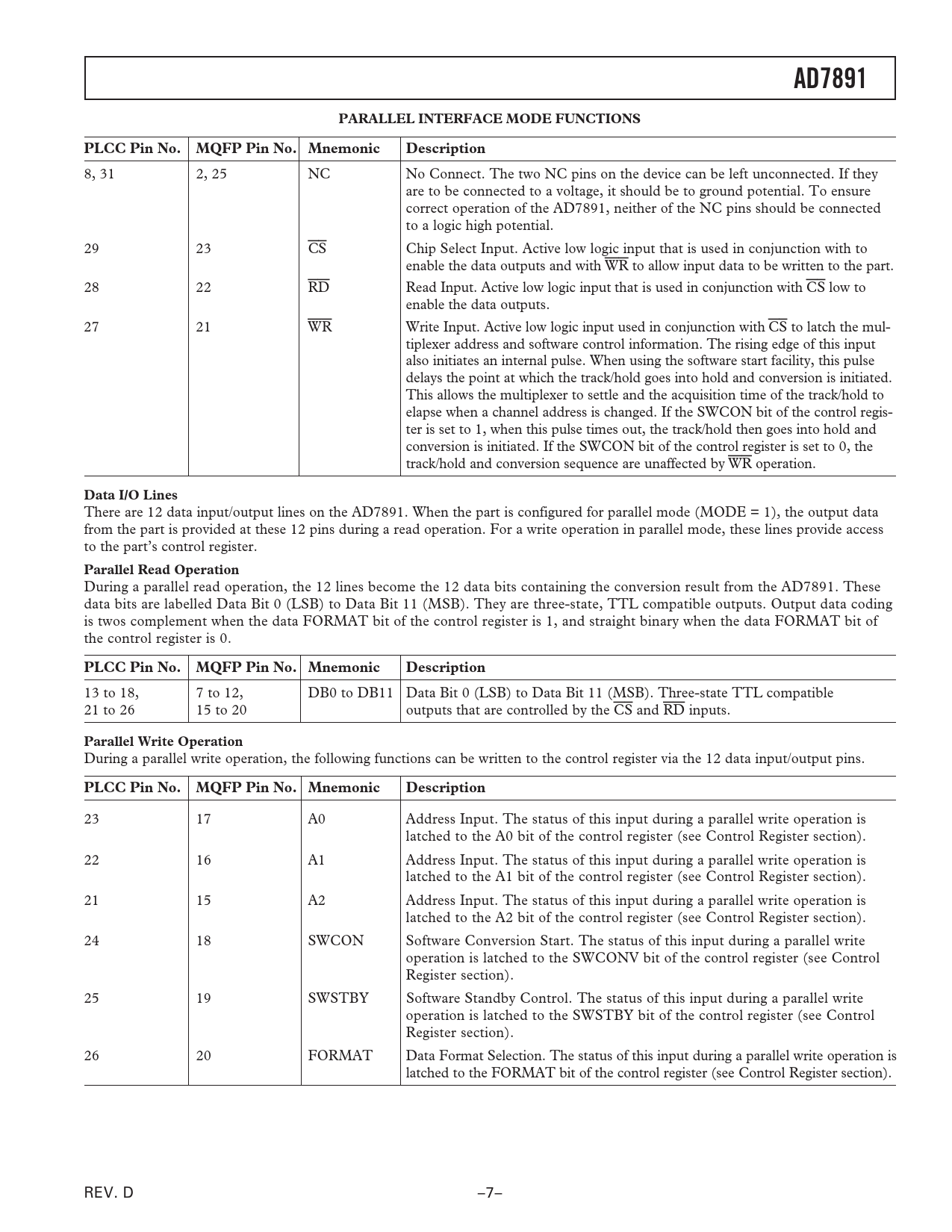AD7891 PARALLEL INTERFACE MODE FUNCTIONS PLCC Pin No. MQFP Pin No. Mnemonic Description