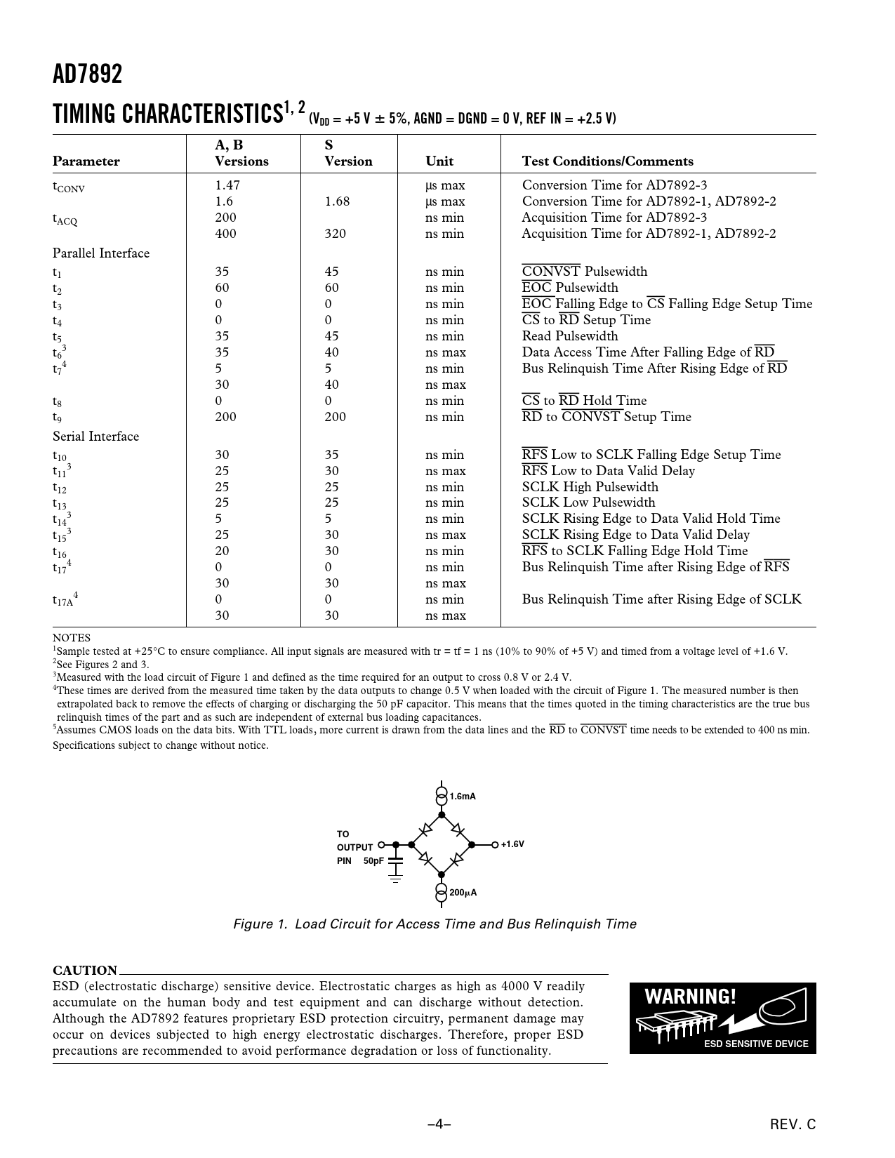 tCONV 1.47 µs max Conversion Time for AD7892-3 1.6 1.68 µs max Conversion Time for AD7892-1, AD7892-2 tACQ 200 ns min Acquisition Time for AD7892-3 400 320 ns min Acquisition Time for AD7892-1, AD7892-2 Parallel Interface t1 35 45 ns min CONVST Pulsewidth t2 60 60 ns min EOC Pulsewidth t3 0 0 ns min EOC Falling Edge to CS Falling Edge Setup Time t4 0 0 ns min CS to RD Setup Time t5 35 45 ns min Read Pulsewidth t 3 6 35 40 ns max Data Access Time After Falling Edge of RD t 4 7 5 5 ns min Bus Relinquish Time After Rising Edge of RD 30 40 ns max t8 0 0 ns min CS to RD Hold Time t9 200 200 ns min RD to CONVST Setup Time Serial Interface t10 30 35 ns min RFS Low to SCLK Falling Edge Setup Time t 3 11 25 30 ns max RFS Low to Data Valid Delay t12 25 25 ns min SCLK High Pulsewidth t13 25 25 ns min SCLK Low Pulsewidth t 3 14 5 5 ns min SCLK Rising Edge to Data Valid Hold Time t 3 15 25 30 ns max SCLK Rising Edge to Data Valid Delay t16 20 30 ns min RFS to SCLK Falling Edge Hold Time t 4 17 0 0 ns min Bus Relinquish Time after Rising Edge of RFS 30 30 ns max t 4 17A 0 0 ns min Bus Relinquish Time after Rising Edge of SCLK 30 30 ns max NOTES 1Sample tested at +25°C to ensure compliance. All input signals are measured with tr = tf = 1 ns (10% to 90% of +5 V) and timed from a voltage level of +1.6 V. 2See Figures 2 and 3. 3Measured with the load circuit of Figure 1 and defined as the time required for an output to cross 0.8 V or 2.4 V. 4These times are derived from the measured time taken by the data outputs to change 0.5 V when loaded with the circuit of Figure 1. The measured number is then extrapolated back to remove the effects of charging or discharging the 50 pF capacitor. This means that the times quoted in the timing characteristics are the true bus relinquish times of the part and as such are independent of external bus loading capacitances. 5Assumes CMOS loads on the data bits. With TTL loads, more current is drawn from the data lines and the RD to CONVST time needs to be extended to 400 ns min. Specifications subject to change without notice.