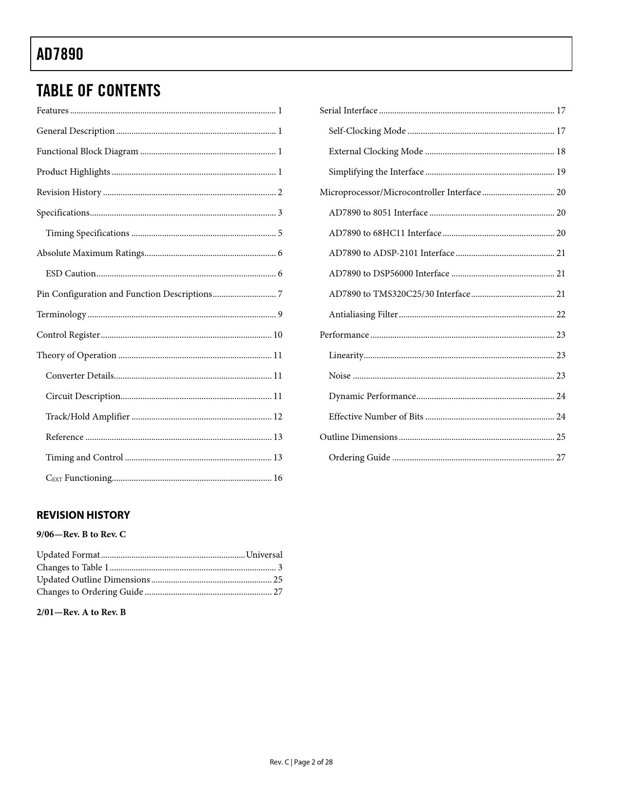 | Páginas / Página | 29 / 3 — AD7890. TABLE OF CONTENTS. REVISION HISTORY. 9/06—Rev. B to Rev. C. … |