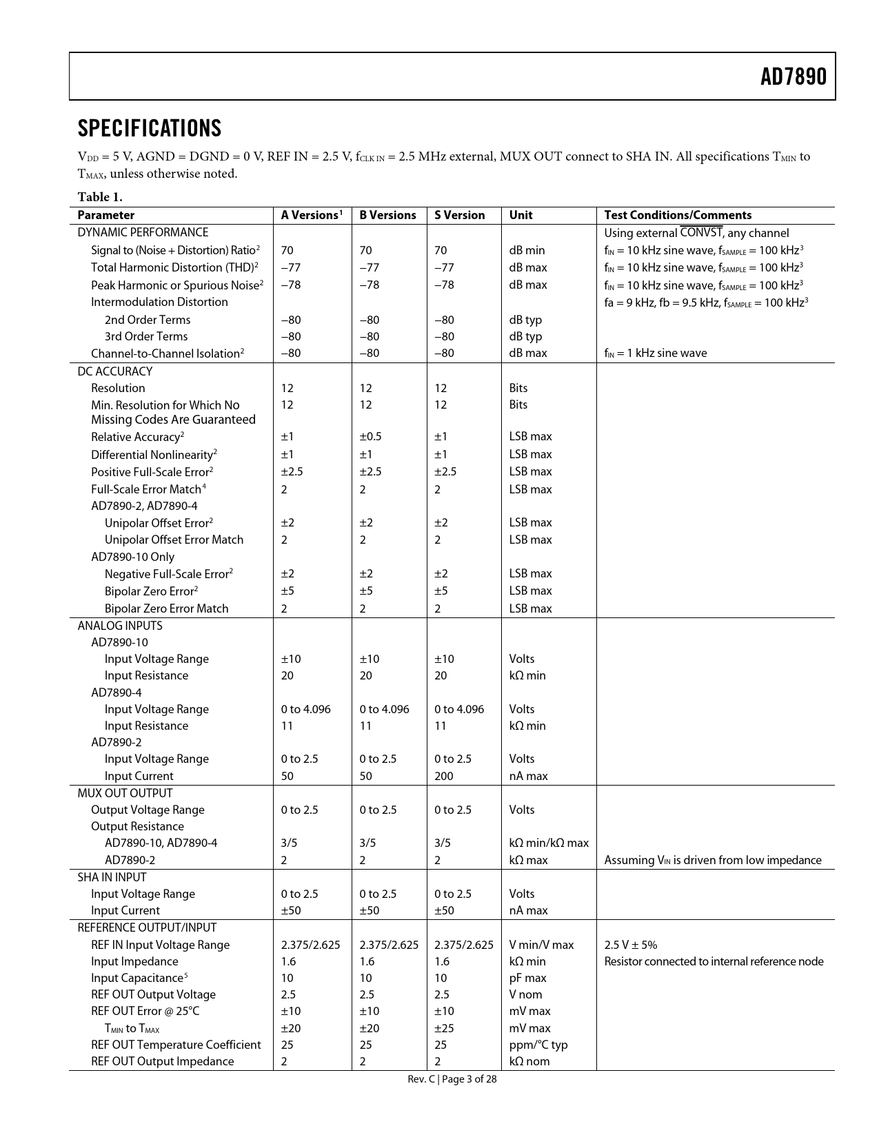 AD7890. SPECIFICATIONS. Table 1. Parameter. A Versions1. B Versions. S Version. Unit. Test Conditions/Comments