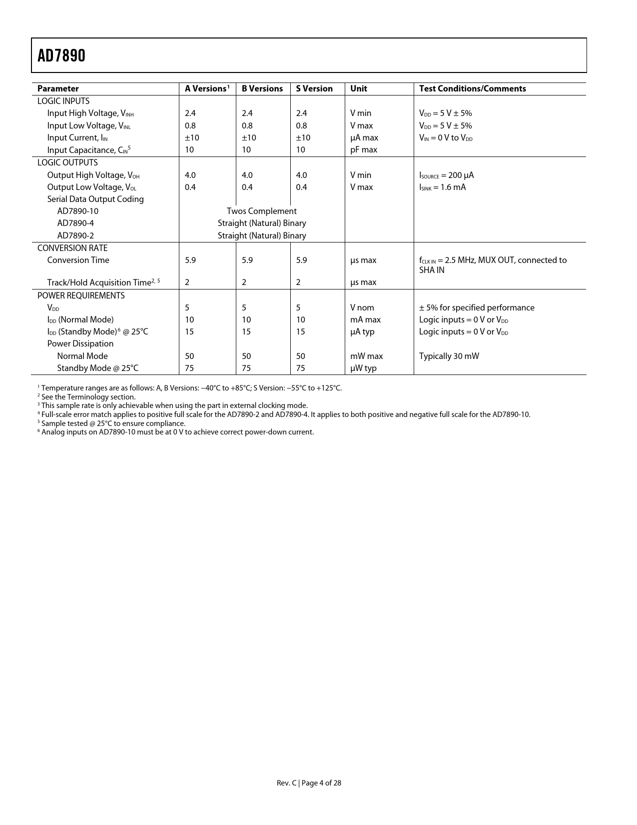 Páginas / Página29 / 5 — AD7890. Parameter. A Versions1. B Versions. S Version. Unit. Test …