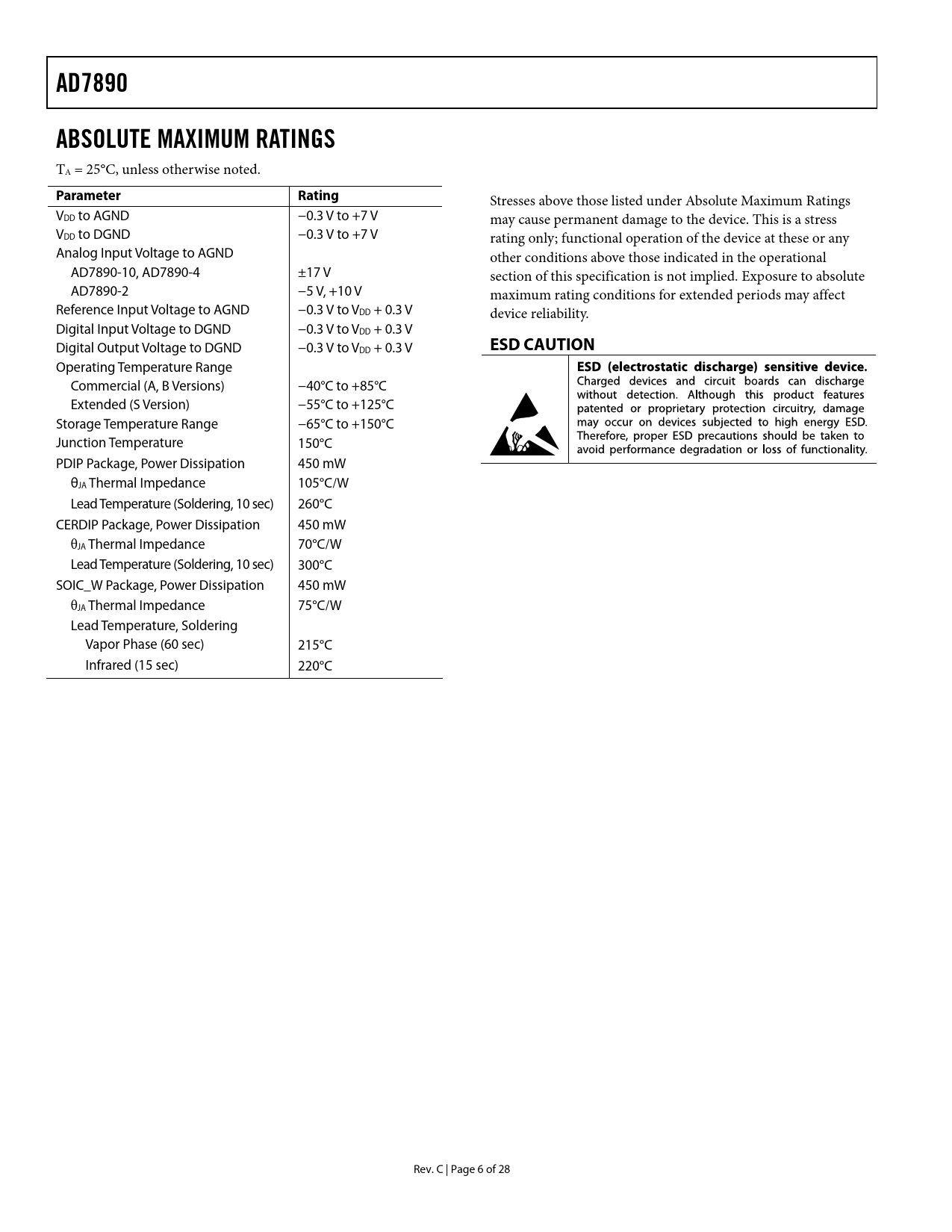 AD7890ABSOLUTE MAXIMUM RATINGS TA = 25°C, unless otherwise noted. Parameter Rating Stresses above those listed under Absolute Maximum Ratings VDD to AGND −0.3 V to +7 V may cause permanent damage to the device. This is a stress VDD to DGND −0.3 V to +7 V rating only; functional operation of the device at these or any Analog Input Voltage to AGND other conditions above those indicated in the operational AD7890-10, AD7890-4 ±17 V section of this specification is not implied. Exposure to absolute AD7890-2 −5 V, +10 V maximum rating conditions for extended periods may affect Reference Input Voltage to AGND −0.3 V to VDD + 0.3 V device reliability. Digital Input Voltage to DGND −0.3 V to VDD + 0.3 V Digital Output Voltage to DGND −0.3 V to V ESD CAUTION DD + 0.3 V Operating Temperature Range Commercial (A, B Versions) −40°C to +85°C Extended (S Version) −55°C to +125°C Storage Temperature Range −65°C to +150°C Junction Temperature 150°C PDIP Package, Power Dissipation 450 mW θ JA Thermal Impedance 105°C/W Lead Temperature (Soldering, 10 sec) 260°C CERDIP Package, Power Dissipation 450 mW θ JA Thermal Impedance 70°C/W Lead Temperature (Soldering, 10 sec) 300°C SOIC_W Package, Power Dissipation 450 mW θJA Thermal Impedance 75°C/W Lead Temperature, Soldering Vapor Phase (60 sec) 215°C Infrared (15 sec) 220°C Rev. C | Page 6 of 28 Document Outline FEATURES GENERAL DESCRIPTION FUNCTIONAL BLOCK DIAGRAM PRODUCT HIGHLIGHTS TABLE OF CONTENTS REVISION HISTORY SPECIFICATIONS TIMING SPECIFICATIONS ABSOLUTE MAXIMUM RATINGS ESD CAUTION PIN CONFIGURATION AND FUNCTION DESCRIPTIONS TERMINOLOGY CONTROL REGISTER THEORY OF OPERATION CONVERTER DETAILS CIRCUIT DESCRIPTION AD7890-10 Analog Input AD7890-4 Analog Input AD7890-2 Analog Input TRACK/HOLD AMPLIFIER REFERENCE TIMING AND CONTROL CEXT FUNCTIONING SERIAL INTERFACE SELF-CLOCKING MODE Write Operation EXTERNAL CLOCKING MODE Read Operation Write Operation SIMPLIFYING THE INTERFACE MICROPROCESSOR/MICROCONTROLLER INTERFACE AD7890 TO 8051 INTERFACE AD7890 TO 68HC11 INTERFACE AD7890 TO ADSP-2101 INTERFACE AD7890 TO DSP56000 INTERFACE AD7890 TO TMS320C25/30 INTERFACE ANTIALIASING FILTER PERFORMANCE LINEARITY NOISE DYNAMIC PERFORMANCE EFFECTIVE NUMBER OF BITS OUTLINE DIMENSIONS ORDERING GUIDE