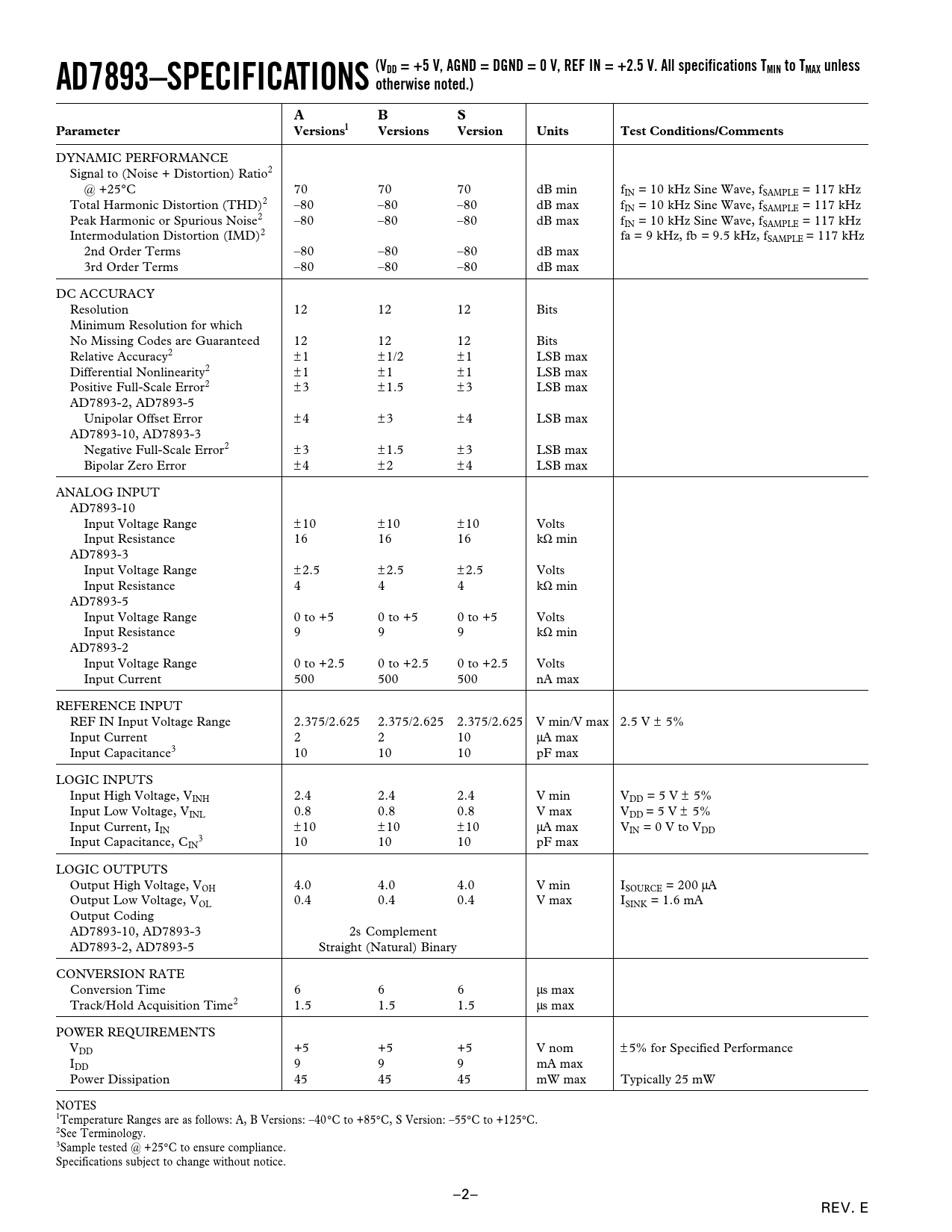 AD7893–SPECIFICATIONS (VDD = +5 V, AGND = DGND = 0 V, REF IN = +2.5 V. All specifications TMIN to TMAX unlessotherwise noted.)ABSParameterVersionslVersionsVersionUnitsTest Conditions/Comments DYNAMIC PERFORMANCE Signal to (Noise + Distortion) Ratio2 @ +25°C 70 70 70 dB min fIN = 10 kHz Sine Wave, fSAMPLE = 117 kHz Total Harmonic Distortion (THD)2 –80 –80 –80 dB max fIN = 10 kHz Sine Wave, fSAMPLE = 117 kHz Peak Harmonic or Spurious Noise2 –80 –80 –80 dB max fIN = 10 kHz Sine Wave, fSAMPLE = 117 kHz Intermodulation Distortion (IMD)2 fa = 9 kHz, fb = 9.5 kHz, fSAMPLE = 117 kHz 2nd Order Terms –80 –80 –80 dB max 3rd Order Terms –80 –80 –80 dB max DC ACCURACY Resolution 12 12 12 Bits Minimum Resolution for which No Missing Codes are Guaranteed 12 12 12 Bits Relative Accuracy2 ±1 ±1/2 ±1 LSB max Differential Nonlinearity2 ±1 ±1 ±1 LSB max Positive Full-Scale Error2 ±3 ±1.5 ±3 LSB max AD7893-2, AD7893-5 Unipolar Offset Error ±4 ±3 ±4 LSB max AD7893-10, AD7893-3 Negative Full-Scale Error2 ±3 ±1.5 ±3 LSB max Bipolar Zero Error ±4 ±2 ±4 LSB max ANALOG INPUT AD7893-10 Input Voltage Range ±10 ±10 ±10 Volts Input Resistance 16 16 16 kΩ min AD7893-3 Input Voltage Range ±2.5 ±2.5 ±2.5 Volts Input Resistance 4 4 4 kΩ min AD7893-5 Input Voltage Range 0 to +5 0 to +5 0 to +5 Volts Input Resistance 9 9 9 kΩ min AD7893-2 Input Voltage Range 0 to +2.5 0 to +2.5 0 to +2.5 Volts Input Current 500 500 500 nA max REFERENCE INPUT REF IN Input Voltage Range 2.375/2.625 2.375/2.625 2.375/2.625 V min/V max 2.5 V ± 5% Input Current 2 2 10 µA max Input Capacitance3 10 10 10 pF max LOGIC INPUTS Input High Voltage, VINH 2.4 2.4 2.4 V min VDD = 5 V ± 5% Input Low Voltage, VINL 0.8 0.8 0.8 V max VDD = 5 V ± 5% Input Current, I ± IN 10 ±10 ±10 µA max VIN = 0 V to VDD Input Capacitance, C 3 IN 10 10 10 pF max LOGIC OUTPUTS Output High Voltage, VOH 4.0 4.0 4.0 V min ISOURCE = 200 µA Output Low Voltage, VOL 0.4 0.4 0.4 V max ISINK = 1.6 mA Output Coding AD7893-10, AD7893-3 2s Complement AD7893-2, AD7893-5 Straight (Natural) Binary CONVERSION RATE Conversion Time 6 6 6 µs max Track/Hold Acquisition Time2 1.5 1.5 1.5 µs max POWER REQUIREMENTS VDD +5 +5 +5 V nom ±5% for Specified Performance IDD 9 9 9 mA max Power Dissipation 45 45 45 mW max Typically 25 mW NOTES 1Temperature Ranges are as follows: A, B Versions: –40°C to +85°C, S Version: –55°C to +125°C. 2See Terminology. 3Sample tested @ +25°C to ensure compliance. Specifications subject to change without notice. –2– REV. E
