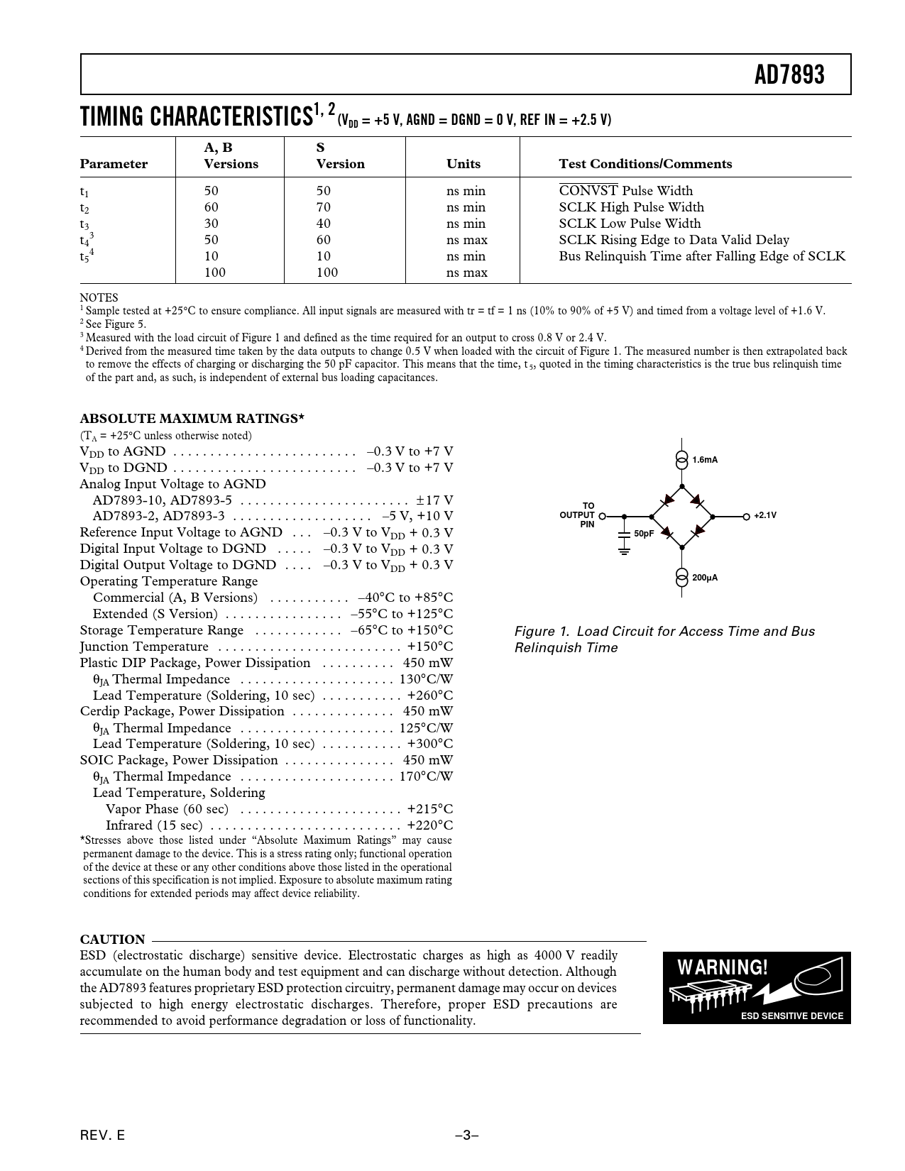 AD7893 TIMING CHARACTERISTICS1, 2 (VDD = +5 V, AGND = DGND = 0 V, REF IN = +2.5 V) A, B S Parameter Versions Version Units Test Conditions/Comments