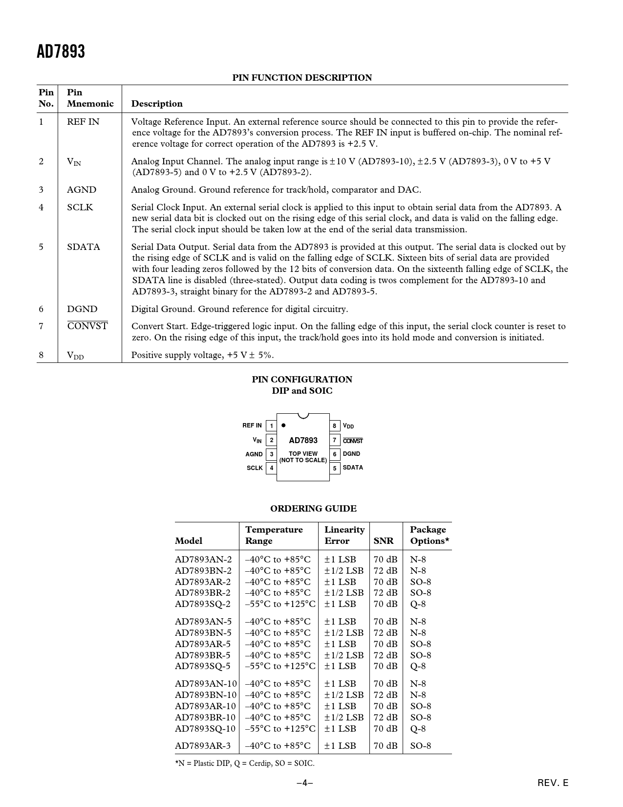 PIN CONFIGURATION DIP and SOIC REF IN 1 8 VDD VIN 2 AD7893 7 CONVST AGND 3 TOP VIEW 6 DGND (NOT TO SCALE) SCLK 4 5 SDATA ORDERING GUIDE Temperature Linearity Package Model Range Error SNR Options*