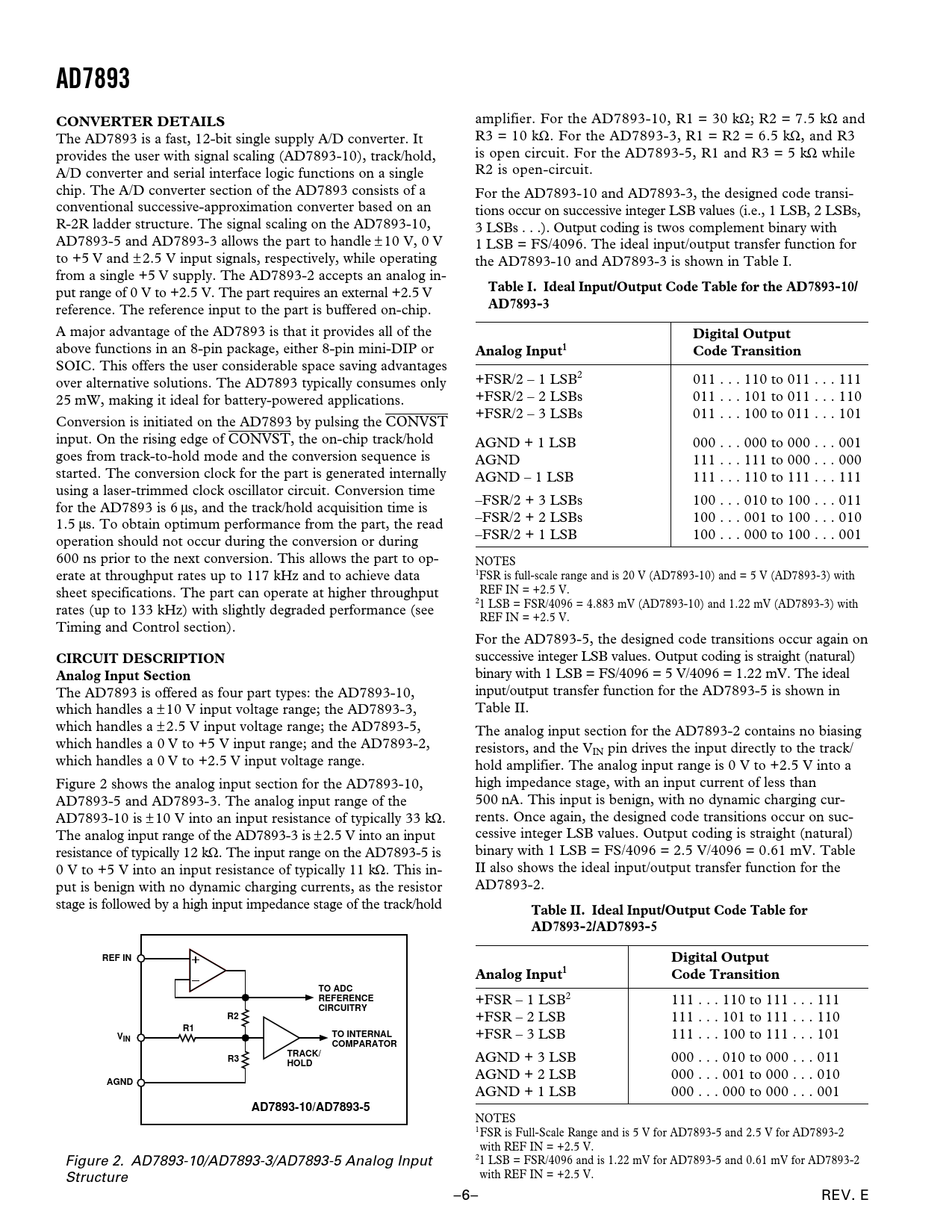 NOTES 1FSR is Full-Scale Range and is 5 V for AD7893-5 and 2.5 V for AD7893-2 with REF IN = +2.5 V. Figure 2. AD7893-10/AD7893-3/AD7893-5 Analog Input 21 LSB = FSR/4096 and is 1.22 mV for AD7893-5 and 0.61 mV for AD7893-2 Structure with REF IN = +2.5 V. –6– REV. E