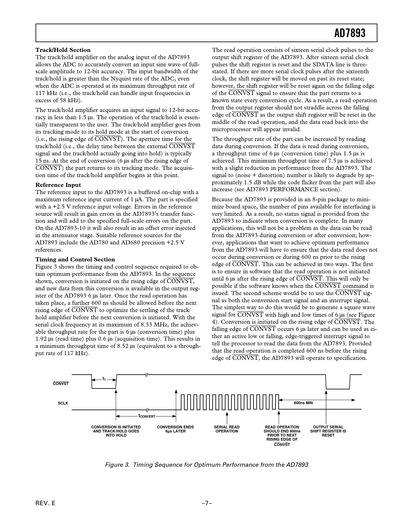 AD7893Track/Hold Section The read operation consists of sixteen serial clock pulses to the The track/hold amplifier on the analog input of the AD7893 output shift register of the AD7893. After sixteen serial clock allows the ADC to accurately convert an input sine wave of full- pulses the shift register is reset and the SDATA line is three- scale amplitude to 12-bit accuracy. The input bandwidth of the stated. If there are more serial clock pulses after the sixteenth track/hold is greater than the Nyquist rate of the ADC, even clock, the shift register will be moved on past its reset state; when the ADC is operated at its maximum throughput rate of however, the shift register will be reset again on the falling edge 117 kHz (i.e., the track/hold can handle input frequencies in of the CONVST signal to ensure that the part returns to a excess of 58 kHz). known state every conversion cycle. As a result, a read operation The track/hold amplifier acquires an input signal to 12-bit accu- from the output register should not straddle across the falling racy in less than 1.5 µs. The operation of the track/hold is essen- edge of CONVST as the output shift register will be reset in the tially transparent to the user. The track/hold amplifier goes from middle of the read operation, and the data read back into the its tracking mode to its hold mode at the start of conversion microprocessor will appear invalid. (i.e., the rising edge of CONVST). The aperture time for the The throughput rate of the part can be increased by reading track/hold (i.e., the delay time between the external CONVST data during conversion. If the data is read during conversion, signal and the track/hold actually going into hold) is typically a throughput time of 6 µs (conversion time) plus 1.5 µs is 15 ns. At the end of conversion (6 µs after the rising edge of achieved. This minimum throughput time of 7.5 µs is achieved CONVST) the part returns to its tracking mode. The acquisi- with a slight reduction in performance from the AD7893. The tion time of the track/hold amplifier begins at this point. signal to (noise + distortion) number is likely to degrade by ap- Reference Input proximately 1.5 dB while the code flicker from the part will also The reference input to the AD7893 is a buffered on-chip with a increase (see AD7893 PERFORMANCE section). maximum reference input current of 1 µA. The part is specified Because the AD7893 is provided in an 8-pin package to mini- with a +2.5 V reference input voltage. Errors in the reference mize board space, the number of pins available for interfacing is source will result in gain errors in the AD7893’s transfer func- very limited. As a result, no status signal is provided from the tion and will add to the specified full-scale errors on the part. AD7893 to indicate when conversion is complete. In many On the AD7893-10 it will also result in an offset error injected applications, this will not be a problem as the data can be read in the attenuator stage. Suitable reference sources for the from the AD7893 during conversion or after conversion; how- AD7893 include the AD780 and AD680 precision +2.5 V ever, applications that want to achieve optimum performance references. from the AD7893 will have to ensure that the data read does not Timing and Control Section occur during conversion or during 600 ns prior to the rising Figure 3 shows the timing and control sequence required to ob- edge of CONVST. This can be achieved in two ways. The first tain optimum performance from the AD7893. In the sequence is to ensure in software that the read operation is not initiated shown, conversion is initiated on the rising edge of CONVST, until 6 µs after the rising edge of CONVST. This will only be and new data from this conversion is available in the output reg- possible if the software knows when the CONVST command is ister of the AD7893 6 µs later. Once the read operation has issued. The second scheme would be to use the CONVST sig- taken place, a further 600 ns should be allowed before the next nal as both the conversion start signal and an interrupt signal. rising edge of CONVST to optimize the settling of the track/ The simplest way to do this would be to generate a square wave hold amplifier before the next conversion is initiated. With the signal for CONVST with high and low times of 6 µs (see Figure serial clock frequency at its maximum of 8.33 MHz, the achiev- 4). Conversion is initiated on the rising edge of CONVST. The able throughput rate for the part is 6 µs (conversion time) plus falling edge of CONVST occurs 6 µs later and can be used as ei- 1.92 µs (read time) plus 0.6 µs (acquisition time). This results in ther an active low or falling, edge-triggered interrupt signal to a minimum throughput time of 8.52 µs (equivalent to a through- tell the processor to read the data from the AD7893. Provided put rate of 117 kHz). that the read operation is completed 600 ns before the rising edge of CONVST, the AD7893 will operate to specification. t1CONVSTSCLK600ns MINtCONVERTCONVERSION IS INITIATEDCONVERSION ENDSSERIAL READREAD OPERATIONOUTPUT SERIALAND TRACK/HOLD GOES6µs LATEROPERATIONSHOULD END 600nsSHIFT REGISTER ISINTO HOLDPRIOR TO NEXTRESETRISING EDGE OFCONVST Figure 3. Timing Sequence for Optimum Performance from the AD7893 REV. E –7–