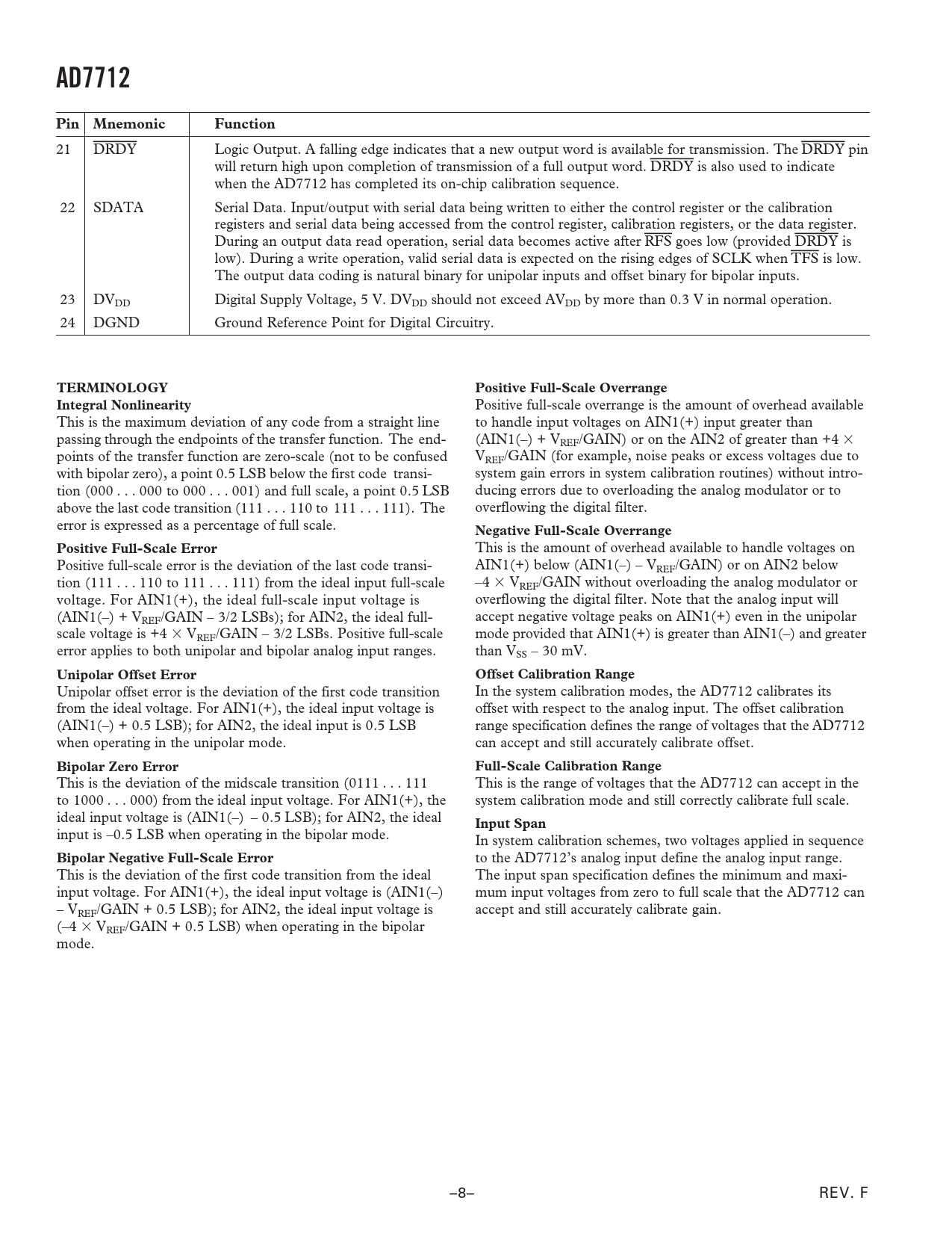 AD7712PinMnemonicFunction 21 DRDY Logic Output. A falling edge indicates that a new output word is available for transmission. The DRDY pin will return high upon completion of transmission of a full output word. DRDY is also used to indicate when the AD7712 has completed its on-chip calibration sequence. 22 SDATA Serial Data. Input/output with serial data being written to either the control register or the calibration registers and serial data being accessed from the control register, calibration registers, or the data register. During an output data read operation, serial data becomes active after RFS goes low (provided DRDY is low). During a write operation, valid serial data is expected on the rising edges of SCLK when TFS is low. The output data coding is natural binary for unipolar inputs and offset binary for bipolar inputs. 23 DVDD Digital Supply Voltage, 5 V. DVDD should not exceed AVDD by more than 0.3 V in normal operation. 24 DGND Ground Reference Point for Digital Circuitry. TERMINOLOGYPositive Full-Scale OverrangeIntegral Nonlinearity Positive full-scale overrange is the amount of overhead available This is the maximum deviation of any code from a straight line to handle input voltages on AIN1(+) input greater than passing through the endpoints of the transfer function. The end- (AIN1(–) + VREF/GAIN) or on the AIN2 of greater than +4 ⫻ points of the transfer function are zero-scale (not to be confused VREF/GAIN (for example, noise peaks or excess voltages due to with bipolar zero), a point 0.5 LSB below the first code transi- system gain errors in system calibration routines) without intro- tion (000 . 000 to 000 . 001) and full scale, a point 0.5 LSB ducing errors due to overloading the analog modulator or to above the last code transition (111 . 110 to 111 . 111). The overflowing the digital filter. error is expressed as a percentage of full scale. Negative Full-Scale OverrangePositive Full-Scale Error This is the amount of overhead available to handle voltages on Positive full-scale error is the deviation of the last code transi- AIN1(+) below (AIN1(–) – VREF/GAIN) or on AIN2 below tion (111 . 110 to 111 . 111) from the ideal input full-scale –4 ⫻ VREF/GAIN without overloading the analog modulator or voltage. For AIN1(+), the ideal full-scale input voltage is overflowing the digital filter. Note that the analog input will (AIN1(–) + VREF/GAIN – 3/2 LSBs); for AIN2, the ideal full- accept negative voltage peaks on AIN1(+) even in the unipolar scale voltage is +4 ⫻ VREF/GAIN – 3/2 LSBs. Positive full-scale mode provided that AIN1(+) is greater than AIN1(–) and greater error applies to both unipolar and bipolar analog input ranges. than VSS – 30 mV. Unipolar Offset ErrorOffset Calibration Range Unipolar offset error is the deviation of the first code transition In the system calibration modes, the AD7712 calibrates its from the ideal voltage. For AIN1(+), the ideal input voltage is offset with respect to the analog input. The offset calibration (AIN1(–) + 0.5 LSB); for AIN2, the ideal input is 0.5 LSB range specification defines the range of voltages that the AD7712 when operating in the unipolar mode. can accept and still accurately calibrate offset. Bipolar Zero ErrorFull-Scale Calibration Range This is the deviation of the midscale transition (0111 . 111 This is the range of voltages that the AD7712 can accept in the to 1000 . 000) from the ideal input voltage. For AIN1(+), the system calibration mode and still correctly calibrate full scale. ideal input voltage is (AIN1(–) – 0.5 LSB); for AIN2, the ideal Input Span input is –0.5 LSB when operating in the bipolar mode. In system calibration schemes, two voltages applied in sequence Bipolar Negative Full-Scale Error to the AD7712’s analog input define the analog input range. This is the deviation of the first code transition from the ideal The input span specification defines the minimum and maxi- input voltage. For AIN1(+), the ideal input voltage is (AIN1(–) mum input voltages from zero to full scale that the AD7712 can – VREF/GAIN + 0.5 LSB); for AIN2, the ideal input voltage is accept and still accurately calibrate gain. (–4 ⫻ VREF/GAIN + 0.5 LSB) when operating in the bipolar mode. –8– REV. F Document Outline ANALOG INPUT FUNCTIONS FEATURES APPLICATIONS GENERAL DESCRIPTION FUNCTIONAL BLOCK DIAGRAM PRODUCT HIGHLIGHTS SPECIFICATIONS ABSOLUTE MAXIMUM RATINGS ORDERING GUIDE TIMING CHARACTERISTICS PIN CONFIGURATION PIN FUNCTION DESCRIPTION TERMINOLOGY Integral Nonlinearity Positive Full-Scale Error Bipolar Zero Error Bipolar Negative Full-Scale Error Positive Full-Scale Overrange Negative Full-Scale Overrange Offset Calibration Range Full-Scale Calibration Range Input Span Control Register (24 Bits) Filter Selection (FS11–FS0) CIRCUIT DESCRIPTION THEORY OF OPERATION Input Sample Rate DIGITAL FILTERING Filter Characteristics Post Filtering Antialias Considerations ANALOG INPUT FUNCTIONS Analog Input Ranges Burnout Current Bipolar/Unipolar Inputs REFERENCE INPUT/OUTPUT VBIAS Input USING THE AD7712 SYSTEM DESIGN CONSIDERATIONS Clocking System Synchronization Accuracy Autocalibration Self-Calibration System Calibration System Offset Calibration Background Calibration Span and Offset Limits POWER-UP AND CALIBRATION Drift Considerations POWER SUPPLIES AND GROUNDING DIGITAL INTERFACE Self-Clocking Mode Read Operation Write Operation External Clocking Mode Read Operation Write Operation SIMPLIFYING THE EXTERNAL CLOCKING MODE INTERFACE MICROCOMPUTER/MICROPROCESSOR INTERFACING AD7712 to 8051 Interface AD7712 to 68HC11 Interface APPLICATIONS 4–20 mA LOOP OUTLINE DIMENSIONS Revision History