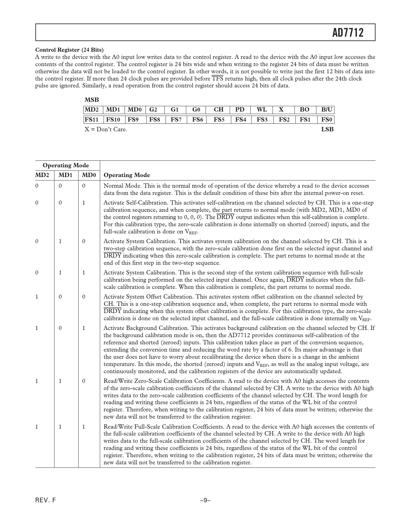 AD7712Control Register (24 Bits) A write to the device with the A0 input low writes data to the control register. A read to the device with the A0 input low accesses the contents of the control register. The control register is 24 bits wide and when writing to the register 24 bits of data must be written otherwise the data will not be loaded to the control register. In other words, it is not possible to write just the first 12 bits of data into the control register. If more than 24 clock pulses are provided before TFS returns high, then all clock pulses after the 24th clock pulse are ignored. Similarly, a read operation from the control register should access 24 bits of data. MSBMD2MD1MD0G2G1G0CHPDWLXBOB/UFS11FS10FS9FS8FS7FS6FS5FS4FS3FS2FS1FS0 X = Don’t Care. LSBOperating ModeMD2MD1MD0Operating Mode 0 0 0 Normal Mode. This is the normal mode of operation of the device whereby a read to the device accesses data from the data register. This is the default condition of these bits after the internal power-on reset. 0 0 1 Activate Self-Calibration. This activates self-calibration on the channel selected by CH. This is a one-step calibration sequence, and when complete, the part returns to normal mode (with MD2, MD1, MD0 of the control registers returning to 0, 0, 0). The DRDY output indicates when this self-calibration is complete. For this calibration type, the zero-scale calibration is done internally on shorted (zeroed) inputs, and the full-scale calibration is done on VREF. 0 1 0 Activate System Calibration. This activates system calibration on the channel selected by CH. This is a two-step calibration sequence, with the zero-scale calibration done first on the selected input channel and DRDY indicating when this zero-scale calibration is complete. The part returns to normal mode at the end of this first step in the two-step sequence. 0 1 1 Activate System Calibration. This is the second step of the system calibration sequence with full-scale calibration being performed on the selected input channel. Once again, DRDY indicates when the full- scale calibration is complete. When this calibration is complete, the part returns to normal mode. 1 0 0 Activate System Offset Calibration. This activates system offset calibration on the channel selected by CH. This is a one-step calibration sequence and, when complete, the part returns to normal mode with DRDY indicating when this system offset calibration is complete. For this calibration type, the zero-scale calibration is done on the selected input channel, and the full-scale calibration is done internally on VREF. 1 0 1 Activate Background Calibration. This activates background calibration on the channel selected by CH. If the background calibration mode is on, then the AD7712 provides continuous self-calibration of the reference and shorted (zeroed) inputs. This calibration takes place as part of the conversion sequence, extending the conversion time and reducing the word rate by a factor of 6. Its major advantage is that the user does not have to worry about recalibrating the device when there is a change in the ambient temperature. In this mode, the shorted (zeroed) inputs and VREF, as well as the analog input voltage, are continuously monitored, and the calibration registers of the device are automatically updated. 1 1 0 Read/Write Zero-Scale Calibration Coefficients. A read to the device with A0 high accesses the contents of the zero-scale calibration coefficients of the channel selected by CH. A write to the device with A0 high writes data to the zero-scale calibration coefficients of the channel selected by CH. The word length for reading and writing these coefficients is 24 bits, regardless of the status of the WL bit of the control register. Therefore, when writing to the calibration register, 24 bits of data must be written; otherwise the new data will not be transferred to the calibration register. 1 1 1 Read/Write Full-Scale Calibration Coefficients. A read to the device with A0 high accesses the contents of the full-scale calibration coefficients of the channel selected by CH. A write to the device with A0 high writes data to the full-scale calibration coefficients of the channel selected by CH. The word length for reading and writing these coefficients is 24 bits, regardless of the status of the WL bit of the control register. Therefore, when writing to the calibration register, 24 bits of data must be written; otherwise the new data will not be transferred to the calibration register. REV. F –9– Document Outline ANALOG INPUT FUNCTIONS FEATURES APPLICATIONS GENERAL DESCRIPTION FUNCTIONAL BLOCK DIAGRAM PRODUCT HIGHLIGHTS SPECIFICATIONS ABSOLUTE MAXIMUM RATINGS ORDERING GUIDE TIMING CHARACTERISTICS PIN CONFIGURATION PIN FUNCTION DESCRIPTION TERMINOLOGY Integral Nonlinearity Positive Full-Scale Error Bipolar Zero Error Bipolar Negative Full-Scale Error Positive Full-Scale Overrange Negative Full-Scale Overrange Offset Calibration Range Full-Scale Calibration Range Input Span Control Register (24 Bits) Filter Selection (FS11–FS0) CIRCUIT DESCRIPTION THEORY OF OPERATION Input Sample Rate DIGITAL FILTERING Filter Characteristics Post Filtering Antialias Considerations ANALOG INPUT FUNCTIONS Analog Input Ranges Burnout Current Bipolar/Unipolar Inputs REFERENCE INPUT/OUTPUT VBIAS Input USING THE AD7712 SYSTEM DESIGN CONSIDERATIONS Clocking System Synchronization Accuracy Autocalibration Self-Calibration System Calibration System Offset Calibration Background Calibration Span and Offset Limits POWER-UP AND CALIBRATION Drift Considerations POWER SUPPLIES AND GROUNDING DIGITAL INTERFACE Self-Clocking Mode Read Operation Write Operation External Clocking Mode Read Operation Write Operation SIMPLIFYING THE EXTERNAL CLOCKING MODE INTERFACE MICROCOMPUTER/MICROPROCESSOR INTERFACING AD7712 to 8051 Interface AD7712 to 68HC11 Interface APPLICATIONS 4–20 mA LOOP OUTLINE DIMENSIONS Revision History