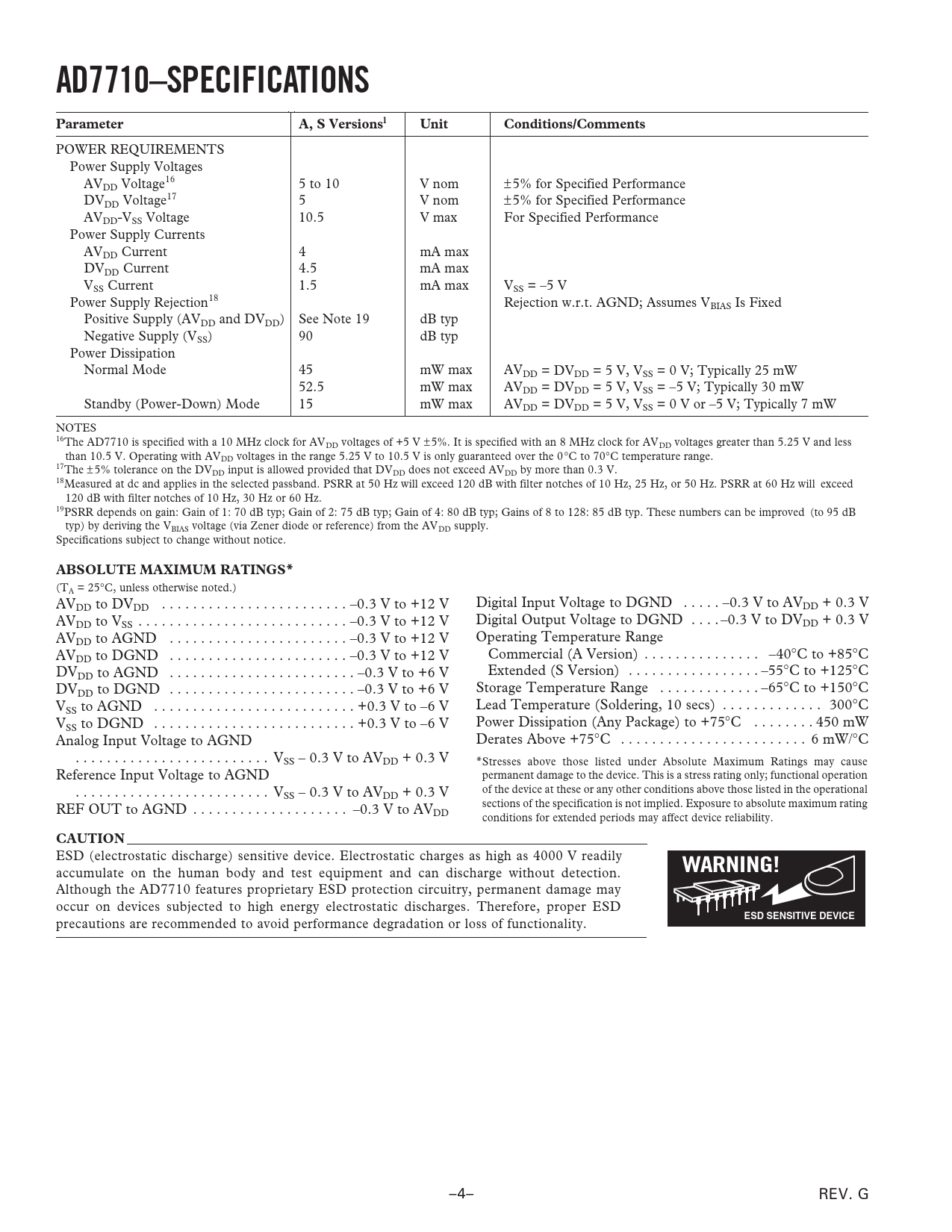 AD7710–SPECIFICATIONS. Parameter. A, S Versionsl. Unit. Conditions/Comments. ABSOLUTE MAXIMUM RATINGS*. CAUTION. WARNING!