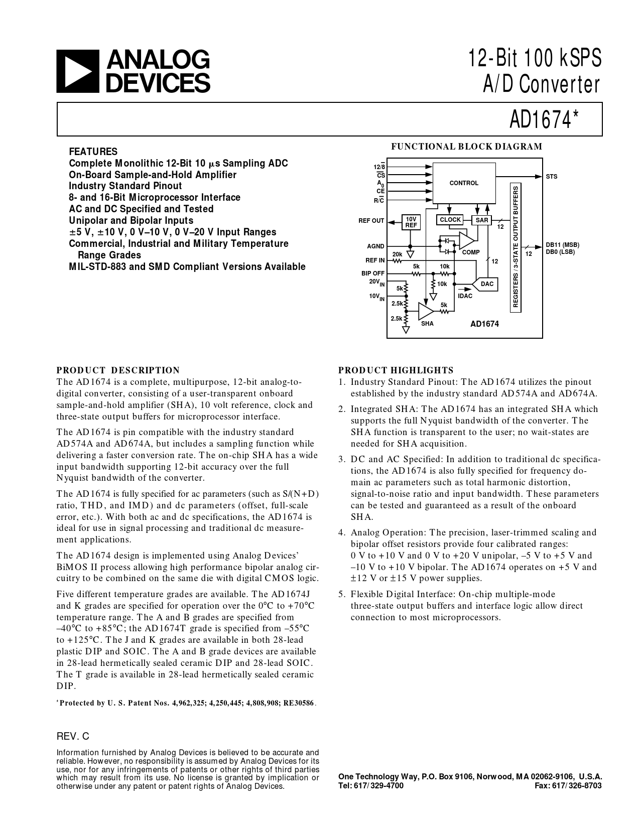 a 12-Bit 100 kSPSA/D ConverterAD1674*FUNCTIONAL BLOCK DIAGRAMFEATURES Complete Monolithic 12-Bit 10 m s Sampling ADC12/8On-Board Sample-and-Hold AmplifierCSSTSACONTROL0Industry Standard PinoutCE8- and 16-Bit Microprocessor Interface A R/CAC and DC Specified and Tested Unipolar and Bipolar Inputs A A 10VREF AA AA REF OUTCLOCKSAR12 6 5 V, 6 10 V, 0 V–10 V, 0 V–20 V Input Ranges Commercial, Industrial and Military Temperature A AA AA A AGNDDB11 (MSB)COMP20k12DB0 (LSB)Range GradesREF IN125k10kMIL-STD-883 and SMD Compliant Versions Available A BIP OFF20VIN10kDAC5k A 10VIDACIN2.5k5k A REGISTERS / 3-STATE OUTPUT BUFFERS2.5kSHAAD1674PRODUCT DESCRIPTIONPRODUCT HIGHLIGHTS The AD1674 is a complete, multipurpose, 12-bit analog-to- 1. Industry Standard Pinout: The AD1674 utilizes the pinout digital converter, consisting of a user-transparent onboard established by the industry standard AD574A and AD674A. sample-and-hold amplifier (SHA), 10 volt reference, clock and 2. Integrated SHA: The AD1674 has an integrated SHA which three-state output buffers for microprocessor interface. supports the full Nyquist bandwidth of the converter. The The AD1674 is pin compatible with the industry standard SHA function is transparent to the user; no wait-states are AD574A and AD674A, but includes a sampling function while needed for SHA acquisition. delivering a faster conversion rate. The on-chip SHA has a wide 3. DC and AC Specified: In addition to traditional dc specifica- input bandwidth supporting 12-bit accuracy over the full tions, the AD1674 is also fully specified for frequency do- Nyquist bandwidth of the converter. main ac parameters such as total harmonic distortion, The AD1674 is fully specified for ac parameters (such as S/(N+D) signal-to-noise ratio and input bandwidth. These parameters ratio, THD, and IMD) and dc parameters (offset, full-scale can be tested and guaranteed as a result of the onboard error, etc.). With both ac and dc specifications, the AD1674 is SHA. ideal for use in signal processing and traditional dc measure- 4. Analog Operation: The precision, laser-trimmed scaling and ment applications. bipolar offset resistors provide four calibrated ranges: The AD1674 design is implemented using Analog Devices’ 0 V to +10 V and 0 V to +20 V unipolar, –5 V to +5 V and BiMOS II process allowing high performance bipolar analog cir- –10 V to +10 V bipolar. The AD1674 operates on +5 V and cuitry to be combined on the same die with digital CMOS logic. ±12 V or ±15 V power supplies. Five different temperature grades are available. The AD1674J 5. Flexible Digital Interface: On-chip multiple-mode and K grades are specified for operation over the 0°C to +70°C three-state output buffers and interface logic allow direct temperature range. The A and B grades are specified from connection to most microprocessors. –40°C to +85°C; the AD1674T grade is specified from –55°C to +125°C. The J and K grades are available in both 28-lead plastic DIP and SOIC. The A and B grade devices are available in 28-lead hermetically sealed ceramic DIP and 28-lead SOIC. The T grade is available in 28-lead hermetically sealed ceramic DIP. *Protected by U. S. Patent Nos. 4,962,325; 4,250,445; 4,808,908; RE30586 . REV. C Information furnished by Analog Devices is believed to be accurate and reliable. However, no responsibility is assumed by Analog Devices for its use, nor for any infringements of patents or other rights of third parties which may result from its use. No license is granted by implication or One Technology Way, P.O. Box 9106, Norwood, MA 02062-9106, U.S.A. otherwise under any patent or patent rights of Analog Devices. Tel: 617/329-4700Fax: 617/326-8703