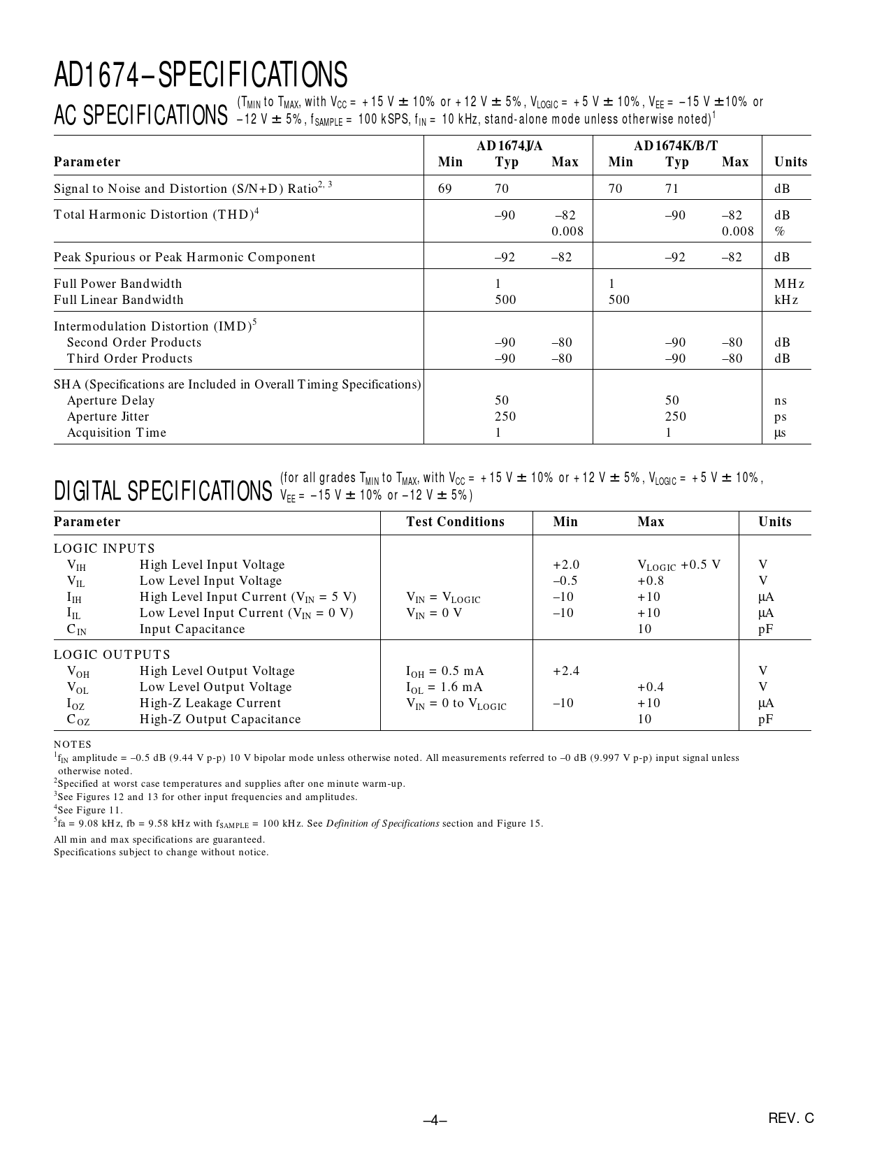 AD1674–SPECIFICATIONS. AC SPECIFICATIONS MIN to TMAX, with VCC = +15 V. 10% or +12 V. 5%, VLOGIC = +5 V. 10%, VEE = –15 V. 10% or