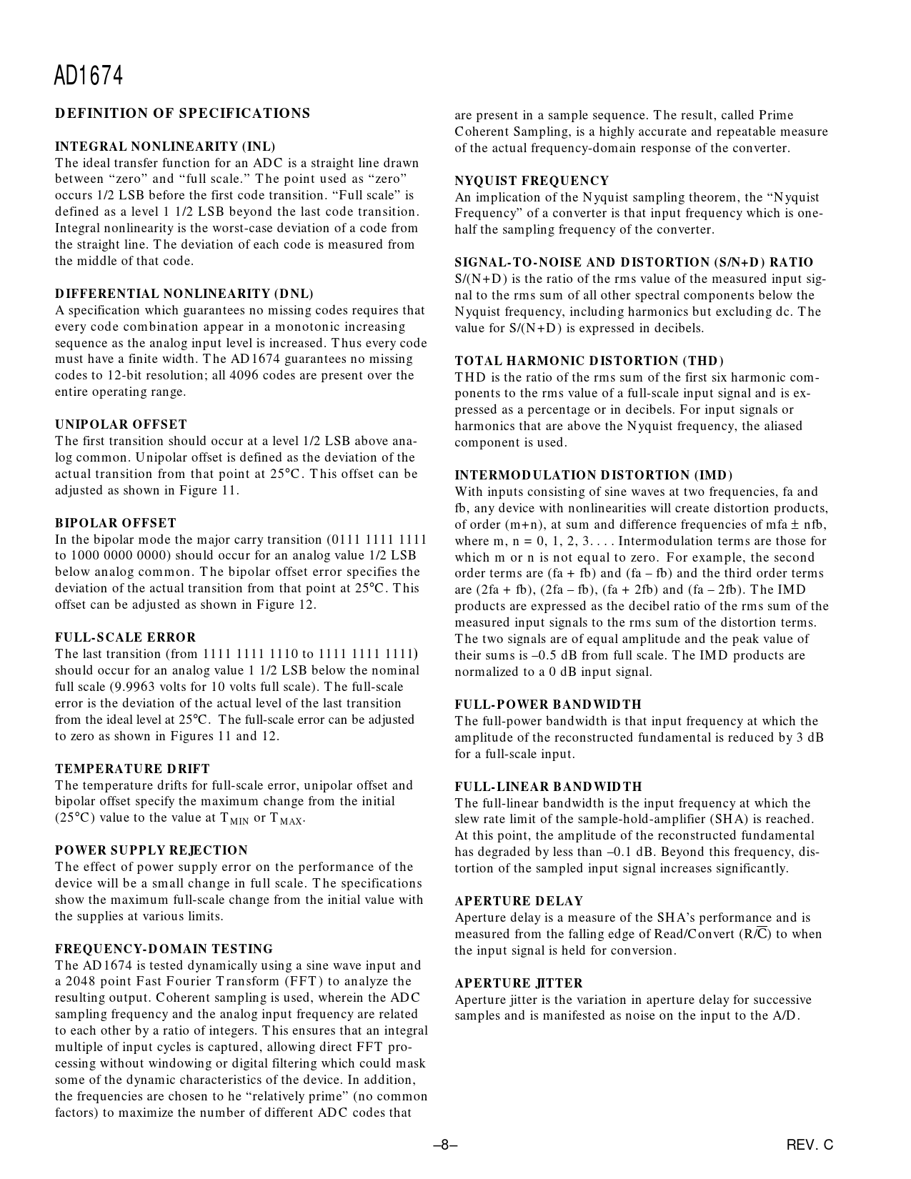 AD1674DEFINITION OF SPECIFICATIONS are present in a sample sequence. The result, called Prime Coherent Sampling, is a highly accurate and repeatable measure INTEGRAL NONLINEARITY (INL) of the actual frequency-domain response of the converter. The ideal transfer function for an ADC is a straight line drawn between “zero” and “full scale.” The point used as “zero” NYQUIST FREQUENCY occurs 1/2 LSB before the first code transition. “Full scale” is An implication of the Nyquist sampling theorem, the “Nyquist defined as a level 1 1/2 LSB beyond the last code transition. Frequency” of a converter is that input frequency which is one- Integral nonlinearity is the worst-case deviation of a code from half the sampling frequency of the converter. the straight line. The deviation of each code is measured from the middle of that code. SIGNAL-TO-NOISE AND DISTORTION (S/N+D) RATIO S/(N+D) is the ratio of the rms value of the measured input sig- DIFFERENTIAL NONLINEARITY (DNL) nal to the rms sum of all other spectral components below the A specification which guarantees no missing codes requires that Nyquist frequency, including harmonics but excluding dc. The every code combination appear in a monotonic increasing value for S/(N+D) is expressed in decibels. sequence as the analog input level is increased. Thus every code must have a finite width. The AD1674 guarantees no missing TOTAL HARMONIC DISTORTION (THD) codes to 12-bit resolution; all 4096 codes are present over the THD is the ratio of the rms sum of the first six harmonic com- entire operating range. ponents to the rms value of a full-scale input signal and is ex- pressed as a percentage or in decibels. For input signals or UNIPOLAR OFFSET harmonics that are above the Nyquist frequency, the aliased The first transition should occur at a level 1/2 LSB above ana- component is used. log common. Unipolar offset is defined as the deviation of the actual transition from that point at 25°C. This offset can be INTERMODULATION DISTORTION (IMD) adjusted as shown in Figure 11. With inputs consisting of sine waves at two frequencies, fa and fb, any device with nonlinearities will create distortion products, BIPOLAR OFFSET of order (m+n), at sum and difference frequencies of mfa ± nfb, In the bipolar mode the major carry transition (0111 1111 1111 where m, n = 0, 1, 2, 3. Intermodulation terms are those for to 1000 0000 0000) should occur for an analog value 1/2 LSB which m or n is not equal to zero. For example, the second below analog common. The bipolar offset error specifies the order terms are (fa + fb) and (fa – fb) and the third order terms deviation of the actual transition from that point at 25°C. This are (2fa + fb), (2fa – fb), (fa + 2fb) and (fa – 2fb). The IMD offset can be adjusted as shown in Figure 12. products are expressed as the decibel ratio of the rms sum of the measured input signals to the rms sum of the distortion terms. FULL-SCALE ERROR The two signals are of equal amplitude and the peak value of The last transition (from 1111 1111 1110 to 1111 1111 1111 ) their sums is –0.5 dB from full scale. The IMD products are should occur for an analog value 1 1/2 LSB below the nominal normalized to a 0 dB input signal. full scale (9.9963 volts for 10 volts full scale). The full-scale error is the deviation of the actual level of the last transition FULL-POWER BANDWIDTH from the ideal level at 25°C. The full-scale error can be adjusted The full-power bandwidth is that input frequency at which the to zero as shown in Figures 11 and 12. amplitude of the reconstructed fundamental is reduced by 3 dB for a full-scale input. TEMPERATURE DRIFT The temperature drifts for full-scale error, unipolar offset and FULL-LINEAR BANDWIDTH bipolar offset specify the maximum change from the initial The full-linear bandwidth is the input frequency at which the (25°C) value to the value at TMIN or TMAX. slew rate limit of the sample-hold-amplifier (SHA) is reached. At this point, the amplitude of the reconstructed fundamental POWER SUPPLY REJECTION has degraded by less than –0.1 dB. Beyond this frequency, dis- The effect of power supply error on the performance of the tortion of the sampled input signal increases significantly. device will be a small change in full scale. The specifications show the maximum full-scale change from the initial value with APERTURE DELAY the supplies at various limits. Aperture delay is a measure of the SHA’s performance and is measured from the falling edge of Read/Convert (R/C) to when FREQUENCY-DOMAIN TESTING the input signal is held for conversion. The AD1674 is tested dynamically using a sine wave input and a 2048 point Fast Fourier Transform (FFT) to analyze the APERTURE JITTER resulting output. Coherent sampling is used, wherein the ADC Aperture jitter is the variation in aperture delay for successive sampling frequency and the analog input frequency are related samples and is manifested as noise on the input to the A/D. to each other by a ratio of integers. This ensures that an integral multiple of input cycles is captured, allowing direct FFT pro- cessing without windowing or digital filtering which could mask some of the dynamic characteristics of the device. In addition, the frequencies are chosen to he “relatively prime” (no common factors) to maximize the number of different ADC codes that –8– REV. C