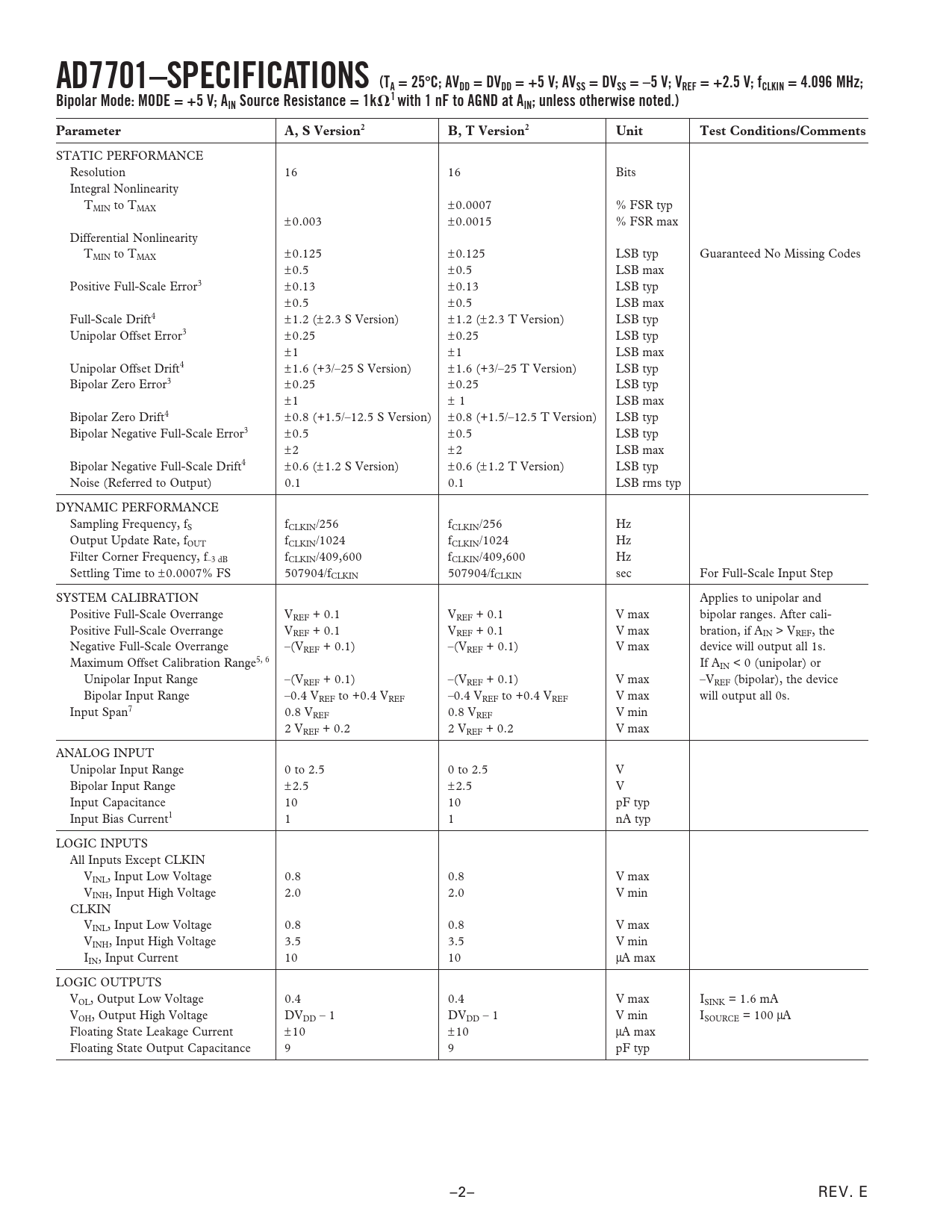 AD7701–SPECIFICATIONS (TA = 25C; AVDD = DVDD = +5 V; AVSS = DVSS = –5 V; VREF = +2.5 V; fCLKIN = 4.096 MHz;Bipolar Mode: MODE = +5 V; AIN Source Resistance = 1k1 with 1 nF to AGND at AIN; unless otherwise noted.)ParameterA, S Version2B, T Version2UnitTest Conditions/Comments STATIC PERFORMANCE Resolution 16 16 Bits Integral Nonlinearity TMIN to TMAX ±0.0007 % FSR typ ±0.003 ±0.0015 % FSR max Differential Nonlinearity T ± MIN to TMAX 0.125 ±0.125 LSB typ Guaranteed No Missing Codes ±0.5 ±0.5 LSB max Positive Full-Scale Error3 ±0.13 ±0.13 LSB typ ±0.5 ±0.5 LSB max Full-Scale Drift4 ±1.2 (±2.3 S Version) ±1.2 (±2.3 T Version) LSB typ Unipolar Offset Error3 ±0.25 ±0.25 LSB typ ±1 ±1 LSB max Unipolar Offset Drift4 ±1.6 (+3/–25 S Version) ±1.6 (+3/–25 T Version) LSB typ Bipolar Zero Error3 ±0.25 ±0.25 LSB typ ±1 ± 1 LSB max Bipolar Zero Drift4 ±0.8 (+1.5/–12.5 S Version) ±0.8 (+1.5/–12.5 T Version) LSB typ Bipolar Negative Full-Scale Error3 ±0.5 ±0.5 LSB typ ±2 ±2 LSB max Bipolar Negative Full-Scale Drift4 ±0.6 (±1.2 S Version) ±0.6 (±1.2 T Version) LSB typ Noise (Referred to Output) 0.1 0.1 LSB rms typ DYNAMIC PERFORMANCE Sampling Frequency, fS fCLKIN/256 fCLKIN/256 Hz Output Update Rate, fOUT fCLKIN/1024 fCLKIN/1024 Hz Filter Corner Frequency, f–3 dB fCLKIN/409,600 fCLKIN/409,600 Hz Settling Time to ± 0.0007% FS 507904/fCLKIN 507904/fCLKIN sec For Full-Scale Input Step SYSTEM CALIBRATION Applies to unipolar and Positive Full-Scale Overrange VREF + 0.1 VREF + 0.1 V max bipolar ranges. After cali- Positive Full-Scale Overrange VREF + 0.1 VREF + 0.1 V max bration, if AIN > VREF, the Negative Full-Scale Overrange –(VREF + 0.1) –(VREF + 0.1) V max device will output all 1s. Maximum Offset Calibration Range5, 6 If AIN < 0 (unipolar) or Unipolar Input Range –(VREF + 0.1) –(VREF + 0.1) V max –VREF (bipolar), the device Bipolar Input Range –0.4 VREF to +0.4 VREF –0.4 VREF to +0.4 VREF V max will output all 0s. Input Span7 0.8 VREF 0.8 VREF V min 2 VREF + 0.2 2 VREF + 0.2 V max ANALOG INPUT Unipolar Input Range 0 to 2.5 0 to 2.5 V Bipolar Input Range ±2.5 ±2.5 V Input Capacitance 10 10 pF typ Input Bias Current1 1 1 nA typ LOGIC INPUTS All Inputs Except CLKIN VINL, Input Low Voltage 0.8 0.8 V max VINH, Input High Voltage 2.0 2.0 V min CLKIN VINL, Input Low Voltage 0.8 0.8 V max VINH, Input High Voltage 3.5 3.5 V min IIN, Input Current 10 10 µA max LOGIC OUTPUTS VOL, Output Low Voltage 0.4 0.4 V max ISINK = 1.6 mA VOH, Output High Voltage DVDD – 1 DVDD – 1 V min ISOURCE = 100 µA Floating State Leakage Current ±10 ±10 µA max Floating State Output Capacitance 9 9 pF typ –2– REV. E Document Outline FEATURES APPLICATIONS GENERAL DESCRIPTION FUNCTIONAL BLOCK DIAGRAM PRODUCT HIGHLIGHTS SPECIFICATIONS ABSOLUTE MAXIMUM RATINGS ORDERING GUIDE PIN CONFIGURATIONS PIN FUNCTION DESCRIPTIONS TIMING CHARACTERISTICS DEFINITION OF TERMS Linearity Error Differential Linearity Error Positive Full-Scale Error Unipolar Offset Error Bipolar Zero Error Bipolar Negative Full-Scale Error Positive Full-Scale Overrange Negative Full-Scale Overrange Offset Calibration Range Full-Scale Calibration Range Input Span GENERAL DESCRIPTION THEORY OF OPERATION DIGITAL FILTERING FILTER CHARACTERISTICS USING THE AD7701 SYSTEM DESIGN CONSIDERATIONS CLOCKING ANALOG INPUT RANGES INPUT SIGNAL CONDITIONING Source Resistance Antialias Considerations VOLTAGE REFERENCE CONNECTIONS GROUNDING AND SUPPLY DECOUPLING ACCURACY AND AUTOCALIBRATION CALIBRATION RANGE POWER-UP AND CALIBRATION POWER SUPPLY SEQUENCING GROUNDING SINGLE-SUPPLY OPERATION SLEEP MODE DIGITAL INTERFACE Synchronous Self-Clocking Mode (SSC) Synchronous External Clock Mode (SEC) Asynchronous Communications (AC) Mode DIGITAL NOISE AND OUTPUT LOADING OUTLINE DIMENSIONS Revision History