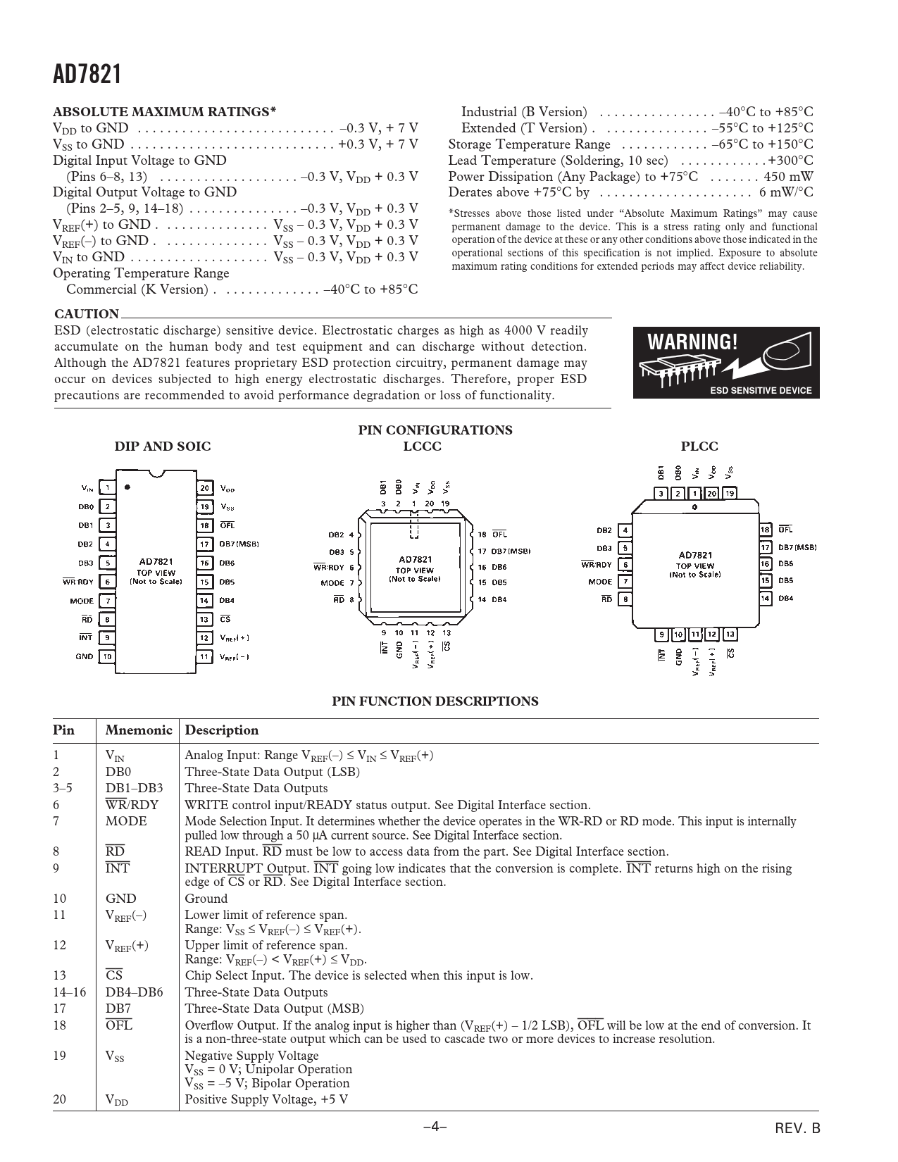 AD7821. ABSOLUTE MAXIMUM RATINGS*. CAUTION. WARNING!. ESD SENSITIVE DEVICE. PIN CONFIGURATIONS. DIP AND SOIC. LCCC. PLCC