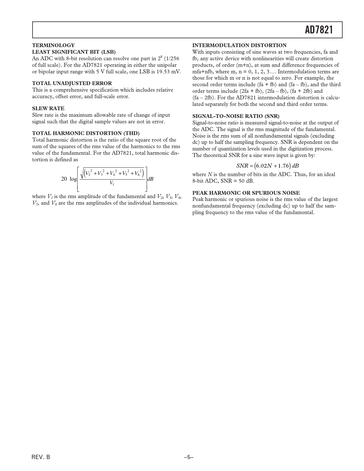 AD7821TERMINOLOGYINTERMODULATION DISTORTIONLEAST SIGNIFICANT BIT (LSB) With inputs consisting of sine waves at two frequencies, fa and An ADC with 8-bit resolution can resolve one part in 28 (1/256 fb, any active device with nonlinearities will create distortion of full scale). For the AD7821 operating in either the unipolar products, of order (m+n), at sum and difference frequencies of or bipolar input range with 5 V full scale, one LSB is 19.53 mV. mfa+nfb, where m, n = 0, 1, 2, 3…. Intermodulation terms are those for which m or n is not equal to zero. For example, the TOTAL UNADJUSTED ERROR second order terms include (fa + fb) and (fa – fb), and the third This is a comprehensive specification which includes relative order terms include (2fa + fb), (2fa – fb), (fa + 2fb) and accuracy, offset error, and full-scale error. (fa – 2fb). For the AD7821 intermodulation distortion is calcu- lated separately for both the second and third order terms. SLEW RATE Slew rate is the maximum allowable rate of change of input SIGNAL-TO-NOISE RATIO (SNR) signal such that the digital sample values are not in error. Signal-to-noise ratio is measured signal-to-noise at the output of the ADC. The signal is the rms magnitude of the fundamental. TOTAL HARMONIC DISTORTION (THD) Noise is the rms sum of all nonfundamental signals (excluding Total harmonic distortion is the ratio of the square root of the dc) up to half the sampling frequency. SNR is dependent on the sum of the squares of the rms value of the harmonics to the rms number of quantization levels used in the digitization process. value of the fundamental. For the AD7821, total harmonic dis- The theoretical SNR for a sine wave input is given by: tortion is defined as SNR = 6 0 . 2N ( + 1 7 . 6 dB ) 2 2 2 2 2 V + V + V + V + V ( ) 2 3 4 5 6 where N is the number of bits in the ADC. Thus, for an ideal 20 log dB V 8-bit ADC, SNR = 50 dB. 1 PEAK HARMONIC OR SPURIOUS NOISE where V1 is the rms amplitude of the fundamental and V2, V3, V4, Peak harmonic or spurious noise is the rms value of the largest V5, and V6 are the rms amplitudes of the individual harmonics. nonfundamental frequency (excluding dc) up to half the sam- pling frequency to the rms value of the fundamental. REV. B –5– Document Outline FEATURES GENERAL DESCRIPTION FUNCTIONAL BLOCK DIAGRAM PRODUCT HIGHLIGHTS SPECIFICATIONS Test Circuits ORDERING GUIDE ABSOLUTE MAXIMUM RATINGS PIN CONFIGURATIONS PIN FUNCTION DESCRIPTIONS TERMINOLOGY LEAST SIGNIFICANT BIT (LSB) TOTAL UNADJUSTED ERROR SLEW RATE TOTAL HARMONIC DISTORTION INTERMODULATION DISTORTION SIGNAL-TO-NOISE RATIO PEAK HARMONIC OR SPURIOUS NOISE Typical Performance Characteristics CIRCUIT INFORMATION BASIC DESCRIPTION OPERATING SEQUENCE REFERENCE AND INPUT INPUT CURRENT INPUT TRANSIENTS INHERENT TRACK-AND-HOLD SINUSOIDAL INPUTS DIGITAL SIGNAL PROCESSING APPLICATIONS SIGNAL-TO-NOISE RATIO AND DISTORTION EFFECTIVE NUMBER OF BITS INTERMODULATION DISTORTION HISTOGRAM PLOT DIGITAL INTERFACE RD Mode (MODE = 0) WR-RD Mode (MODE = 1) MICROPROCESSOR INTERFACING AD7821 – 68008 INTERFACE AD7821 – 8088 INTERFACE AD7821 – TMS32010 INTERFACE AD7821 – 8051 INTERFACE APPLYING THE AD7821 UNIPOLAR OPERATION BIPOLAR OPERATION 16-CHANNEL TELECOM A/D CONVERTER SIMULTANEOUS SAMPLING ADCS OUTLINE DIMENSIONS Revision History