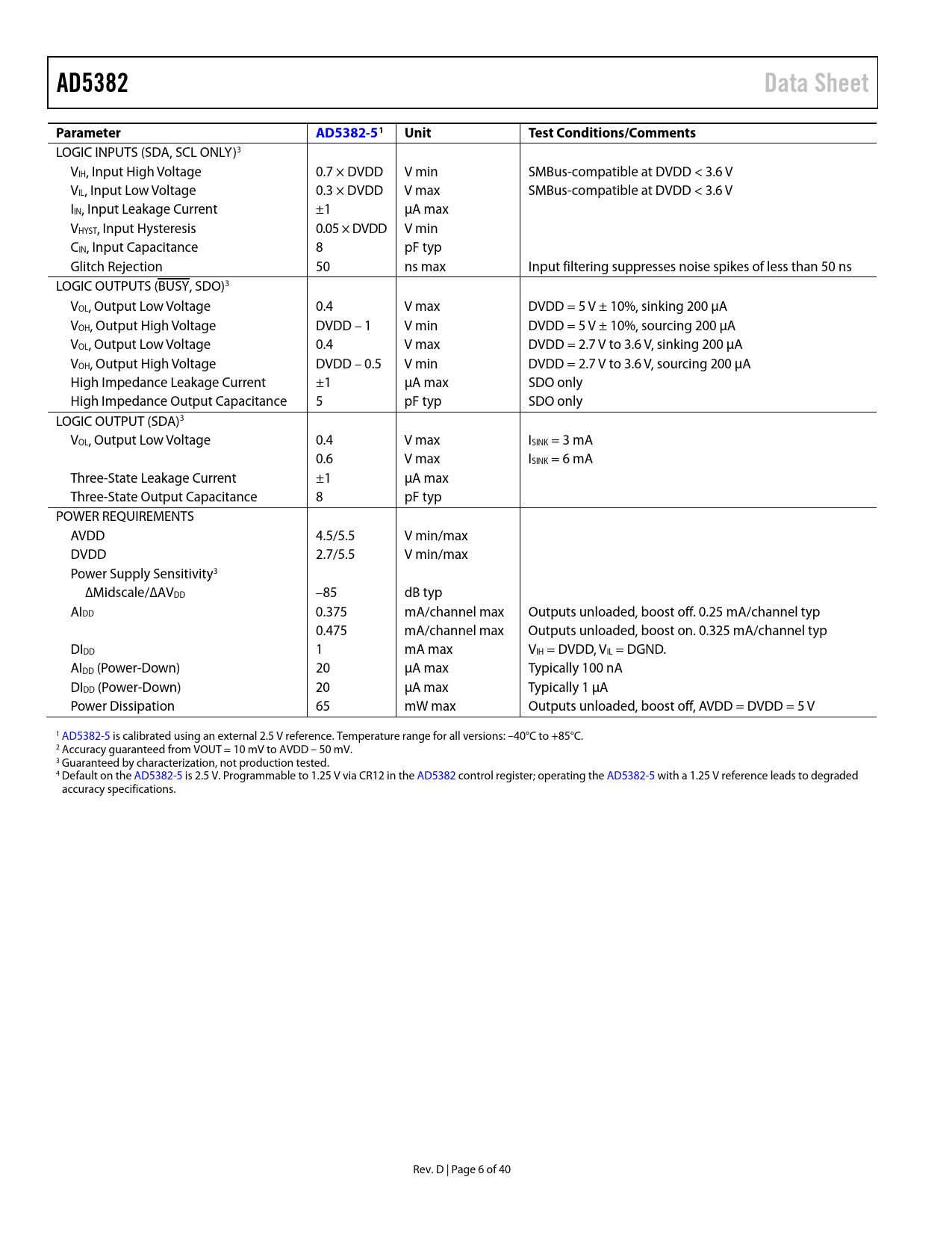 LOGIC INPUTS (SDA, SCL ONLY)3 VIH, Input High Voltage 0.7 × DVDD V min SMBus-compatible at DVDD < 3.6 V VIL, Input Low Voltage 0.3 × DVDD V max SMBus-compatible at DVDD < 3.6 V IIN, Input Leakage Current ±1 µA max VHYST, Input Hysteresis 0.05 × DVDD V min CIN, Input Capacitance 8 pF typ Glitch Rejection 50 ns max Input filtering suppresses noise spikes of less than 50 ns LOGIC OUTPUTS (BUSY, SDO)3 VOL, Output Low Voltage 0.4 V max DVDD = 5 V ± 10%, sinking 200 µA VOH, Output High Voltage DVDD – 1 V min DVDD = 5 V ± 10%, sourcing 200 µA VOL, Output Low Voltage 0.4 V max DVDD = 2.7 V to 3.6 V, sinking 200 µA VOH, Output High Voltage DVDD – 0.5 V min DVDD = 2.7 V to 3.6 V, sourcing 200 µA High Impedance Leakage Current ±1 µA max SDO only High Impedance Output Capacitance 5 pF typ SDO only LOGIC OUTPUT (SDA)3 VOL, Output Low Voltage 0.4 V max ISINK = 3 mA 0.6 V max ISINK = 6 mA Three-State Leakage Current ±1 µA max Three-State Output Capacitance 8 pF typ POWER REQUIREMENTS AVDD 4.5/5.5 V min/max DVDD 2.7/5.5 V min/max Power Supply Sensitivity3 ∆Midscale/∆ΑVDD –85 dB typ AIDD 0.375 mA/channel max Outputs unloaded, boost off. 0.25 mA/channel typ 0.475 mA/channel max Outputs unloaded, boost on. 0.325 mA/channel typ DIDD 1 mA max VIH = DVDD, VIL = DGND. AIDD (Power-Down) 20 µA max Typically 100 nA DIDD (Power-Down) 20 µA max Typically 1 µA Power Dissipation 65 mW max Outputs unloaded, boost off, AVDD = DVDD = 5 V 1 AD5382-5 is calibrated using an external 2.5 V reference. Temperature range for all versions: –40°C to +85°C. 2 Accuracy guaranteed from VOUT = 10 mV to AVDD – 50 mV. 3 Guaranteed by characterization, not production tested. 4 Default on the AD5382-5 is 2.5 V. Programmable to 1.25 V via CR12 in the AD5382 control register; operating the AD5382-5 with a 1.25 V reference leads to degraded accuracy specifications. Rev. D | Page 6 of 40 Document Outline Features Integrated Functions Applications Functional Block Diagram Table of Contents Revision History General Description Specifications AD5382-5 Specifications AD5382-3 Specifications AC Characteristics Timing Characteristics SPI-, QSPI-, MICROWIRE-, or DSP-Compatible Serial Interface I2C Serial Interface Parallel Interface Absolute Maximum Ratings ESD Caution Pin Configuration and Function Descriptions Terminology Typical Performance Characteristics Functional Description DAC Architecture—General Data Decoding On-Chip Special Function Registers (SFR) SFR Commands NOP (No Operation) Write Clear Code Soft Clear Soft Power-Down Soft Power-Up Soft RESET Control Register Write/Read Control Register Contents Channel Monitor Function Hardware Functions Reset Function Asynchronous Clear Function BUSY\ and LDAC\ Functions FIFO Operation in Parallel Mode Power-On Reset Power-Down AD5382 Interfaces DSP-, SPI-, MICROWIRE-Compatible Serial Interfaces Standalone Mode Daisy-Chain Mode Readback Mode I2C Serial Interface I2C Data Transfer Start and Stop Conditions Repeated Start Conditions Acknowledge Bit (ACK) AD5382 Slave Addresses Write Operation 4-Byte Mode 3-Byte Mode 2-Byte Mode Parallel Interface CS\ Pin WR\ Pin REG0, REG1 Pins Pins A4 to A0 Pins DB13 to DB0 Microprocessor Interfacing Parallel Interface AD5382 to MC68HC11 AD5382 to PIC16C6x/7x AD5382 to 8051 AD5382 to ADSP-BF527 Applications Information Power Supply Decoupling Power Supply Sequencing Typical Configuration Circuit Monitor Function Toggle Mode Function Thermal Monitor Function AD5382 in a MEMS-Based Optical Switch Optical Attenuators Outline Dimensions Ordering Guide