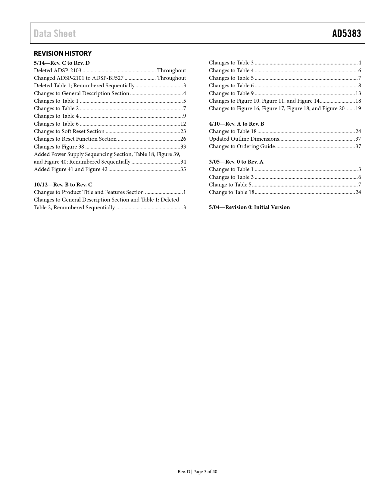 Páginas / Página41 / 4 — Data Sheet. AD5383. REVISION HISTORY. 5/14—Rev. C to Rev. D. 4/10—Rev. A …