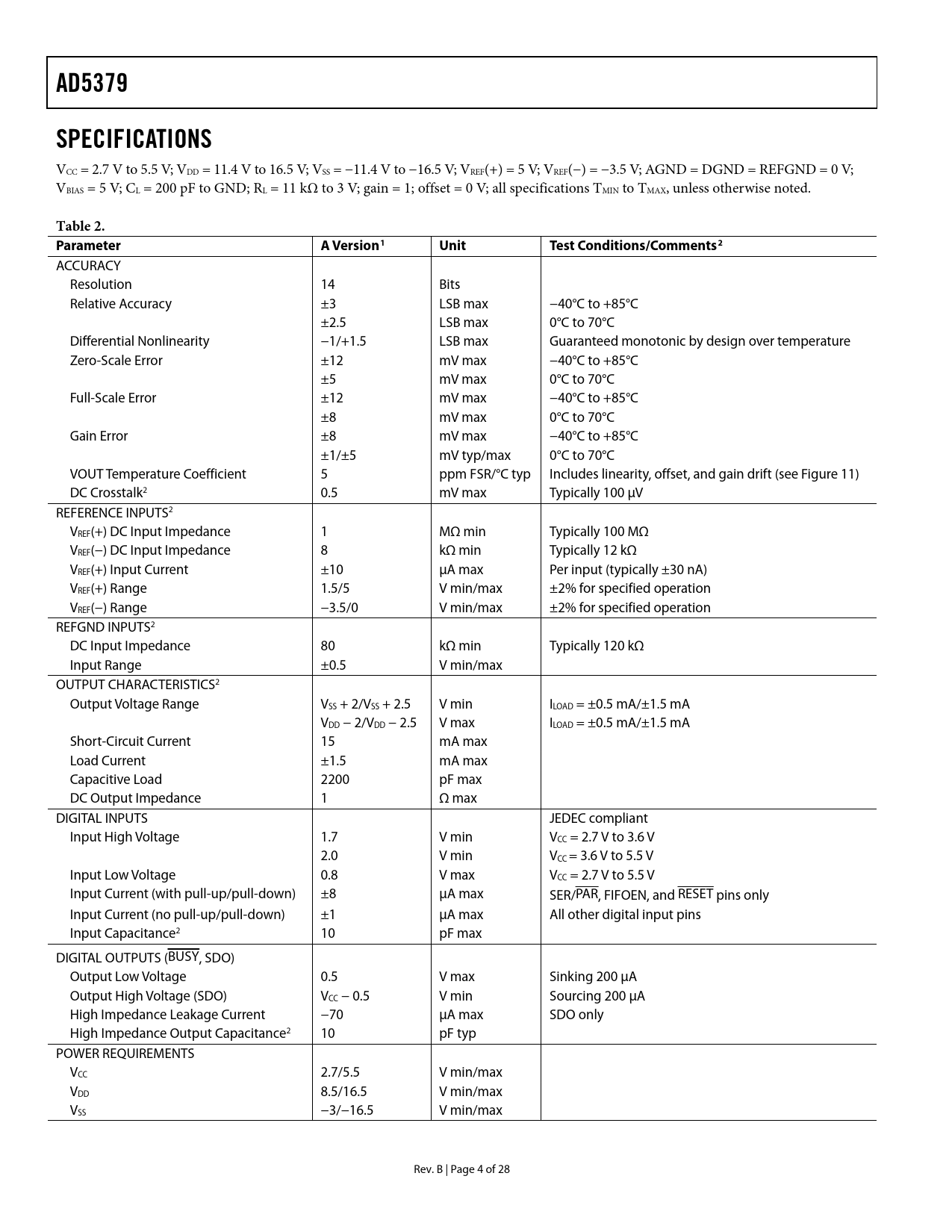 AD5379 SPECIFICATIONS Table 2 Parameter A Version1 Unit Test Conditions/Comments2