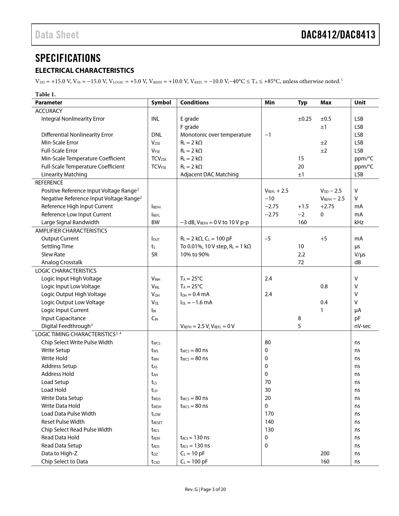 Data Sheet DAC8412/DAC8413 SPECIFICATIONS ELECTRICAL CHARACTERISTICS
