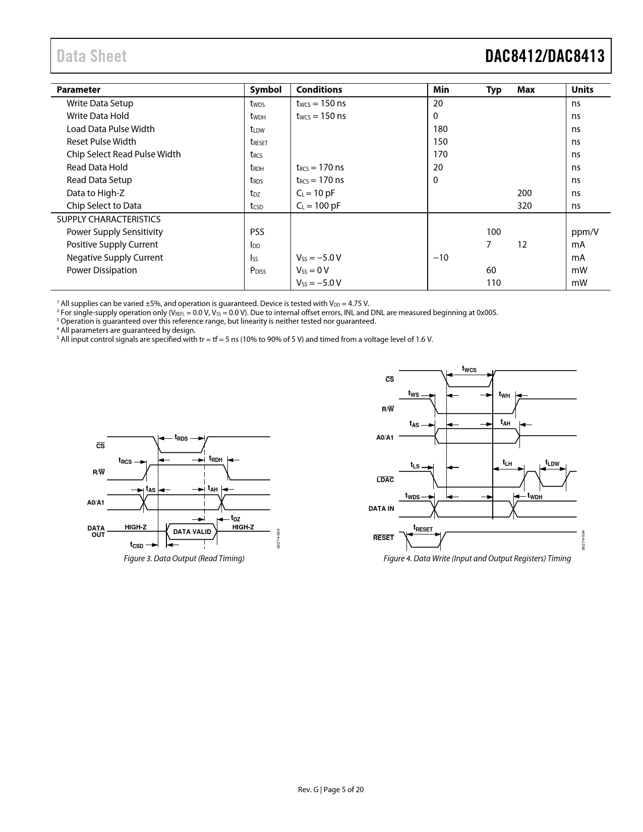 Write Data Setup tWDS tWCS = 150 ns 20 ns Write Data Hold tWDH tWCS = 150 ns 0 ns Load Data Pulse Width tLDW 180 ns Reset Pulse Width tRESET 150 ns Chip Select Read Pulse Width tRCS 170 ns Read Data Hold tRDH tRCS = 170 ns 20 ns Read Data Setup tRDS tRCS = 170 ns 0 ns Data to High-Z tDZ CL = 10 pF 200 ns Chip Select to Data tCSD CL = 100 pF 320 ns SUPPLY CHARACTERISTICS Power Supply Sensitivity PSS 100 ppm/V Positive Supply Current IDD 7 12 mA Negative Supply Current ISS VSS = −5.0 V −10 mA Power Dissipation PDISS VSS = 0 V 60 mW VSS = −5.0 V 110 mW 1 All supplies can be varied ±5%, and operation is guaranteed. Device is tested with VDD = 4.75 V. 2 For single-supply operation only (VREFL = 0.0 V, VSS = 0.0 V). Due to internal offset errors, INL and DNL are measured beginning at 0x005. 3 Operation is guaranteed over this reference range, but linearity is neither tested nor guaranteed. 4 All parameters are guaranteed by design. 5 All input control signals are specified with tr = tf = 5 ns (10% to 90% of 5 V) and timed from a voltage level of 1.6 V.