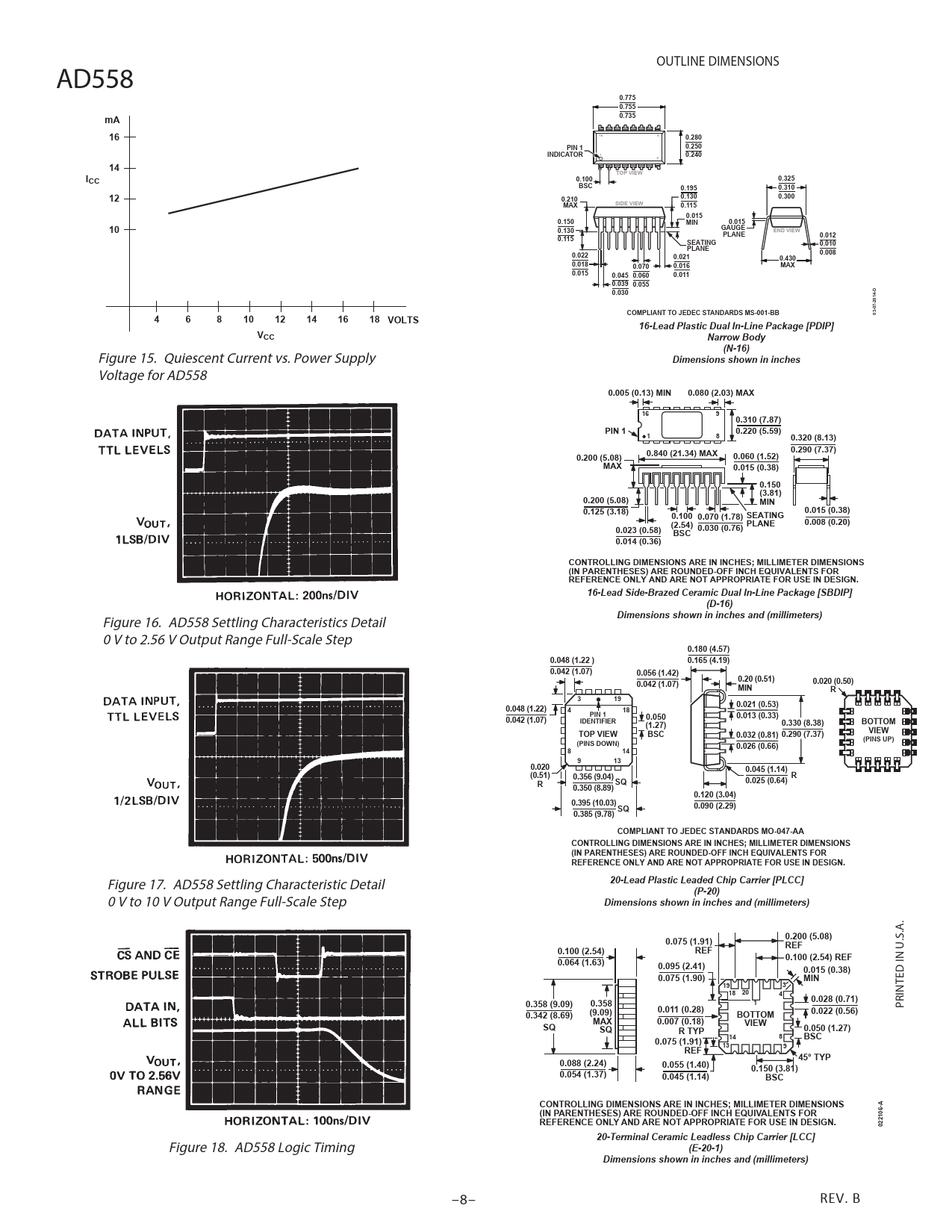 OUTLINE DIMENSIONSAD5580.7750.755mA0.735161690.2800.250PIN 11INDICATOR0.240814ITOP VIEWCC0.1000.325BSC0.1950.310120.1300.2100.300MAXSIDE VIEW0.1150.0150.150MIN0.015100.130GAUGEEND VIEW0.115PLANE0.012SEATING0.010PLANE0.0220.0210.0080.4300.0180.0700.016MAX0.0150.045 0.0600.0110.039 0.0550.030COMPLIANT TO JEDEC STANDARDS MS-001-BB468101214161803-07-2014-DVOLTS16-Lead Plastic Dual In-Line Package [PDIP]VCCNarrow Body(N-16) Figure 15. Quiescent Current vs. Power Supply Dimensions shown in inches Voltage for AD558 0.005 (0.13) MIN0.080 (2.03) MAX1690.310 (7.87)PIN 10.220 (5.59)180.320 (8.13)0.290 (7.37)0.200 (5.08)0.840 (21.34) MAX0.060 (1.52)MAX0.015 (0.38)0.150(3.81)0.200 (5.08)MIN0.125 (3.18)0.015 (0.38)0.100 0.070 (1.78) SEATING(2.54)PLANE0.008 (0.20)0.023 (0.58)0.030 (0.76)BSC0.014 (0.36)CONTROLLING DIMENSIONS ARE IN INCHES; MILLIMETER DIMENSIONS(IN PARENTHESES) ARE ROUNDED-OFF INCH EQUIVALENTS FORREFERENCE ONLY AND ARE NOT APPROPRIATE FOR USE IN DESIGN.16-Lead Side-Brazed Ceramic Dual In-Line Package [SBDIP](D-16) Figure 16. AD558 Settling Characteristics Detail Dimensions shown in inches and (millimeters) 0 V to 2.56 V Output Range Full-Scale Step 0.180 (4.57)0.048 (1.22 )0.165 (4.19)0.042 (1.07)0.056 (1.42)0.020 (0.50)0.042 (1.07)0.20 (0.51)MINR3190.021 (0.53)0.048 (1.22)418PIN 10.0500.013 (0.33)0.042 (1.07)IDENTIFIER0.330 (8.38)BOTTOM(1.27)VIEWTOP VIEWBSC0.032 (0.81) 0.290 (7.37)(PINS UP)(PINS DOWN)0.026 (0.66)8149130.0200.045 (1.14)(0.51)0.356 (9.04)R0.025 (0.64) R0.350 (8.89) SQ0.120 (3.04)0.395 (10.03)0.090 (2.29)0.385 (9.78) SQCOMPLIANT TO JEDEC STANDARDS MO-047-AACONTROLLING DIMENSIONS ARE IN INCHES; MILLIMETER DIMENSIONS(IN PARENTHESES) ARE ROUNDED-OFF INCH EQUIVALENTS FORREFERENCE ONLY AND ARE NOT APPROPRIATE FOR USE IN DESIGN. Figure 17. AD558 Settling Characteristic Detail 20-Lead Plastic Leaded Chip Carrier [PLCC](P-20) 0 V to 10 V Output Range Full-Scale Step Dimensions shown in inches and (millimeters) . .A 0.200 (5.08) .S 0.075 (1.91)REF0.100 (2.54)REF U 0.100 (2.54) REF0.064 (1.63) IN 0.095 (2.41)0.015 (0.38)0.075 (1.90)MIN TED 19318 204 IN 0.35810.028 (0.71)0.358 (9.09) PR 0.011 (0.28)0.342 (8.69)(9.09)BOTTOM0.022 (0.56)MAX0.007 (0.18)VIEWSQSQ0.050 (1.27)R TYP148BSC0.075 (1.91)139REF45° TYP0.088 (2.24)0.055 (1.40)0.150 (3.81)0.054 (1.37)0.045 (1.14)BSCCONTROLLING DIMENSIONS ARE IN INCHES; MILLIMETER DIMENSIONS(IN PARENTHESES) ARE ROUNDED-OFF INCH EQUIVALENTS FORREFERENCE ONLY AND ARE NOT APPROPRIATE FOR USE IN DESIGN.022106-A20-Terminal Ceramic Leadless Chip Carrier [LCC] Figure 18. AD558 Logic Timing (E-20-1)Dimensions shown in inches and (millimeters) –8– REV. B
