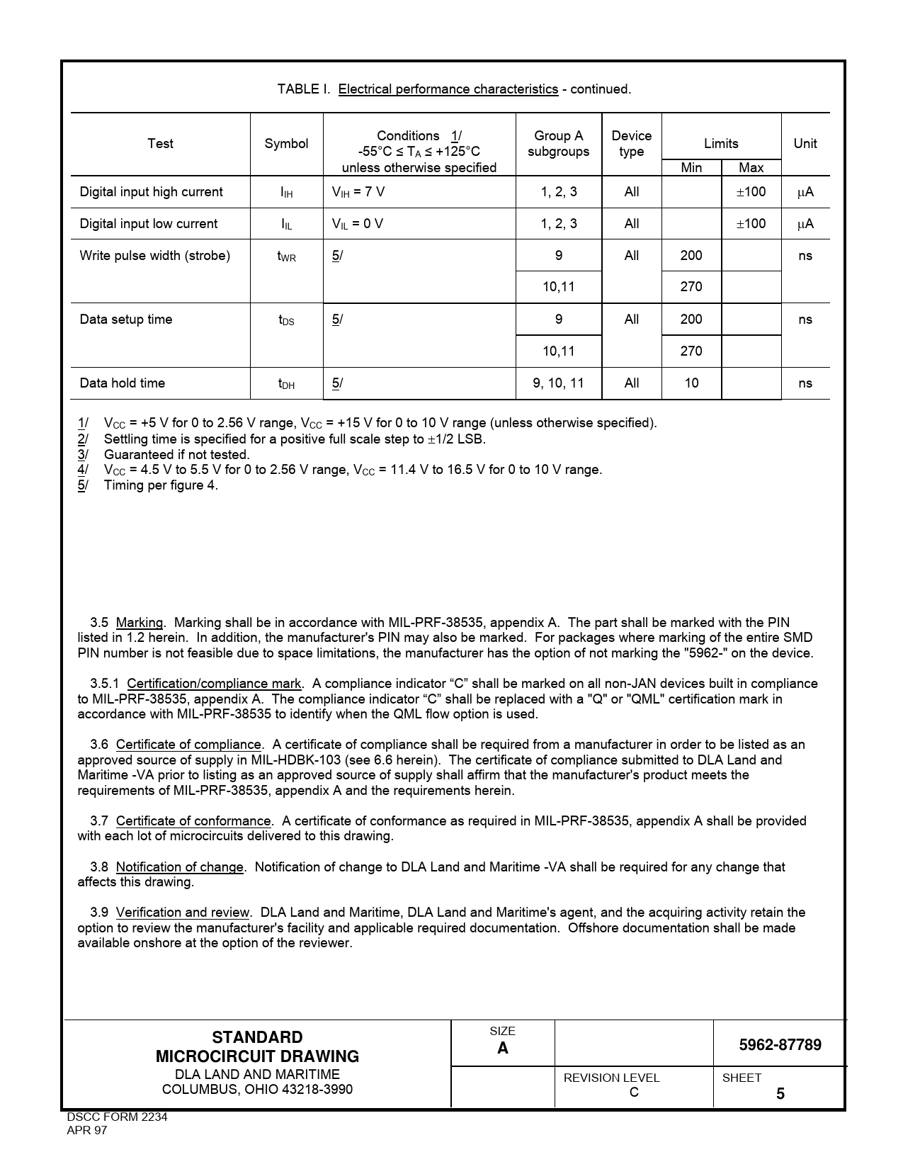 TABLE I. Electrical performance characteristics - continued. Conditions 1/ Group A Device Test Symbol Limits Unit -55°C ≤ TA ≤ +125°C subgroups type unless otherwise specified Min Max Digital input high current IIH VIH = 7 V 1, 2, 3 All 100 A Digital input low current IIL VIL = 0 V 1, 2, 3 All 100 A Write pulse width (strobe) tWR 5/ 9 All 200 ns 10,11 270 Data setup time tDS 5/ 9 All 200 ns 10,11 270 Data hold time tDH 5/ 9, 10, 11 All 10 ns 1/ VCC = +5 V for 0 to 2.56 V range, VCC = +15 V for 0 to 10 V range (unless otherwise specified). 2/ Settling time is specified for a positive full scale step to 1/2 LSB. 3/ Guaranteed if not tested. 4/ VCC = 4.5 V to 5.5 V for 0 to 2.56 V range, VCC = 11.4 V to 16.5 V for 0 to 10 V range. 5/ Timing per figure 4. 3.5 Marking. Marking shall be in accordance with MIL-PRF-38535, appendix A. The part shall be marked with the PIN listed in 1.2 herein. In addition, the manufacturer's PIN may also be marked. For packages where marking of the entire SMD PIN number is not feasible due to space limitations, the manufacturer has the option of not marking the "5962-" on the device. 3.5.1 Certification/compliance mark. A compliance indicator “C” shall be marked on all non-JAN devices built in compliance to MIL-PRF-38535, appendix A. The compliance indicator “C” shall be replaced with a "Q" or "QML" certification mark in accordance with MIL-PRF-38535 to identify when the QML flow option is used. 3.6 Certificate of compliance. A certificate of compliance shall be required from a manufacturer in order to be listed as an approved source of supply in MIL-HDBK-103 (see 6.6 herein). The certificate of compliance submitted to DLA Land and Maritime -VA prior to listing as an approved source of supply shall affirm that the manufacturer's product meets the requirements of MIL-PRF-38535, appendix A and the requirements herein. 3.7 Certificate of conformance. A certificate of conformance as required in MIL-PRF-38535, appendix A shall be provided with each lot of microcircuits delivered to this drawing. 3.8 Notification of change. Notification of change to DLA Land and Maritime -VA shall be required for any change that affects this drawing. 3.9 Verification and review. DLA Land and Maritime, DLA Land and Maritime's agent, and the acquiring activity retain the option to review the manufacturer's facility and applicable required documentation. Offshore documentation shall be made available onshore at the option of the reviewer. SIZE STANDARDA5962-87789MICROCIRCUIT DRAWING DLA LAND AND MARITIME REVISION LEVEL SHEET COLUMBUS, OHIO 43218-3990 C 5 DSCC FORM 2234 APR 97