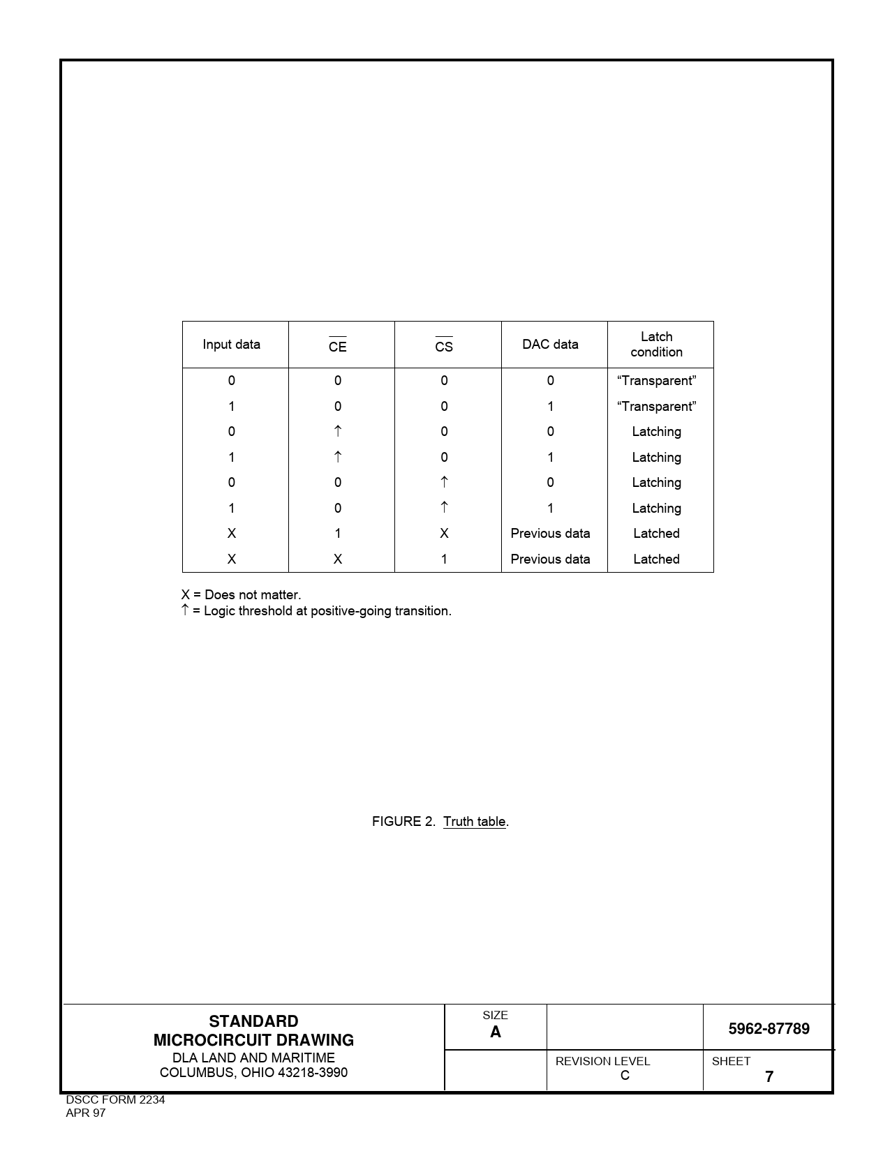 Latch Input data CE CS DAC data condition 0 0 0 0 “Transparent” 1 0 0 1 “Transparent” 0  0 0 Latching 1  0 1 Latching 0 0  0 Latching 1 0  1 Latching X 1 X Previous data Latched X X 1 Previous data Latched X = Does not matter.  = Logic threshold at positive-going transition. FIGURE 2. Truth table. SIZE