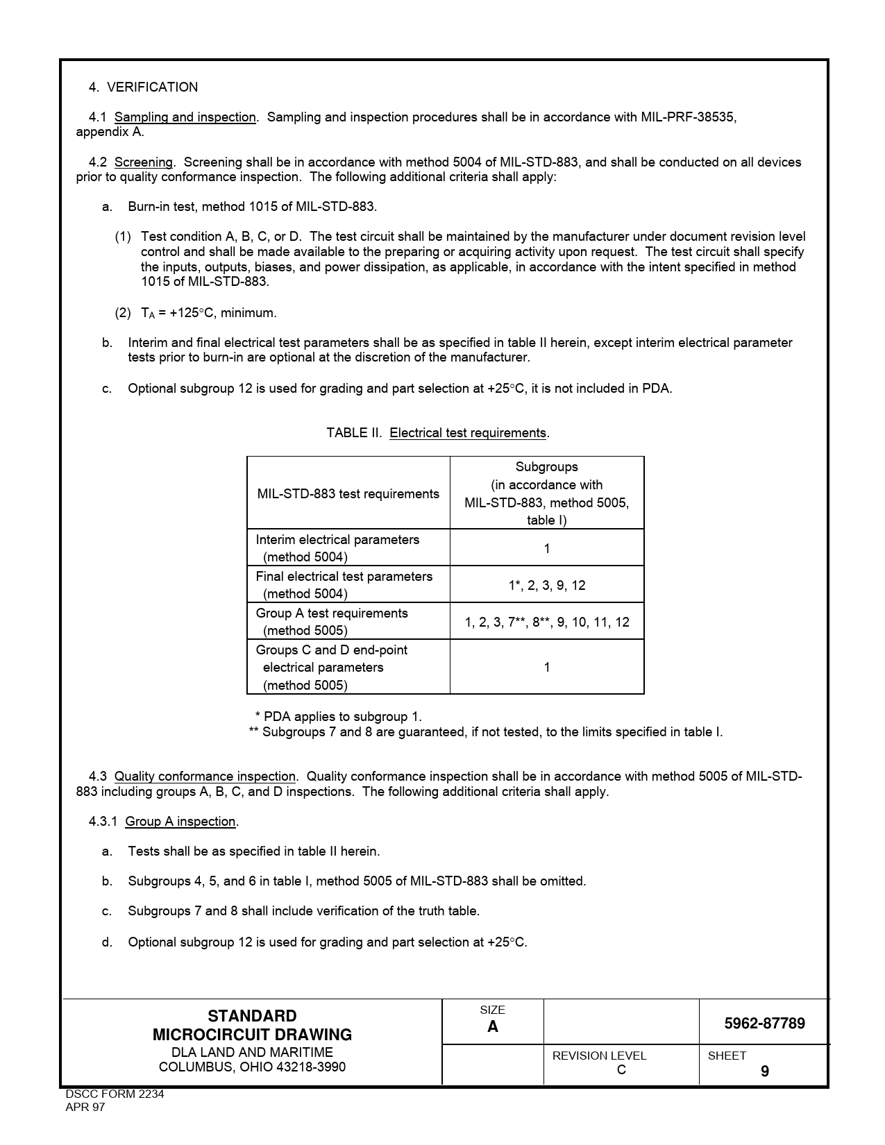 4. VERIFICATION 4.1 Sampling and inspection. Sampling and inspection procedures shall be in accordance with MIL-PRF-38535, appendix A. 4.2 Screening. Screening shall be in accordance with method 5004 of MIL-STD-883, and shall be conducted on all devices prior to quality conformance inspection. The following additional criteria shall apply: a. Burn-in test, method 1015 of MIL-STD-883. (1) Test condition A, B, C, or D. The test circuit shall be maintained by the manufacturer under document revision level control and shall be made available to the preparing or acquiring activity upon request. The test circuit shall specify the inputs, outputs, biases, and power dissipation, as applicable, in accordance with the intent specified in method 1015 of MIL-STD-883. (2) TA = +125C, minimum. b. Interim and final electrical test parameters shall be as specified in table II herein, except interim electrical parameter tests prior to burn-in are optional at the discretion of the manufacturer. c. Optional subgroup 12 is used for grading and part selection at +25C, it is not included in PDA. TABLE II. Electrical test requirements. Subgroups (in accordance with MIL-STD-883 test requirements MIL-STD-883, method 5005, table I) Interim electrical parameters 1 (method 5004) Final electrical test parameters 1*, 2, 3, 9, 12 (method 5004) Group A test requirements 1, 2, 3, 7**, 8**, 9, 10, 11, 12 (method 5005) Groups C and D end-point electrical parameters 1 (method 5005) * PDA applies to subgroup 1. ** Subgroups 7 and 8 are guaranteed, if not tested, to the limits specified in table I. 4.3 Quality conformance inspection. Quality conformance inspection shall be in accordance with method 5005 of MIL-STD- 883 including groups A, B, C, and D inspections. The following additional criteria shall apply. 4.3.1 Group A inspection. a. Tests shall be as specified in table II herein. b. Subgroups 4, 5, and 6 in table I, method 5005 of MIL-STD-883 shall be omitted. c. Subgroups 7 and 8 shall include verification of the truth table. d. Optional subgroup 12 is used for grading and part selection at +25C. SIZE STANDARDA5962-87789MICROCIRCUIT DRAWING DLA LAND AND MARITIME REVISION LEVEL SHEET COLUMBUS, OHIO 43218-3990 C 9 DSCC FORM 2234 APR 97