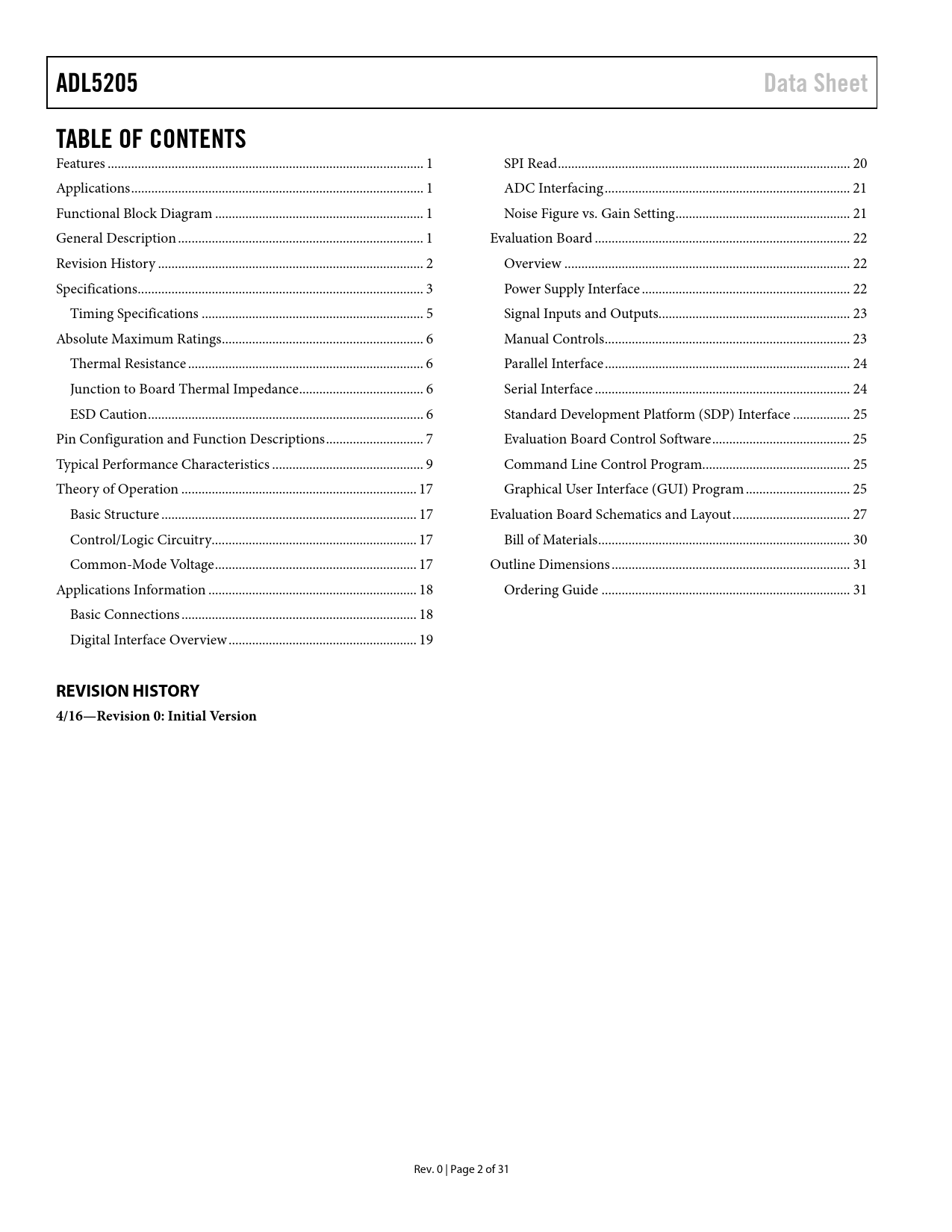 link to page 1 link to page 1 link to page 1 link to page 1 link to page 3 link to page 4 link to page 6 link to page 7 link to page 7 link to page 7 link to page 7 link to page 8 link to page 10 link to page 18 link to page 18 link to page 18 link to page 18 link to page 19 link to page 19 link to page 20 link to page 21 link to page 22 link to page 22 link to page 23 link to page 23 link to page 23 link to page 24 link to page 24 link to page 25 link to page 25 link to page 26 link to page 26 link to page 26 link to page 26 link to page 28 link to page 31 link to page 32 link to page 32 ADL5205Data SheetTABLE OF CONTENTS Features .. 1 SPI Read ... 20 Applications ... 1 ADC Interfacing ... 21 Functional Block Diagram .. 1 Noise Figure vs. Gain Setting .. 21 General Description ... 1 Evaluation Board .. 22 Revision History ... 2 Overview ... 22 Specifications ... 3 Power Supply Interface .. 22 Timing Specifications .. 5 Signal Inputs and Outputs... 23 Absolute Maximum Ratings .. 6 Manual Controls ... 23 Thermal Resistance .. 6 Parallel Interface ... 24 Junction to Board Thermal Impedance ... 6 Serial Interface .. 24 ESD Caution .. 6 Standard Development Platform (SDP) Interface ... 25 Pin Configuration and Function Descriptions ... 7 Evaluation Board Control Software ... 25 Typical Performance Characteristics ... 9 Command Line Control Program.. 25 Theory of Operation .. 17 Graphical User Interface (GUI) Program ... 25 Basic Structure .. 17 Evaluation Board Schematics and Layout ... 27 Control/Logic Circuitry ... 17 Bill of Materials ... 30 Common-Mode Voltage .. 17 Outline Dimensions ... 31 Applications Information .. 18 Ordering Guide .. 31 Basic Connections .. 18 Digital Interface Overview .. 19 REVISION HISTORY 4/16—Revision 0: Initial Version Rev. 0 | Page 2 of 31 Document Outline FEATURES APPLICATIONS FUNCTIONAL BLOCK DIAGRAM GENERAL DESCRIPTION REVISION HISTORY SPECIFICATIONS TIMING SPECIFICATIONS Timing Diagrams ABSOLUTE MAXIMUM RATINGS THERMAL RESISTANCE JUNCTION TO BOARD THERMAL IMPEDANCE ESD CAUTION PIN CONFIGURATION AND FUNCTION DESCRIPTIONS TYPICAL PERFORMANCE CHARACTERISTICS THEORY OF OPERATION BASIC STRUCTURE CONTROL/LOGIC CIRCUITRY COMMON-MODE VOLTAGE APPLICATIONS INFORMATION BASIC CONNECTIONS DIGITAL INTERFACE OVERVIEW Parallel Digital Interface Serial Peripheral Interface (SPI) Up/Down Interface SPI READ ADC INTERFACING NOISE FIGURE vs. GAIN SETTING EVALUATION BOARD OVERVIEW POWER SUPPLY INTERFACE SIGNAL INPUTS AND OUTPUTS MANUAL CONTROLS Mode Switches Channel Control Switches PARALLEL INTERFACE SERIAL INTERFACE STANDARD DEVELOPMENT PLATFORM (SDP) INTERFACE EVALUATION BOARD CONTROL SOFTWARE COMMAND LINE CONTROL PROGRAM GRAPHICAL USER INTERFACE (GUI) PROGRAM EVALUATION BOARD SCHEMATICS AND LAYOUT BILL OF MATERIALS OUTLINE DIMENSIONS ORDERING GUIDE