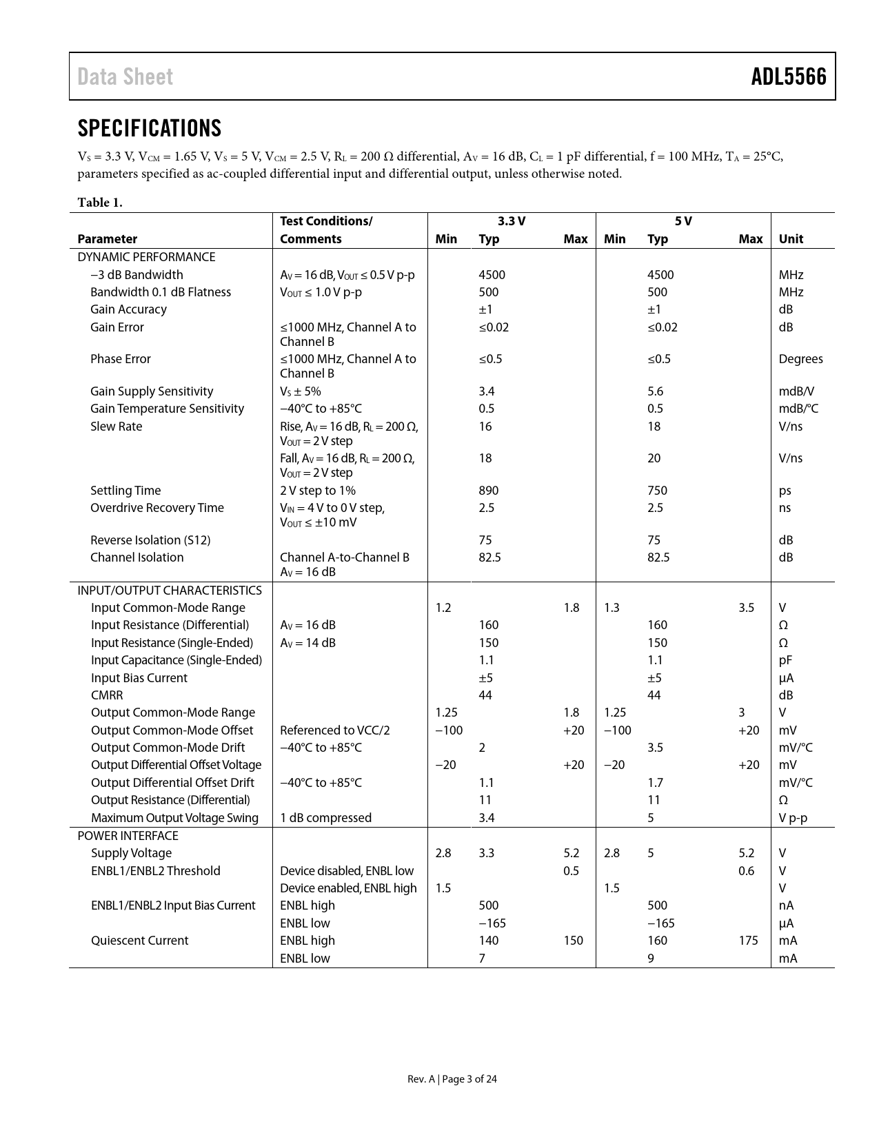 Data Sheet. ADL5566. SPECIFICATIONS. Table 1. Test Conditions/. 3.3 V. 5 V. Parameter. Comments. Min. Typ. Max Min. Max Unit