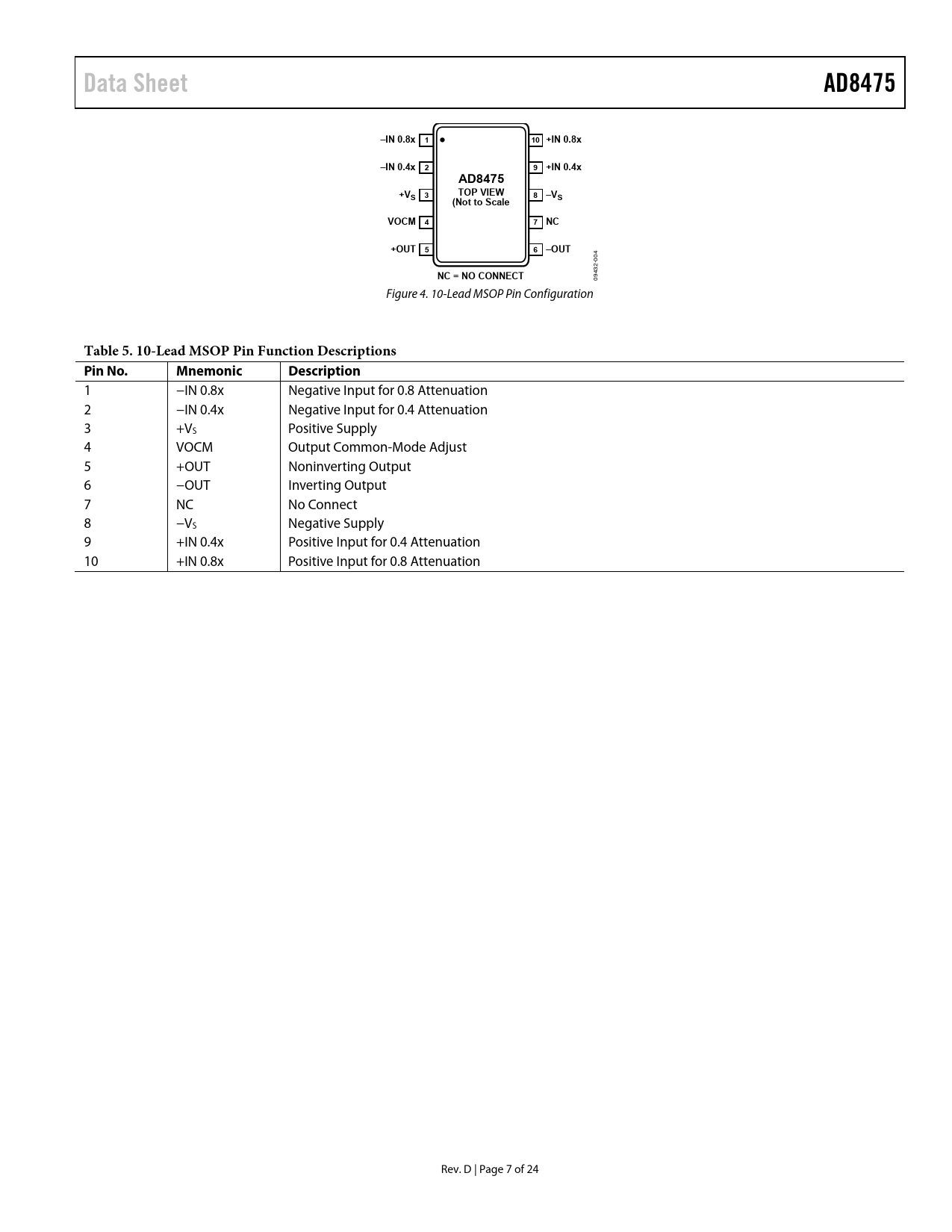 Data Sheet. AD8475. –IN 0.8x 1. 10 +IN 0.8x. –IN 0.4x 2. 9 +IN 0.4x. TOP VIEW. 8 –VS. (Not to Scale. VOCM 4. 7 NC. +OUT 5. 6 –OUT