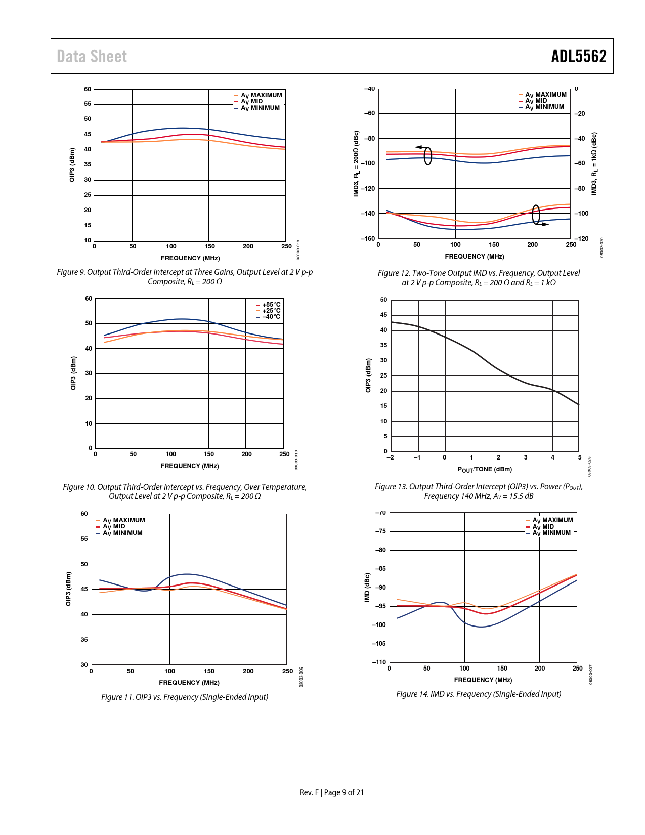 Data Sheet. ADL5562. –40. AV MAXIMUM. AV MID. AV MINIMUM. –60. –20. Bc). –80. Ω (. Bm) d. 200 –100. 3 (. D3, –120. D3,. –140. –100. –160. –120. 100. 150. 200. 250