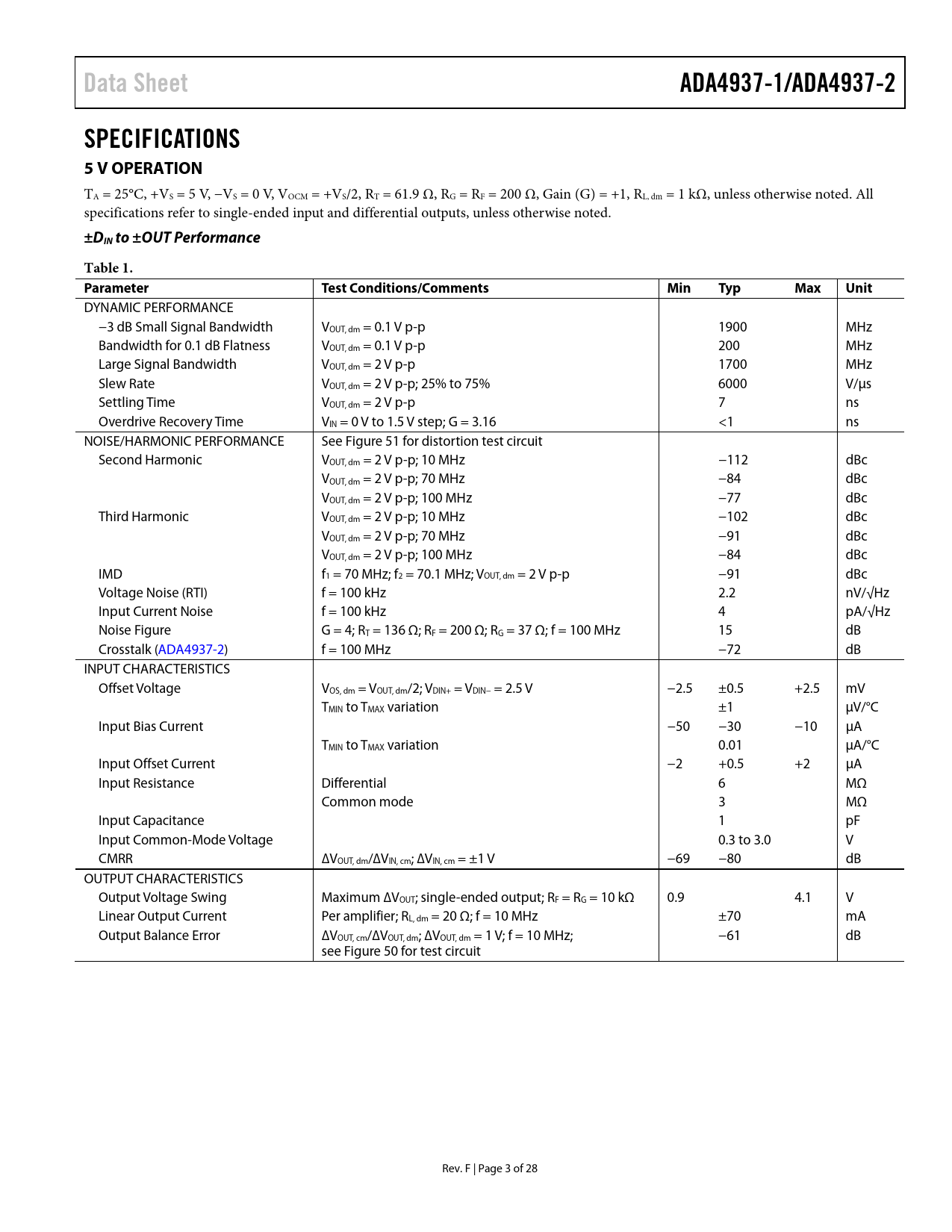 Data Sheet. ADA4937-1/ADA4937-2. SPECIFICATIONS 5 V OPERATION. ±DIN to ±OUT Performance. Table 1. Parameter
