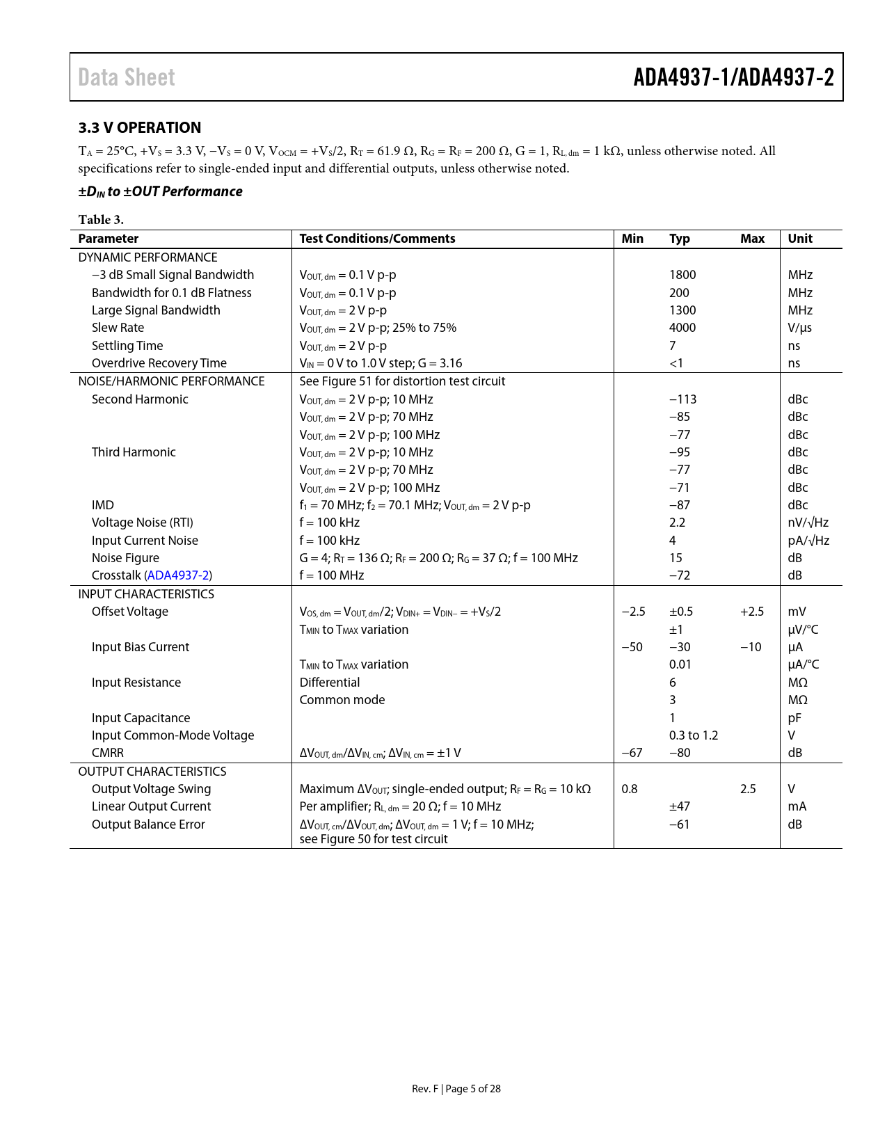Data Sheet ADA4937-1/ADA4937-2 3.3 V OPERATION ±DIN to ±OUT Performance Table 3 Parameter Test Conditions/Comments Min Typ Max