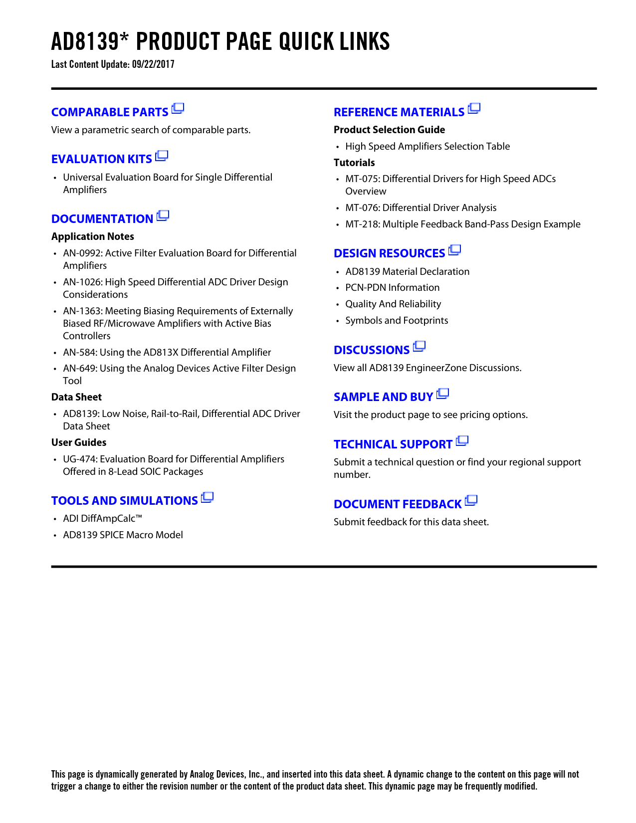 AD8139* PRODUCT PAGE QUICK LINKS Last Content Update: 09/22/2017COMPARABLE PARTSREFERENCE MATERIALS View a parametric search of comparable parts. Product Selection Guide • High Speed Amplifiers Selection Table EVALUATION KITSTutorials • Universal Evaluation Board for Single Differential • MT-075: Differential Drivers for High Speed ADCs Amplifiers Overview • MT-076: Differential Driver Analysis DOCUMENTATION • MT-218: Multiple Feedback Band-Pass Design Example Application Notes • AN-0992: Active Filter Evaluation Board for Differential DESIGN RESOURCES Amplifiers • AD8139 Material Declaration • AN-1026: High Speed Differential ADC Driver Design • PCN-PDN Information Considerations • Quality And Reliability • AN-1363: Meeting Biasing Requirements of Externally Biased RF/Microwave Amplifiers with Active Bias • Symbols and Footprints Controllers • AN-584: Using the AD813X Differential Amplifier DISCUSSIONS • AN-649: Using the Analog Devices Active Filter Design View all AD8139 EngineerZone Discussions. Tool Data SheetSAMPLE AND BUY • AD8139: Low Noise, Rail-to-Rail, Differential ADC Driver Visit the product page to see pricing options. Data Sheet User GuidesTECHNICAL SUPPORT • UG-474: Evaluation Board for Differential Amplifiers Submit a technical question or find your regional support Offered in 8-Lead SOIC Packages number. TOOLS AND SIMULATIONSDOCUMENT FEEDBACK • ADI DiffAmpCalc™ Submit feedback for this data sheet. • AD8139 SPICE Macro Model This page is dynamically generated by Analog Devices, Inc., and inserted into this data sheet. A dynamic change to the content on this page will not trigger a change to either the revision number or the content of the product data sheet. This dynamic page may be frequently modified. Document Outline FEATURES APPLICATIONS GENERAL DESCRIPTION FUNCTIONAL BLOCK DIAGRAMS TABLE OF CONTENTS REVISION HISTORY SPECIFICATIONS VS = ±5 V, VOCM = 0 V VS = 5 V, VOCM = 2.5 V ABSOLUTE MAXIMUM RATINGS THERMAL RESISTANCE Maximum Power Dissipation ESD CAUTION PIN CONFIGURATIONS AND FUNCTION DESCRIPTIONS TYPICAL PERFORMANCE CHARACTERISTICS TEST CIRCUITS THEORY OF OPERATION TYPICAL CONNECTION AND DEFINITION OF TERMS Output Balance APPLICATIONS INFORMATION ESTIMATING NOISE, GAIN, AND BANDWIDTH WITH MATCHED FEEDBACK NETWORKS Estimating Output Noise Voltage Voltage Gain Feedback Factor Notation Input Common-Mode Voltage Calculating Input Impedance Input Common-Mode Swing Considerations Bandwidth vs. Closed-Loop Gain Estimating DC Errors Other Impact of Mismatches in the Feedback Networks Driving a Capacitive Load Layout Considerations Terminating a Single-Ended Input Exposed Paddle (EP) OUTLINE DIMENSIONS ORDERING GUIDE