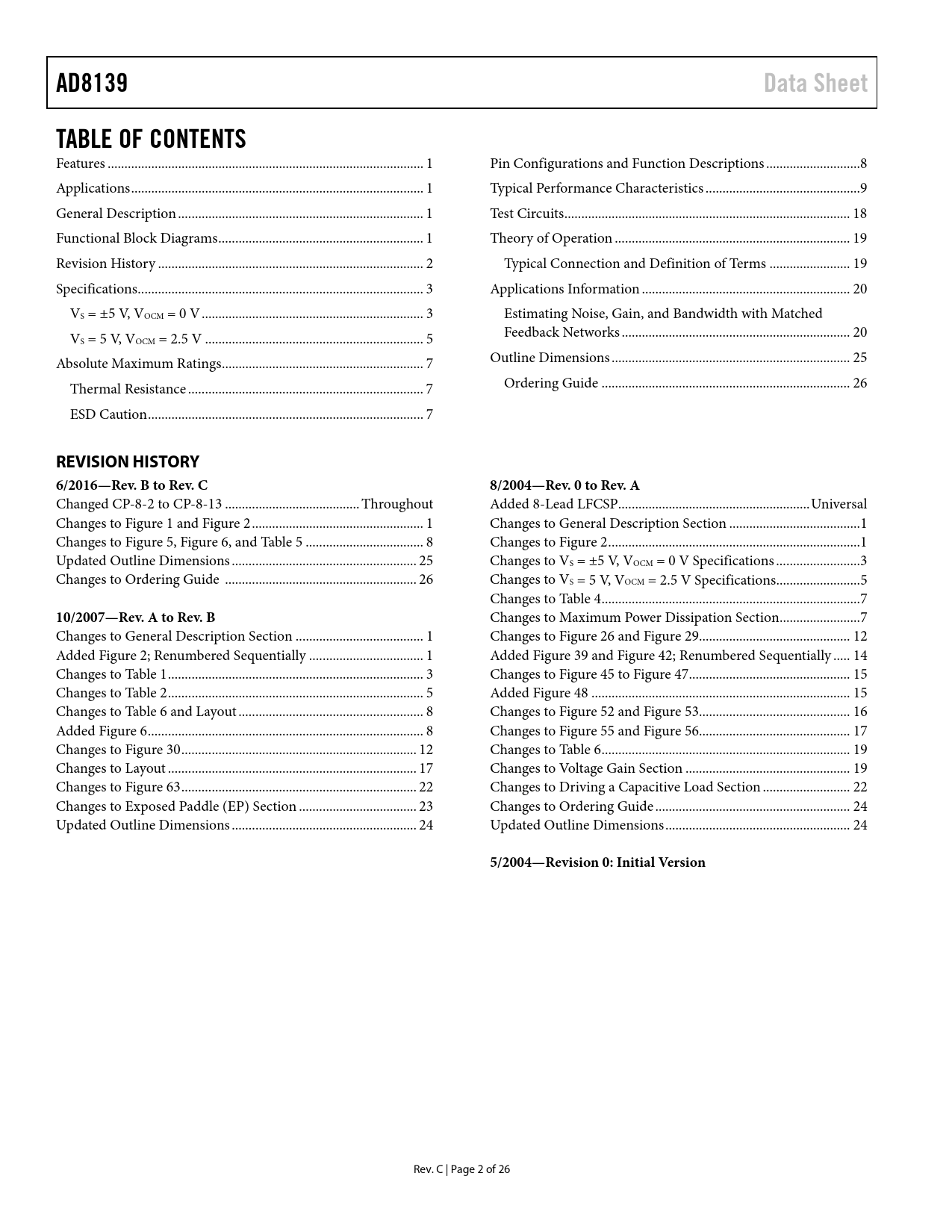 link to page 1 link to page 1 link to page 1 link to page 1 link to page 3 link to page 4 link to page 4 link to page 6 link to page 8 link to page 8 link to page 8 link to page 9 link to page 10 link to page 19 link to page 20 link to page 20 link to page 21 link to page 21 link to page 21 link to page 26 link to page 27 AD8139Data SheetTABLE OF CONTENTS Features .. 1 Pin Configurations and Function Descriptions ..8 Applications ... 1 Typical Performance Characteristics ..9 General Description ... 1 Test Circuits ... 18 Functional Block Diagrams ... 1 Theory of Operation .. 19 Revision History ... 2 Typical Connection and Definition of Terms .. 19 Specifications ... 3 Applications Information .. 20 VS = ±5 V, VOCM = 0 V .. 3 Estimating Noise, Gain, and Bandwidth with Matched V Feedback Networks .. 20 S = 5 V, VOCM = 2.5 V ... 5 Absolute Maximum Ratings .. 7 Outline Dimensions ... 25 Thermal Resistance .. 7 Ordering Guide .. 26 ESD Caution .. 7 REVISION HISTORY 6/2016—Rev. B to Rev. C8/2004—Rev. 0 to Rev. A Changed CP-8-2 to CP-8-13 .. Throughout Added 8-Lead LFCSP ... Universal Changes to Figure 1 and Figure 2 ... 1 Changes to General Description Section ... 1 Changes to Figure 5, Figure 6, and Table 5 ... 8 Changes to Figure 2 ... 1 Updated Outline Dimensions ... 25 Changes to VS = ±5 V, VOCM = 0 V Specifications ... 3 Changes to Ordering Guide ... 26 Changes to VS = 5 V, VOCM = 2.5 V Specifications ... 5 Changes to Table 4 ... 7 10/2007—Rev. A to Rev. B Changes to Maximum Power Dissipation Section .. 7 Changes to General Description Section .. 1 Changes to Figure 26 and Figure 29... 12 Added Figure 2; Renumbered Sequentially .. 1 Added Figure 39 and Figure 42; Renumbered Sequentially ... 14 Changes to Table 1 .. 3 Changes to Figure 45 to Figure 47 .. 15 Changes to Table 2 .. 5 Added Figure 48 ... 15 Changes to Table 6 and Layout ... 8 Changes to Figure 52 and Figure 53... 16 Added Figure 6 .. 8 Changes to Figure 55 and Figure 56... 17 Changes to Figure 30 .. 12 Changes to Table 6 .. 19 Changes to Layout .. 17 Changes to Voltage Gain Section ... 19 Changes to Figure 63 .. 22 Changes to Driving a Capacitive Load Section .. 22 Changes to Exposed Paddle (EP) Section ... 23 Changes to Ordering Guide .. 24 Updated Outline Dimensions ... 24 Updated Outline Dimensions ... 24 5/2004—Revision 0: Initial Version Rev. C | Page 2 of 26 Document Outline FEATURES APPLICATIONS GENERAL DESCRIPTION FUNCTIONAL BLOCK DIAGRAMS TABLE OF CONTENTS REVISION HISTORY SPECIFICATIONS VS = ±5 V, VOCM = 0 V VS = 5 V, VOCM = 2.5 V ABSOLUTE MAXIMUM RATINGS THERMAL RESISTANCE Maximum Power Dissipation ESD CAUTION PIN CONFIGURATIONS AND FUNCTION DESCRIPTIONS TYPICAL PERFORMANCE CHARACTERISTICS TEST CIRCUITS THEORY OF OPERATION TYPICAL CONNECTION AND DEFINITION OF TERMS Output Balance APPLICATIONS INFORMATION ESTIMATING NOISE, GAIN, AND BANDWIDTH WITH MATCHED FEEDBACK NETWORKS Estimating Output Noise Voltage Voltage Gain Feedback Factor Notation Input Common-Mode Voltage Calculating Input Impedance Input Common-Mode Swing Considerations Bandwidth vs. Closed-Loop Gain Estimating DC Errors Other Impact of Mismatches in the Feedback Networks Driving a Capacitive Load Layout Considerations Terminating a Single-Ended Input Exposed Paddle (EP) OUTLINE DIMENSIONS ORDERING GUIDE