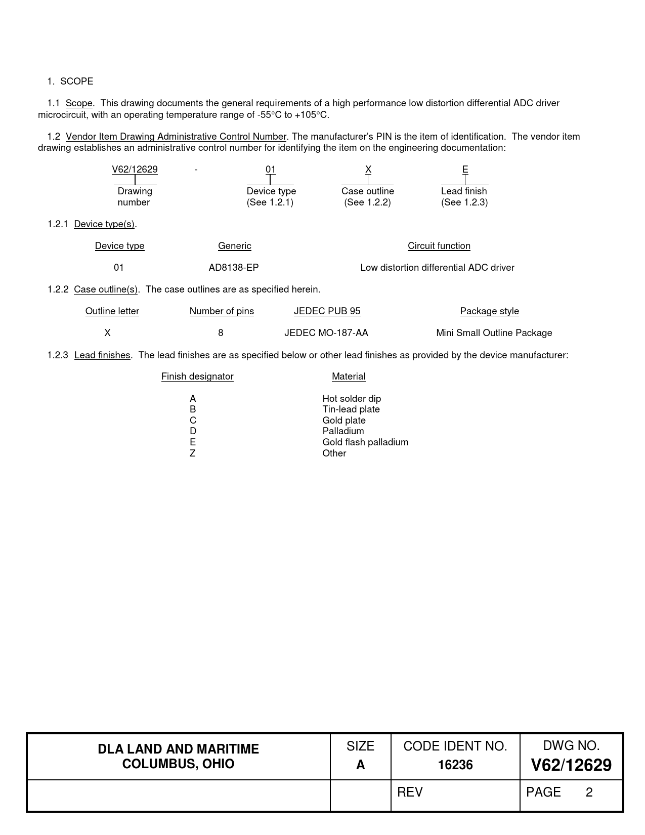 1. SCOPE 1.1 Scope. This drawing documents the general requirements of a high performance low distortion differential ADC driver microcircuit, with an operating temperature range of -55°C to +105°C. 1.2 Vendor Item Drawing Administrative Control Number. The manufacturer’s PIN is the item of identification. The vendor item drawing establishes an administrative control number for identifying the item on the engineering documentation: V62/12629 - 01 X E Drawing Device type Case outline Lead finish number (See 1.2.1) (See 1.2.2) (See 1.2.3) 1.2.1 Device type(s). Device type Generic Circuit function 01 AD8138-EP Low distortion differential ADC driver 1.2.2 Case outline(s). The case outlines are as specified herein. Outline letter Number of pins JEDEC PUB 95 Package style X 8 JEDEC MO-187-AA Mini Small Outline Package 1.2.3 Lead finishes. The lead finishes are as specified below or other lead finishes as provided by the device manufacturer: Finish designator Material A Hot solder dip B Tin-lead plate C Gold plate D Palladium E Gold flash palladium Z Other DLA LAND AND MARITIME SIZE CODE IDENT NO. DWG NO. COLUMBUS, OHIOA16236V62/12629 REV PAGE 2 Document Outline DESCRIPTION REV REV PMIC N/A TITLE SIZE A V62/12629 REV