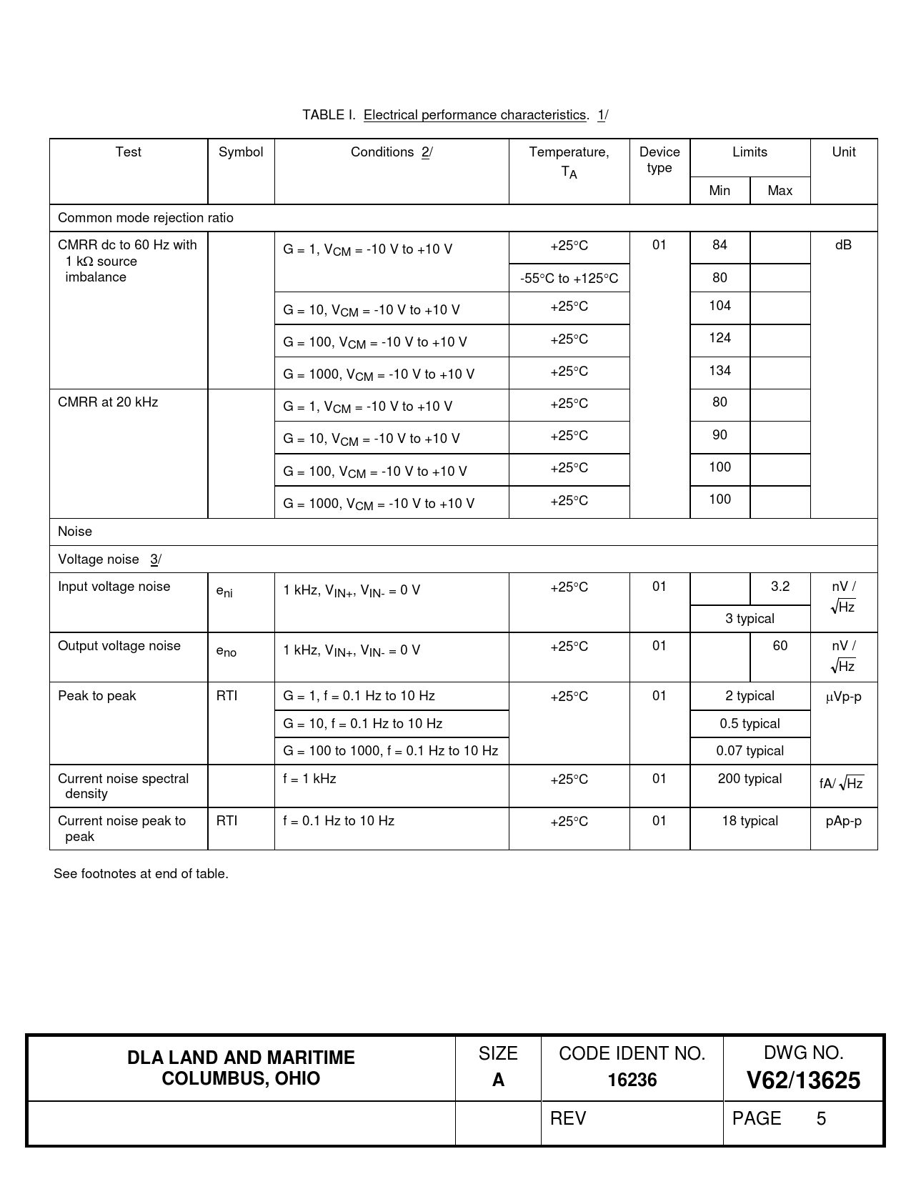 TABLE I. Electrical performance characteristics. 1/ Test Symbol Conditions 2/ Temperature, Device Limits Unit T type A Min Max Common mode rejection ratio CMRR dc to 60 Hz with G = 1, VCM = -10 V to +10 V +25°C 01 84 dB 1 kΩ source imbalance -55°C to +125°C 80 G = 10, VCM = -10 V to +10 V +25°C 104 G = 100, VCM = -10 V to +10 V +25°C 124 G = 1000, VCM = -10 V to +10 V +25°C 134 CMRR at 20 kHz G = 1, VCM = -10 V to +10 V +25°C 80 G = 10, VCM = -10 V to +10 V +25°C 90 G = 100, VCM = -10 V to +10 V +25°C 100 G = 1000, VCM = -10 V to +10 V +25°C 100 Noise Voltage noise 3/ Input voltage noise eni 1 kHz, VIN+, VIN- = 0 V +25°C 01 3.2 nV / Hz 3 typical Output voltage noise eno 1 kHz, VIN+, VIN- = 0 V +25°C 01 60 nV / Hz Peak to peak RTI G = 1, f = 0.1 Hz to 10 Hz +25°C 01 2 typical µVp-p G = 10, f = 0.1 Hz to 10 Hz 0.5 typical G = 100 to 1000, f = 0.1 Hz to 10 Hz 0.07 typical Current noise spectral f = 1 kHz +25°C 01 200 typical fA/ Hz density Current noise peak to RTI f = 0.1 Hz to 10 Hz +25°C 01 18 typical pAp-p peak See footnotes at end of table.