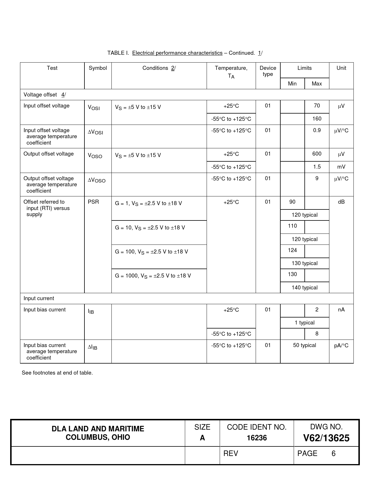 TABLE I. Electrical performance characteristics – Continued. 1/ Test Symbol Conditions 2/ Temperature, Device Limits Unit T type A Min Max Voltage offset 4/ Input offset voltage VOSI VS = ±5 V to ±15 V +25°C 01 70 µV -55°C to +125°C 160 Input offset voltage ∆VOSI -55°C to +125°C 01 0.9 µV/°C average temperature coefficient Output offset voltage VOSO VS = ±5 V to ±15 V +25°C 01 600 µV -55°C to +125°C 1.5 mV Output offset voltage ∆VOSO -55°C to +125°C 01 9 µV/°C average temperature coefficient Offset referred to PSR G = 1, VS = ±2.5 V to ±18 V +25°C 01 90 dB input (RTI) versus supply 120 typical G = 10, VS = ±2.5 V to ±18 V 110 120 typical G = 100, VS = ±2.5 V to ±18 V 124 130 typical G = 1000, VS = ±2.5 V to ±18 V 130 140 typical Input current Input bias current IIB +25°C 01 2 nA 1 typical -55°C to +125°C 8 Input bias current ∆IIB -55°C to +125°C 01 50 typical pA/°C average temperature coefficient See footnotes at end of table.