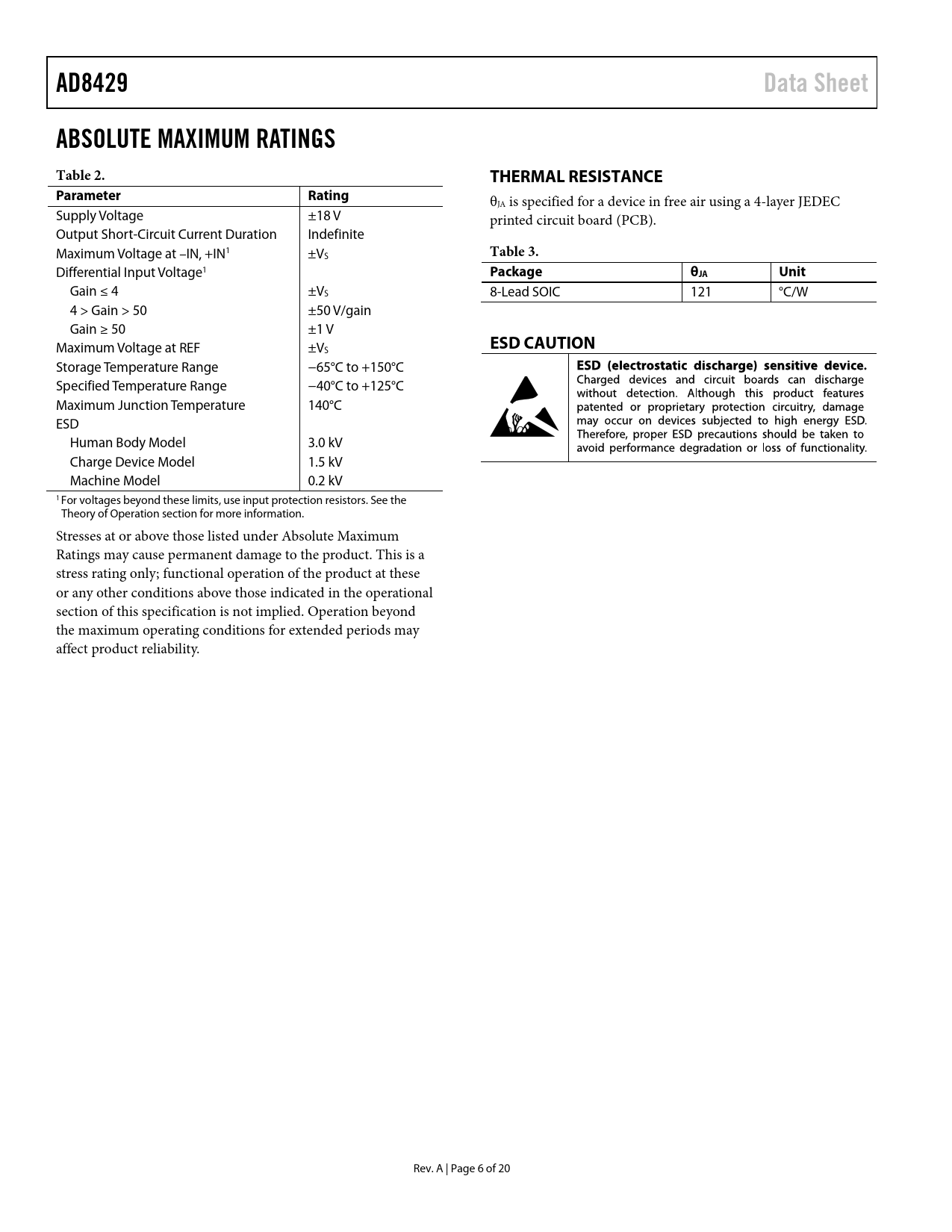 AD8429 Data Sheet ABSOLUTE MAXIMUM RATINGS Table 2 THERMAL RESISTANCE Parameter Rating Table 3 Package θJA Unit ESD CAUTION